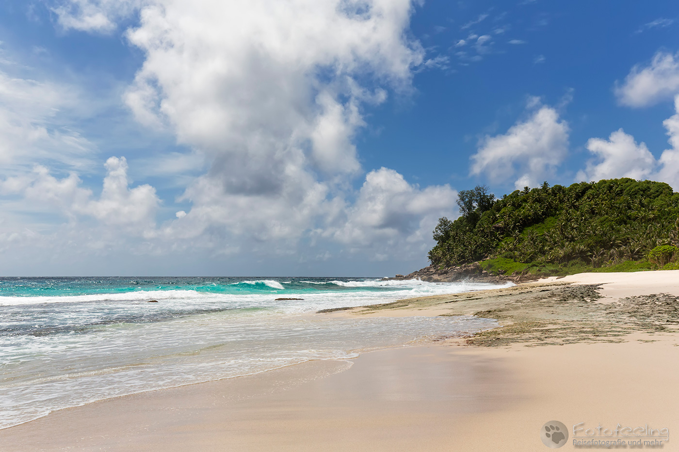 Jedenfalls kamen wir so durchgeschwitzt wie noch nie in unserem Leben am Anse Cocos an, der sogleich unser Herz eroberte. Meinen Rücken zierten zwar Schlammspuren bis hoch zum Genick, aber es war ja alles waschbar. Der anstrengende Weg war schnell vergessen und wir erkunden die Bucht. Nur wenige Menschen hatten sich bis hierher gekämpft und so waren wir am Nachmittag relativ alleine dort. Die Bucht war wieder etwas größer und auch hier krachten riesige Wellen an den Strand. Wieder warnten große Schilder vor gefährlichen Strömungen. Wir breiteten unsere Handtücher aus und gingen ins warme Wasser. Durch den anstrengenden Weg wirkte es sogar leicht erfrischend auf uns und wir sprangen in die großen Wellen. Was für eine Wohltat!. Mein Shirt war auch schnell ausgewaschen und der laue Wind trocknete es vorzüglich. Danach erkundeten wir noch die restliche Bucht und entdeckten am Ende wunderschöne Felsen im Wasser und eine tolle Fotopalme am Strand.