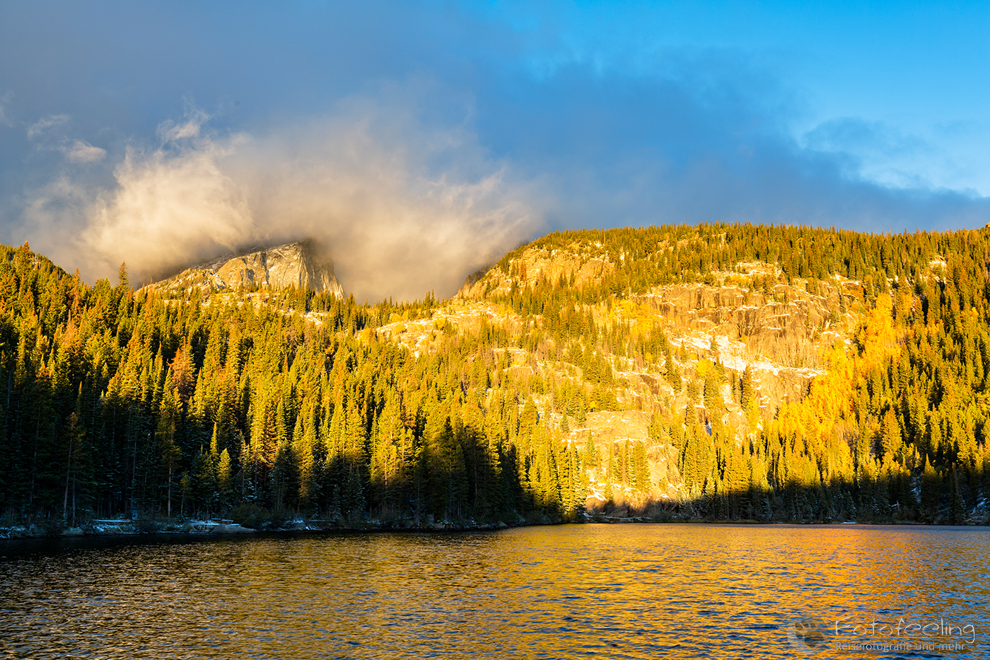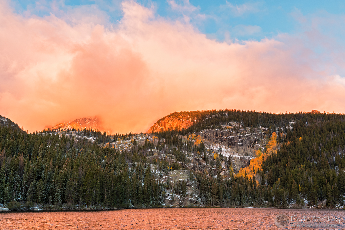 Um 6.00 Uhr morgens standen wir fröstelnd bei knapp unter 0 °C auf. Auf der Campsite herrschte schon geschäftiges Treiben und wir waren bei weitem nicht die Ersten. Viele Autos fuhren schon los. Wir brauchten jedoch nicht lange und machten uns auf den Weg zum Bear Lake, wo wir den Sonnenaufgang verbringen wollten. Es wurde immer kälter und so schneite es bzw. hatte Frost, was wir dank dem heftigen Wind umso stärker zu spüren bekamen. Trotzdem war der Sonnenaufgang am See wunderschön. Die Berge lagen in dichten Wolken und der Wind peitschte über das Wasser. Schneeflocken tanzten um unsere Köpfe. Doch das Licht verzauberte uns, denn anfangs kam die Sonne heraus und die Berge mit ihren Wolkenmützen fingen an, orange zu leuchten. Das war unbeschreiblich schön, trotz klammer Finger und schmerzenden Gesichtern. Auch hier war schon viel los. Wanderer machten sich auf den Weg und mit uns waren einige andere Fotografen da und genossen das Schauspiel. Wir blieben bis ca. 7.00 Uhr, dann zog es zu und wir fuhren langsam aus dem Park.