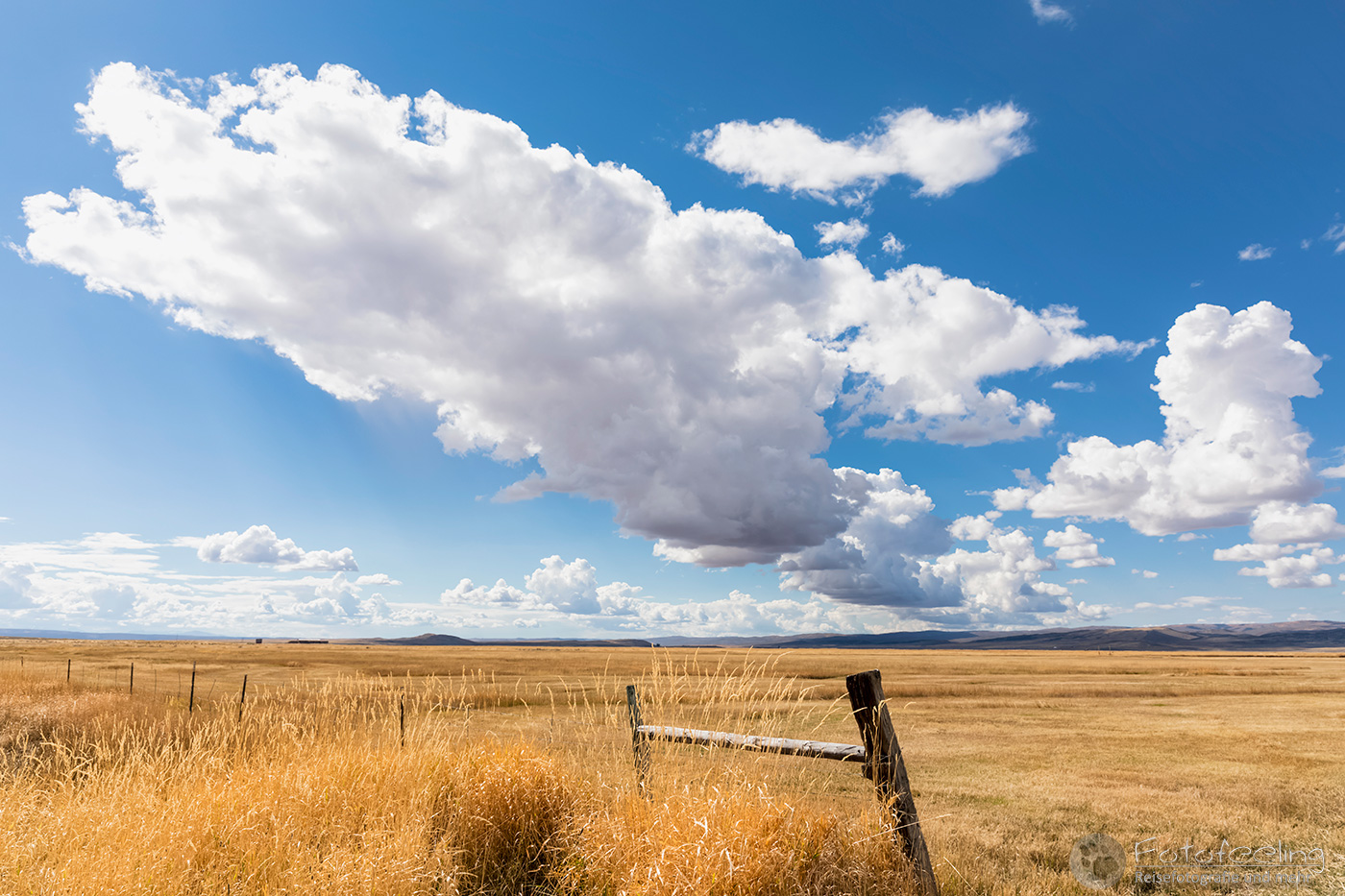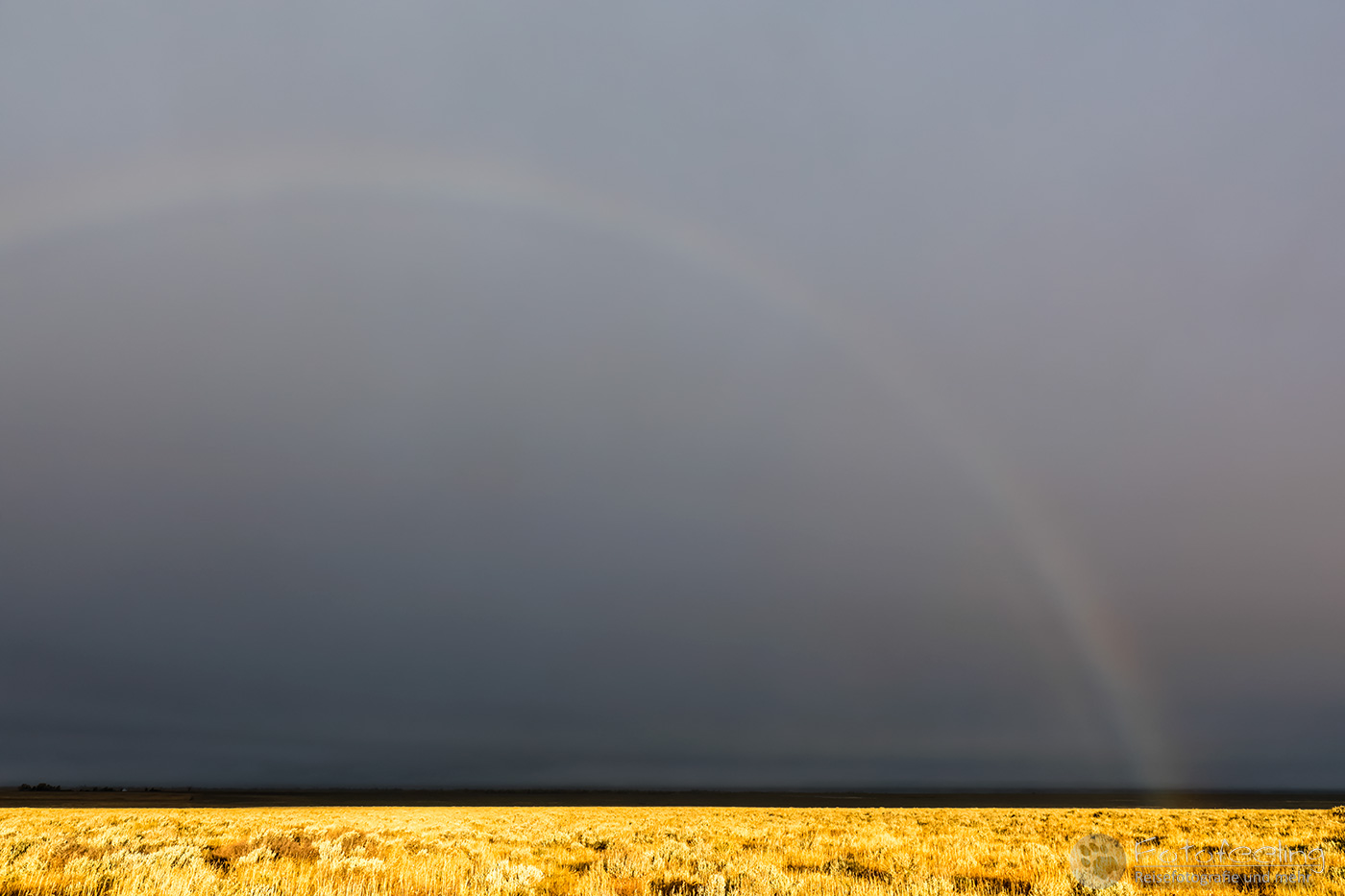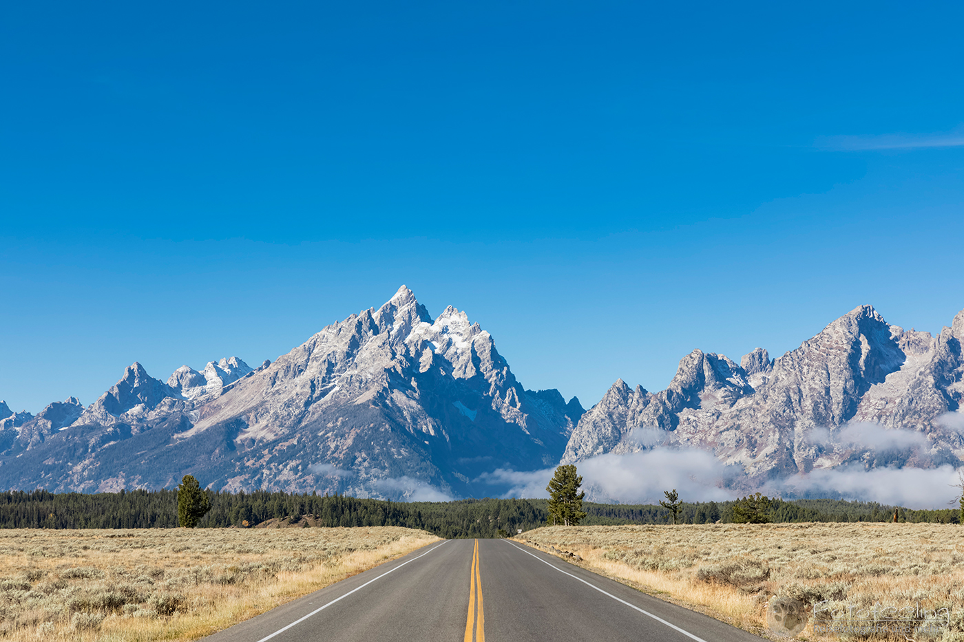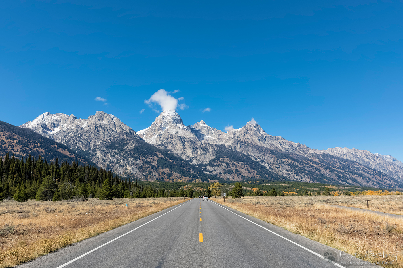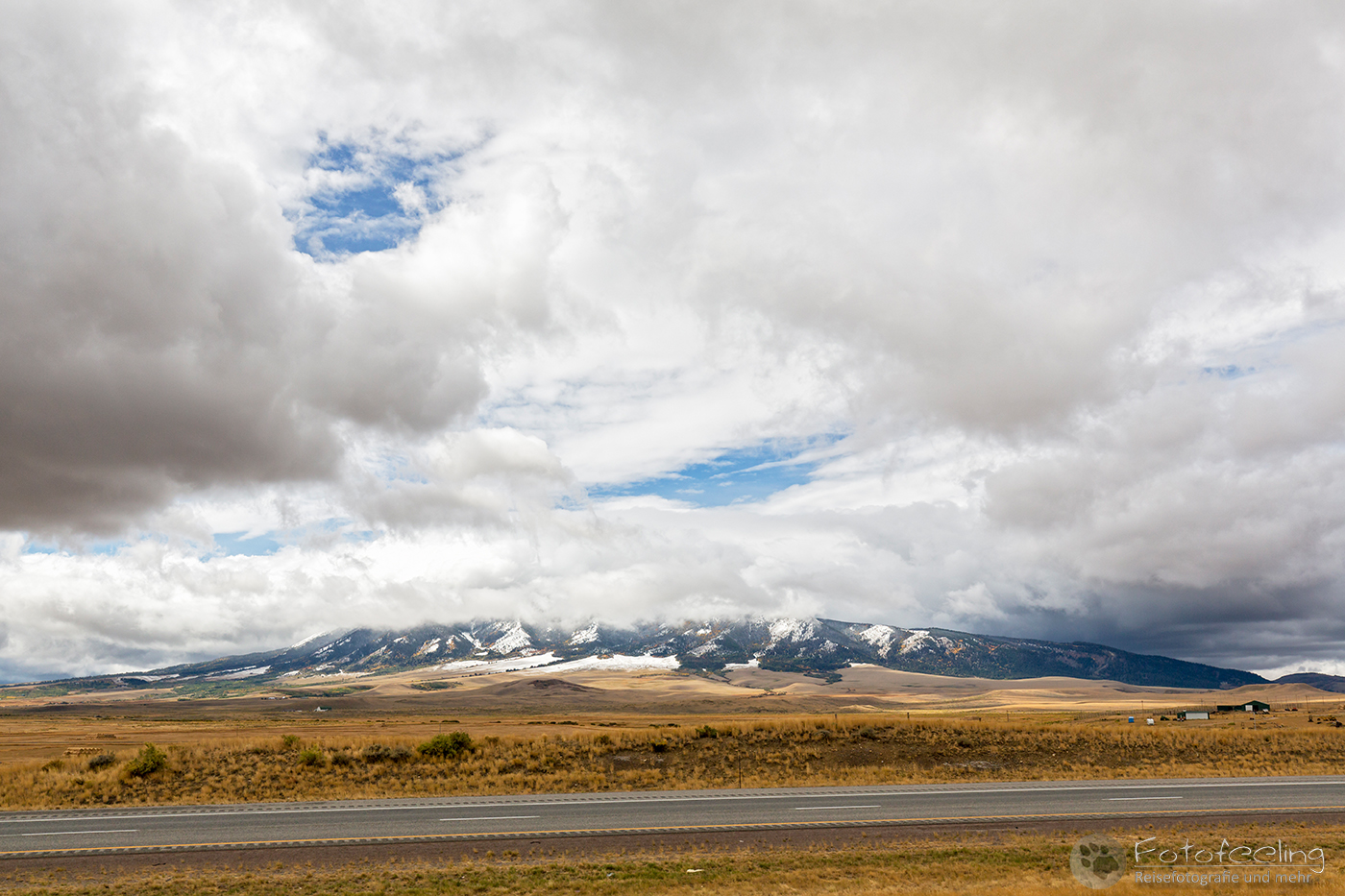 Bei einem Starbucks in Estes Park gab es dann Lebenselixier und warme Kuchenteilchen, die hervorragend schmeckten und uns wieder aufwärmten. Als wir uns etwas von den Rockies entfernt hatten, verzogen sich auch die Wolken und der Himmel wurde blau. Wir folgten der Straße, die hier draußen viel einsamer war, als um Denver herum und näherten uns langsam unserem Ziel, dem Grand Teton Nationalpark. Doch je näher wir kamen, desto schlechter wurde das Wetter. Bei 3 °C und Regen arbeiteten die Scheibenwischer auf Hochtouren, wieder fegten Windböen über die Straßen und die Bäume bogen sich. Das Gras war herbstlich gelb und auch die Bäume hatten zum Teil schon ihr Herbstkleid an. Immer wieder sahen wir Pronghorns-zu Deutsch Gabelböcke (Antilocapra americana) auf den Feldern grasen.