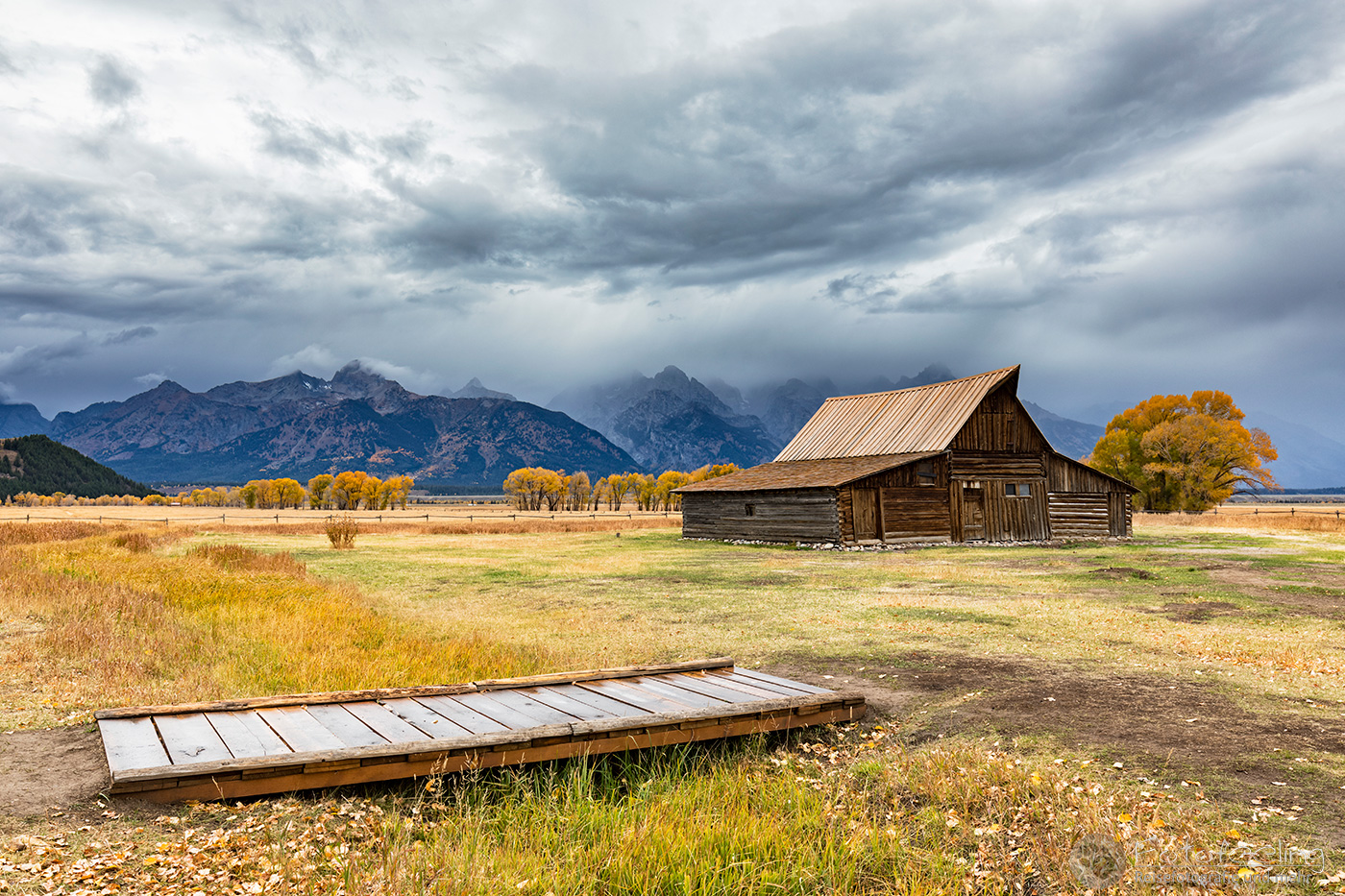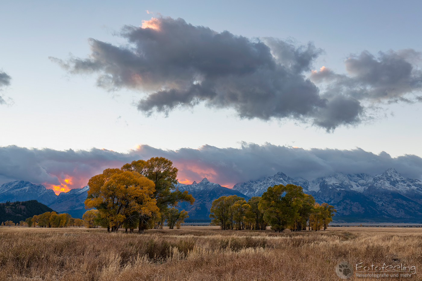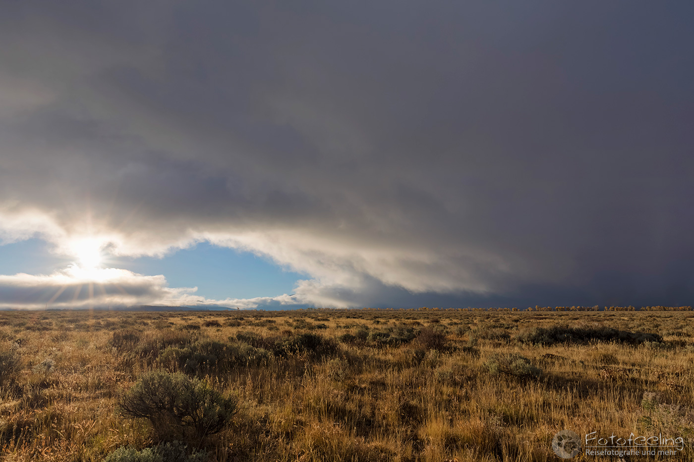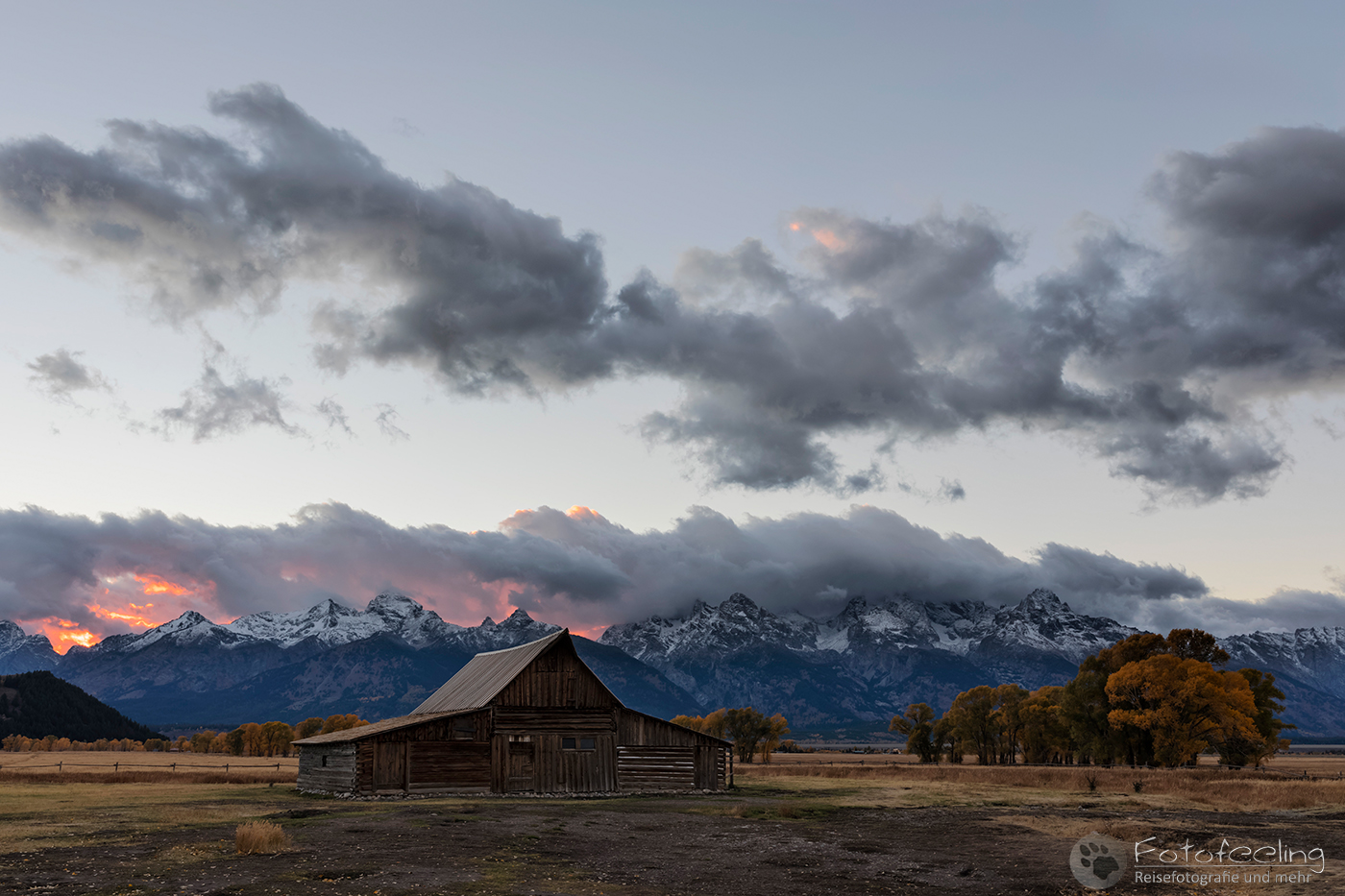 Unterwegs kauften wir noch im Walmart für den heutigen Tag ein. Laut unserer Satelliten Wettervorhersagen hätten wir schon längst unter der Schlechtwetterfront durch sein müssen, aber es regnete immer noch und die Ausläufer des Unwetters schienen uns zu begleiten. Na, das konnte ja heiter werden… Dafür wurde die Landschaft immer herbstlicher. Eigentlich hätte der Peak der Laubfärbung in diesem Gebiet erst Ende September sein sollen, aber dieses Jahr hatte die Laubverfärbung schon viel eher eingesetzt. So hatten wir schon Angst, dass wir zu spät dran wären. Aber dem war nicht so. Wunderschön standen die Laubbäume in voller Pracht vor uns. Je näher wir den Tetons kamen, desto schöner und gelber wurden sie. Zum Glück hängten wir auch das schlechte Wetter ganz gut ab und kamen gerade rechtzeitig zum späten Licht am Moulton Barn vor der Teton Range an. An den Bergen klebten noch die Reste der Schlechtwetterwolken und gaben ein dramatisches Bild ab, während im Vordergrund der Moulton Barn vor den schönsten Laubbäumen steht. Es war wunderschön!