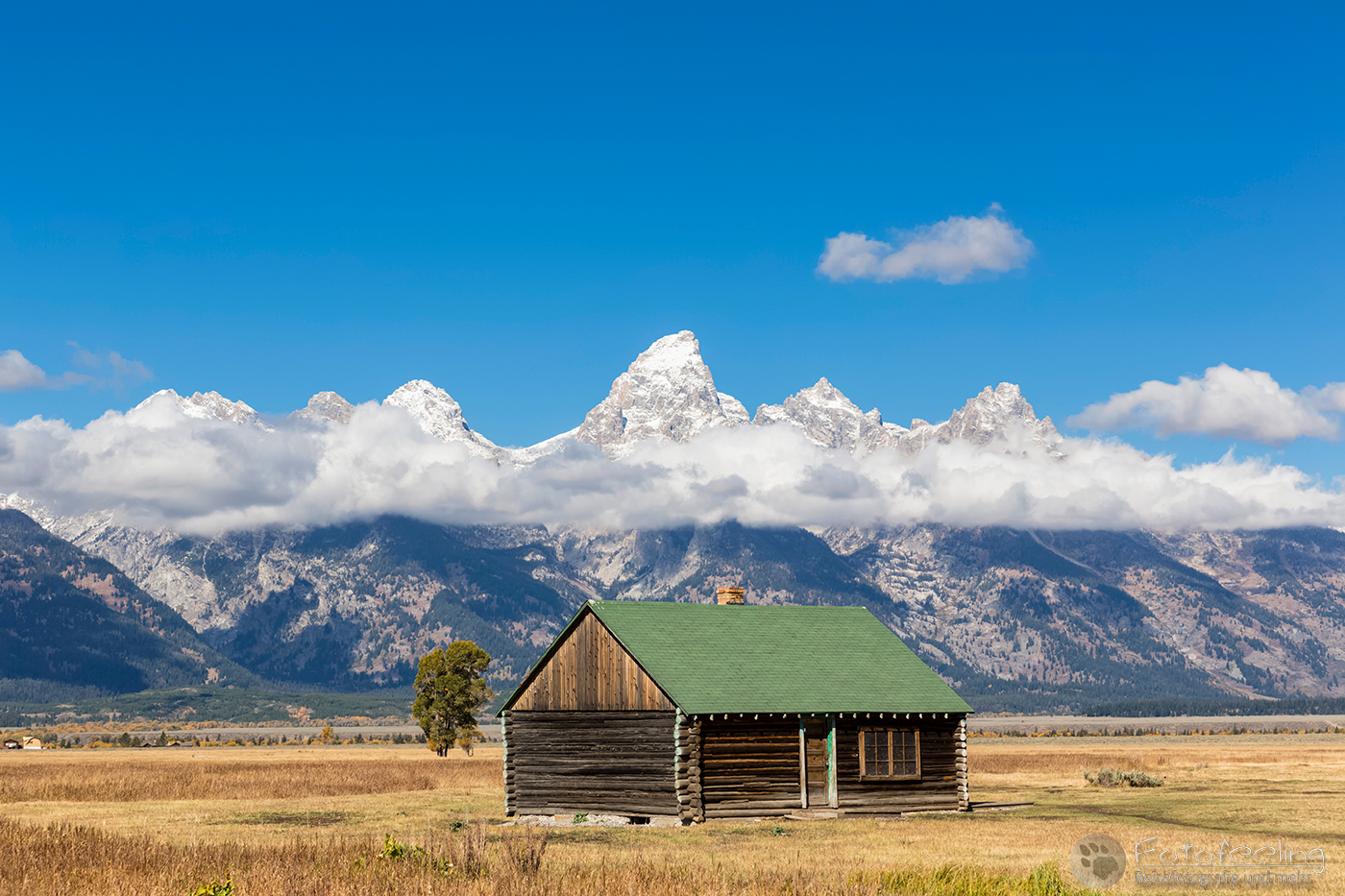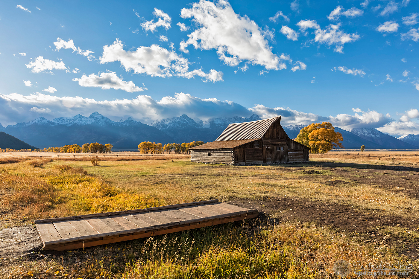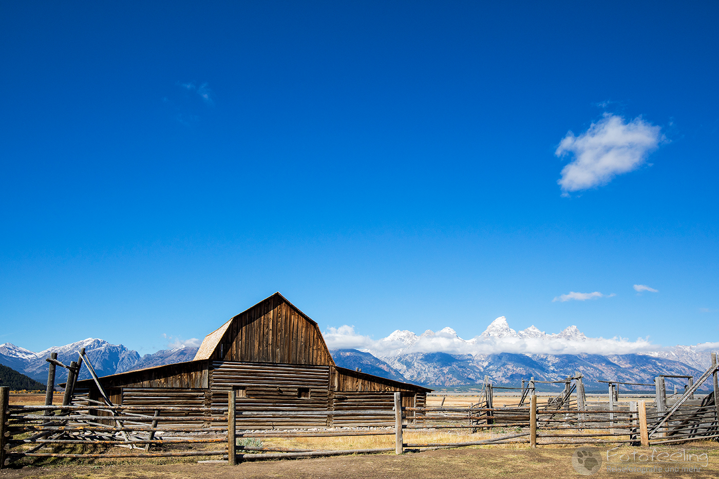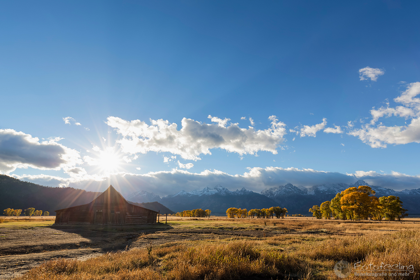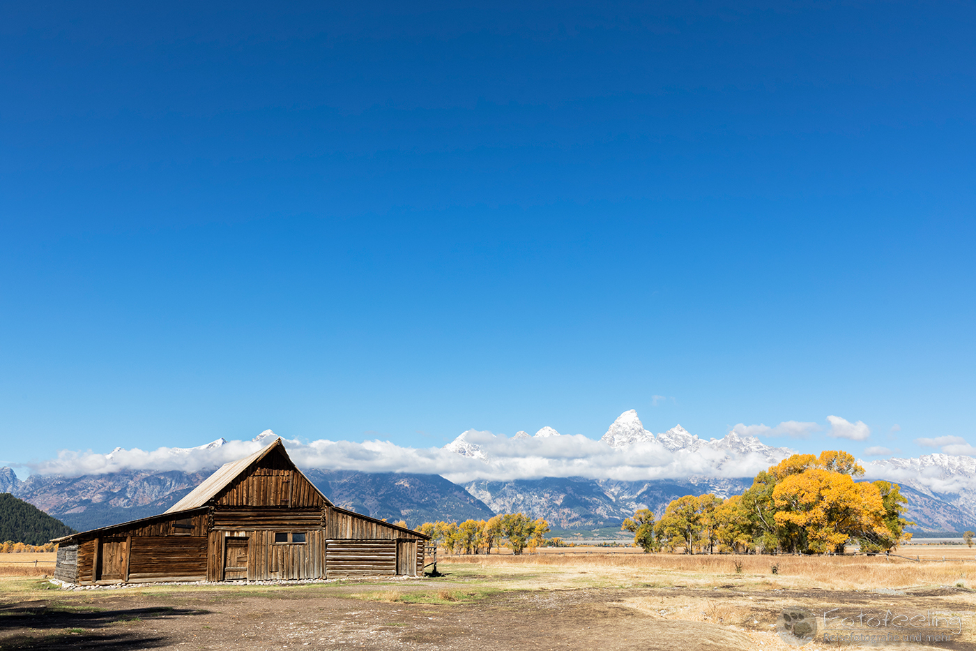Unterwegs kauften wir noch im Walmart für den heutigen Tag ein. Laut unserer Satelliten Wettervorhersagen hätten wir schon längst unter der Schlechtwetterfront durch sein müssen, aber es regnete immer noch und die Ausläufer des Unwetters schienen uns zu begleiten. Na, das konnte ja heiter werden… Dafür wurde die Landschaft immer herbstlicher. Eigentlich hätte der Peak der Laubfärbung in diesem Gebiet erst Ende September sein sollen, aber dieses Jahr hatte die Laubverfärbung schon viel eher eingesetzt. So hatten wir schon Angst, dass wir zu spät dran wären. Aber dem war nicht so. Wunderschön standen die Laubbäume in voller Pracht vor uns. Je näher wir den Tetons kamen, desto schöner und gelber wurden sie. Zum Glück hängten wir auch das schlechte Wetter ganz gut ab und kamen gerade rechtzeitig zum späten Licht am Moulton Barn vor der Teton Range an. An den Bergen klebten noch die Reste der Schlechtwetterwolken und gaben ein dramatisches Bild ab, während im Vordergrund der Moulton Barn vor den schönsten Laubbäumen steht. Es war wunderschön!