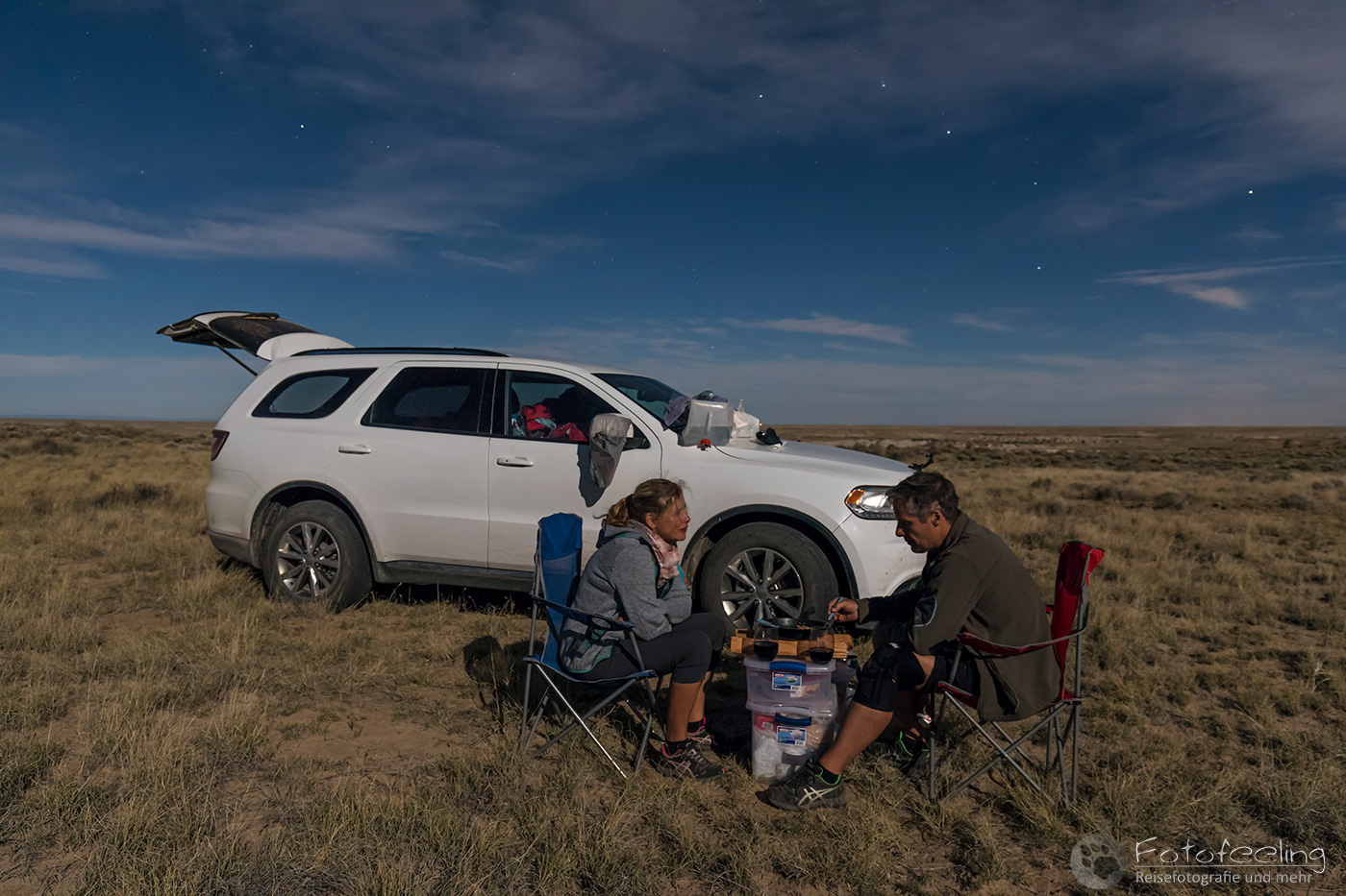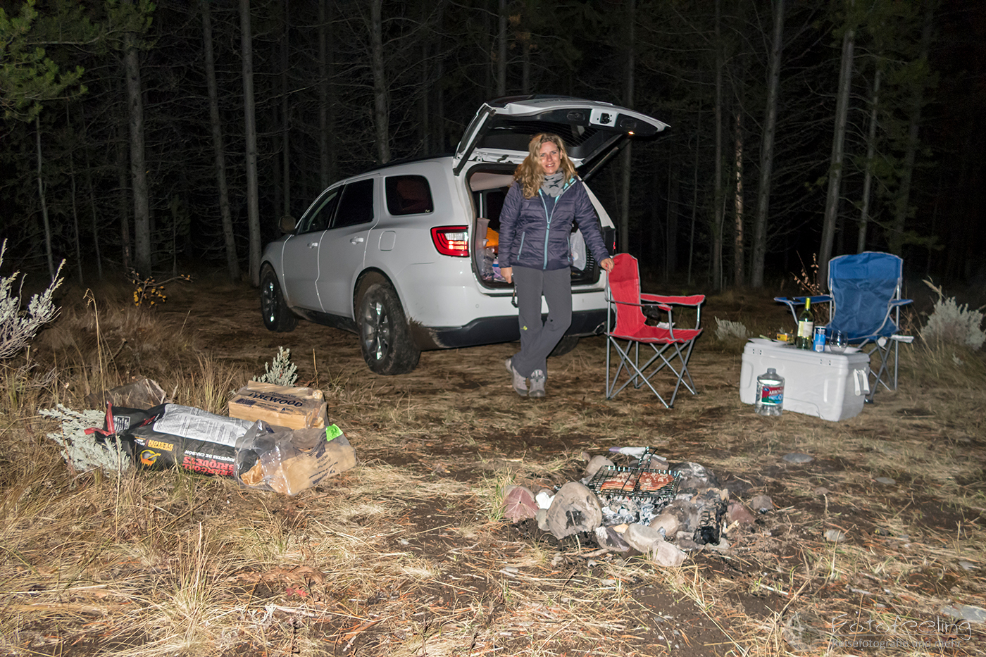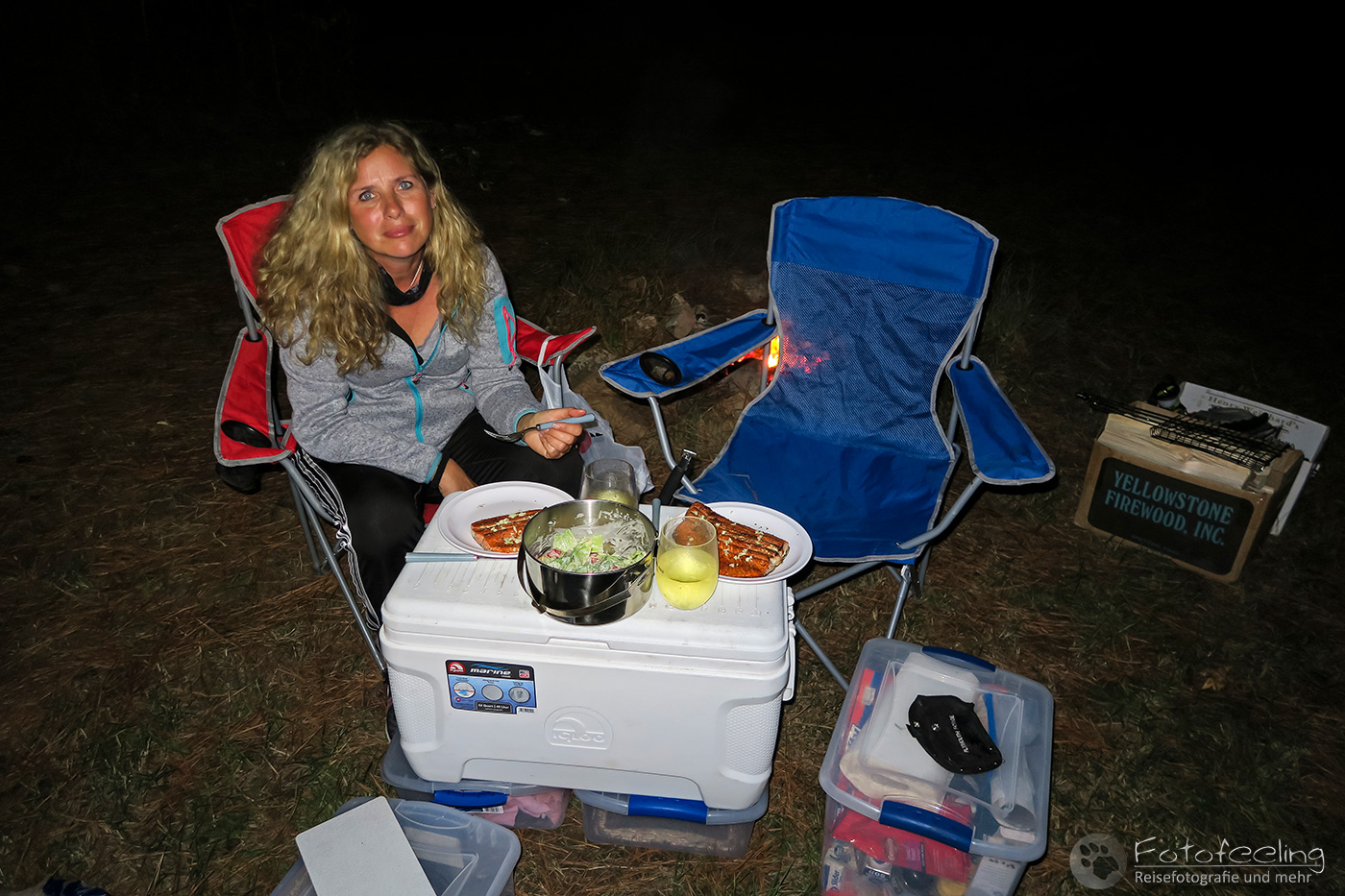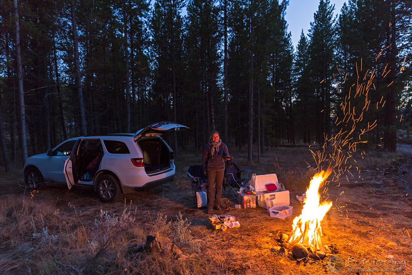 Im Dunkeln fuhren wir also auf der Hauptstraße zur Triangle X Ranch und suchten uns den Weg, den Berg hinauf. Dort sollte die „wilde“ Campsite sein. Nachdem wir uns erst auf der Ranch verfahren hatten, fanden wir schließlich den richtigen Weg und fuhren langsam den Berg hinauf. Auf einem Plateau war eine große Fläche BML Land, wo sich schon etliche Camper eingefunden hatten. Anfangs wollten wir uns auch dort hinstellen, aber dann entschieden wir uns für eine nette Nische im Wald, wo wir uns häuslich einrichteten. Chris machte gleich ein Feuer in einer angelegten Feuerstelle und wir weihten unsere neuen Stühle ein, die wir nah ans Feuer stellten, um uns zu wärmen. Wir grillten Lachs und genossen in unseren neuen Gläsern kühlen Weißwein, dazu knisterte das Feuer. Wir waren angekommen und in diesem Moment gab es keinen anderen Ort auf der Welt, an dem wir lieber gewesen wären. Dazu hallte von unseren Nachbarn sehr passend ZZ Top durch den Wald. Wir saßen noch lange draußen und genossen den Abend, ehe wir in unsere Schlafsäcke krochen.