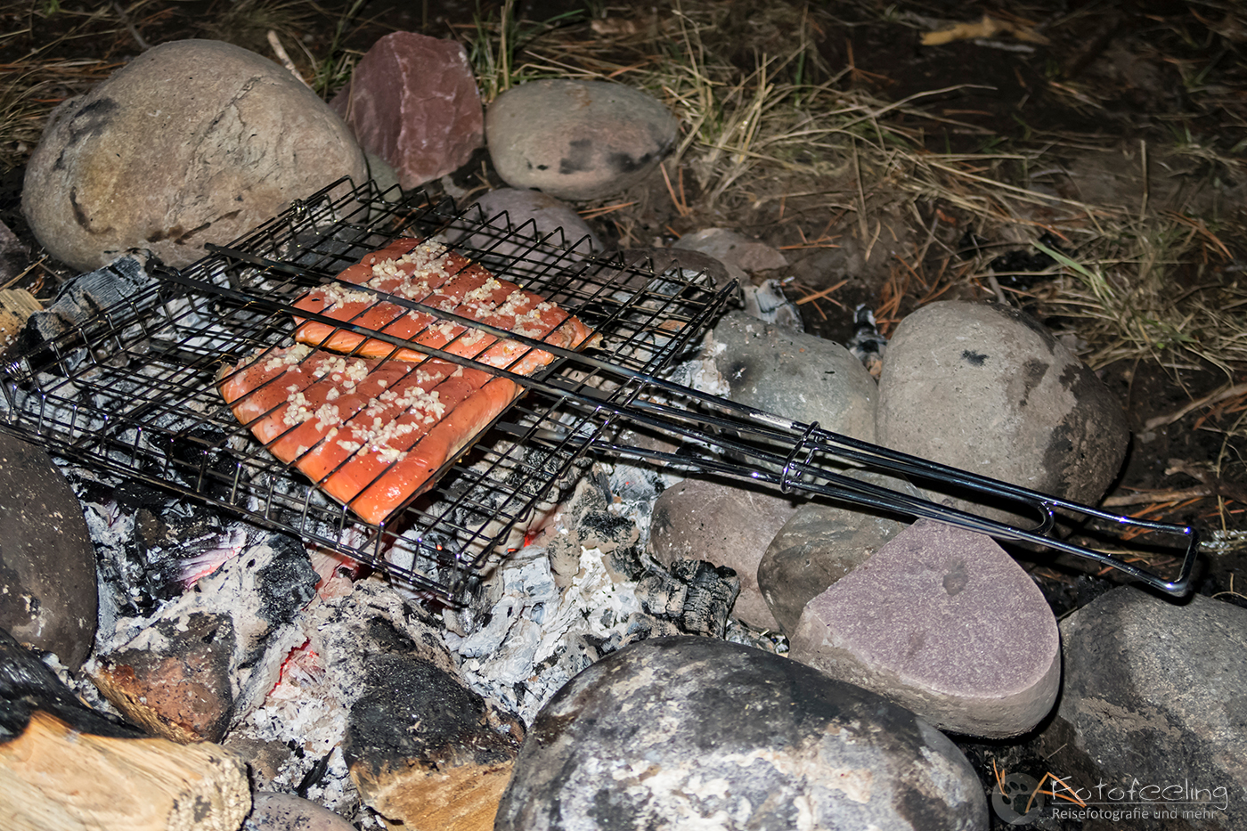 Mit dem Schwinden der Sonne gaben wir auch das Boot wieder ab und fuhren zurück auf unsere Campsite. Hier grillten wir Fisch und saßen noch lange am Lagerfeuer, dass wir mit Tannzapfen befeuerten. Da es schon am Abend sehr kühl wurde, machten wir uns auf eine kalte Nacht gefasst, aber unsere Schlafsäcke waren zum Glück kuschlig warm. Einzig der laut hupende Zug störte etwas die Idylle.