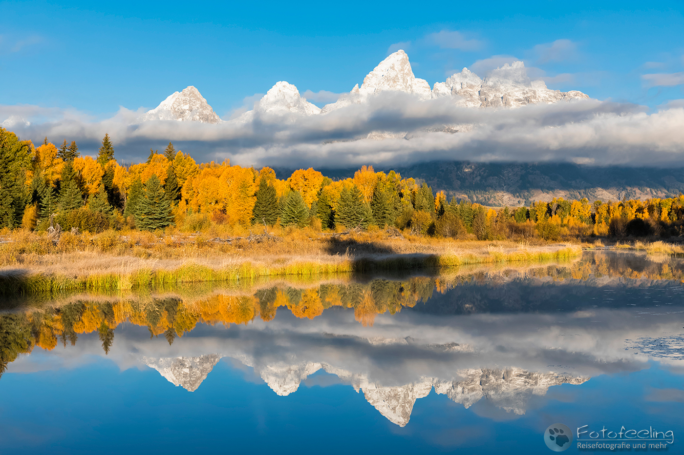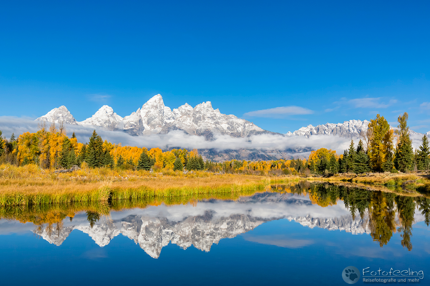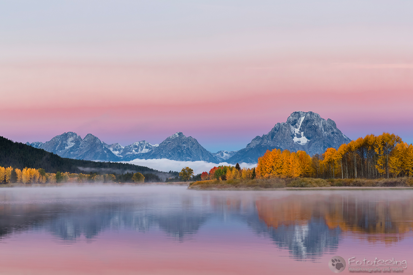 Als wir uns der schönsten Stelle näherten, waren hier Menschen über Menschen. Das war ja gar nichts für mich. Während Chris sich einen super guten Platz ergatterte und sich zwischen zwei amerikanischen Fotografen quetschte, ging ich langsam weiter nach hinten, wo ich mir etwas mehr Luft zum Atmen erhoffte. Unterwegs machte ich ein paar Bilder vom Flusslauf und patschte natürlich prompt in eine tiefe Pfütze. Na super, jetzt war auch noch mein Fuß pitschnass und das bei Minusgraden… Egal, der Weg zum Auto zurück war einfach zu weit und so ging ich weiter. Aber auch an der hinteren Stelle war unglaublich viel los. Hier stapelte sich eine chinesische Fotogruppe, aber zum Glück genau an einer Stelle und so konnte ich mich zwischen zwei andere Fotografen stellen und den Sonnenaufgang abwarten. Dichter Nebel hing an den Bergen und hüllte sie ein. Mit Sonnenaufgang lichtete sich kurz der Nebel und gab einen Blick auf die rotleuchtenden Berggipfel frei. Doch dann zog sich der Schleier wieder zu und verhüllte die Gipfel. So blieb es, bis es hell war, dann lichtete sich der Nebel und ein atemberaubender Herbstmorgen begann. Das Licht ließ das Gelb der Espen noch mehr leuchten, hinzu kamen der Nebel, der an den Bergen hing und die wunderschöne Spiegelung der Teton Range mit der Cathedral Group und natürlich dem höchsten Gipfel den Grand Teton (4199 m). An meinem Platz schwammen Biber vorbei und bis auf das Geschnatter der Chinesen war es idyllisch und fast schon mystisch mit dem Nebel und der Stimmung.