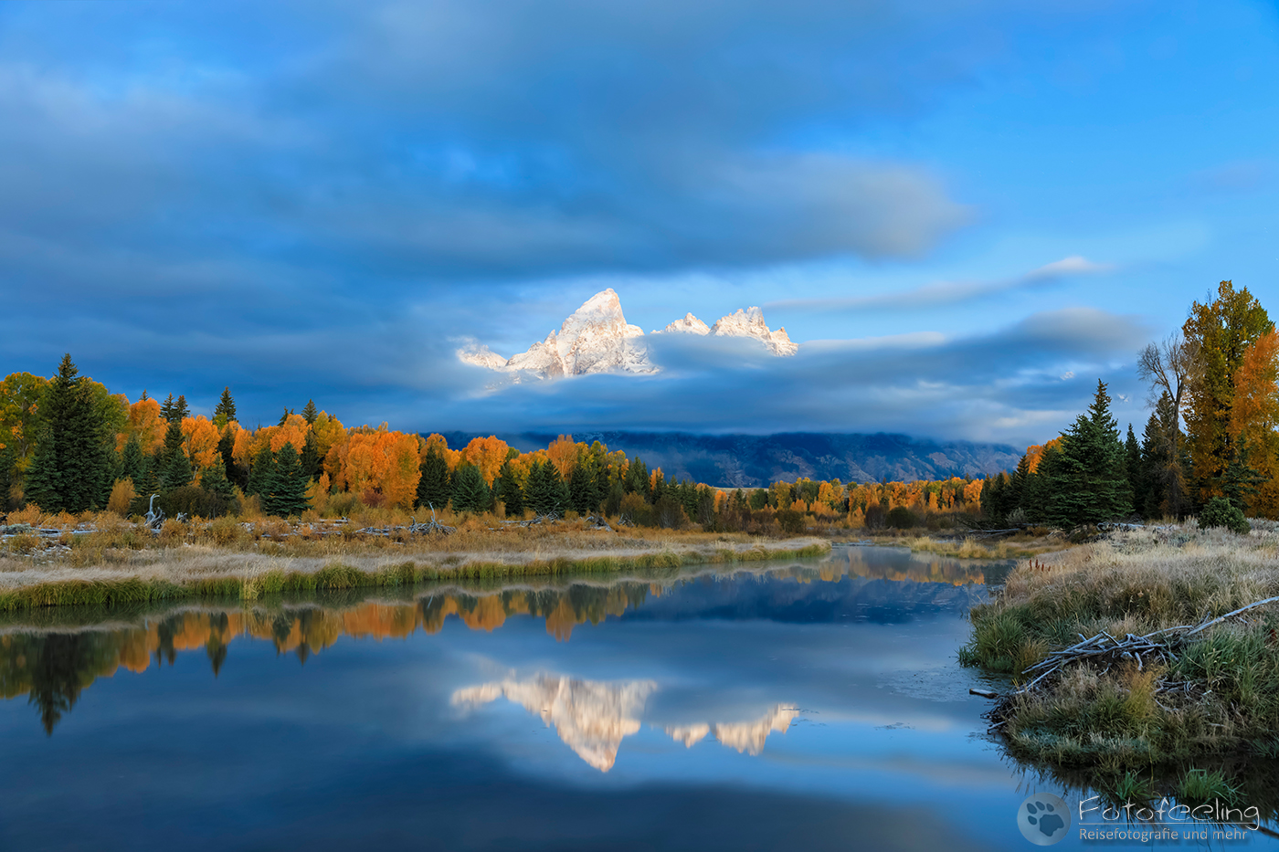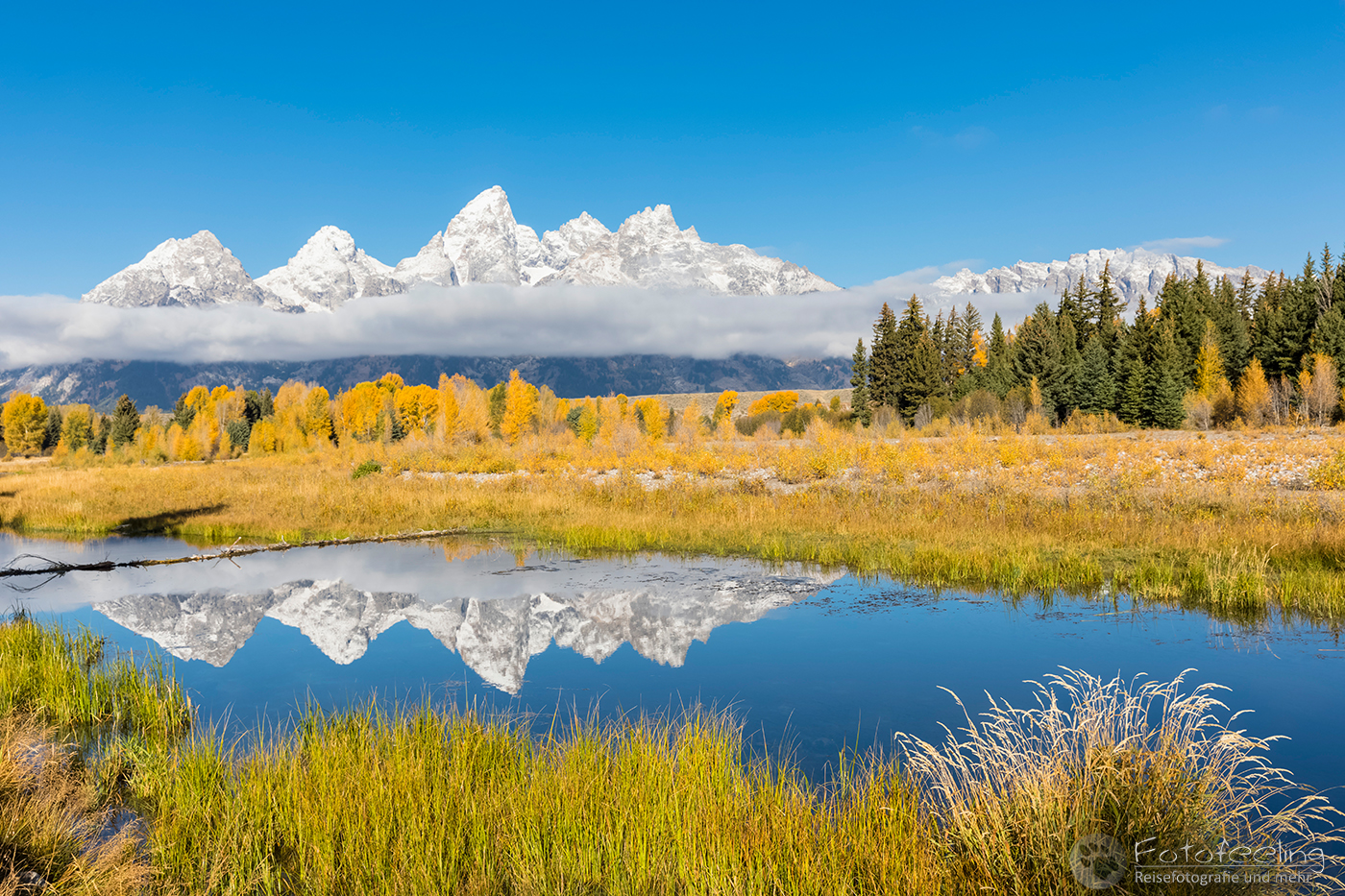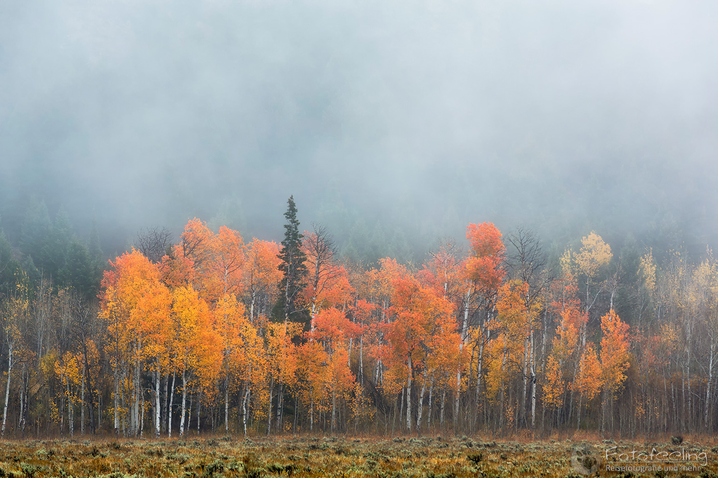 Als wir uns der schönsten Stelle näherten, waren hier Menschen über Menschen. Das war ja gar nichts für mich. Während Chris sich einen super guten Platz ergatterte und sich zwischen zwei amerikanischen Fotografen quetschte, ging ich langsam weiter nach hinten, wo ich mir etwas mehr Luft zum Atmen erhoffte. Unterwegs machte ich ein paar Bilder vom Flusslauf und patschte natürlich prompt in eine tiefe Pfütze. Na super, jetzt war auch noch mein Fuß pitschnass und das bei Minusgraden… Egal, der Weg zum Auto zurück war einfach zu weit und so ging ich weiter. Aber auch an der hinteren Stelle war unglaublich viel los. Hier stapelte sich eine chinesische Fotogruppe, aber zum Glück genau an einer Stelle und so konnte ich mich zwischen zwei andere Fotografen stellen und den Sonnenaufgang abwarten. Dichter Nebel hing an den Bergen und hüllte sie ein. Mit Sonnenaufgang lichtete sich kurz der Nebel und gab einen Blick auf die rotleuchtenden Berggipfel frei. Doch dann zog sich der Schleier wieder zu und verhüllte die Gipfel. So blieb es, bis es hell war, dann lichtete sich der Nebel und ein atemberaubender Herbstmorgen begann. Das Licht ließ das Gelb der Espen noch mehr leuchten, hinzu kamen der Nebel, der an den Bergen hing und die wunderschöne Spiegelung der Teton Range mit der Cathedral Group und natürlich dem höchsten Gipfel den Grand Teton (4199 m). An meinem Platz schwammen Biber vorbei und bis auf das Geschnatter der Chinesen war es idyllisch und fast schon mystisch mit dem Nebel und der Stimmung.