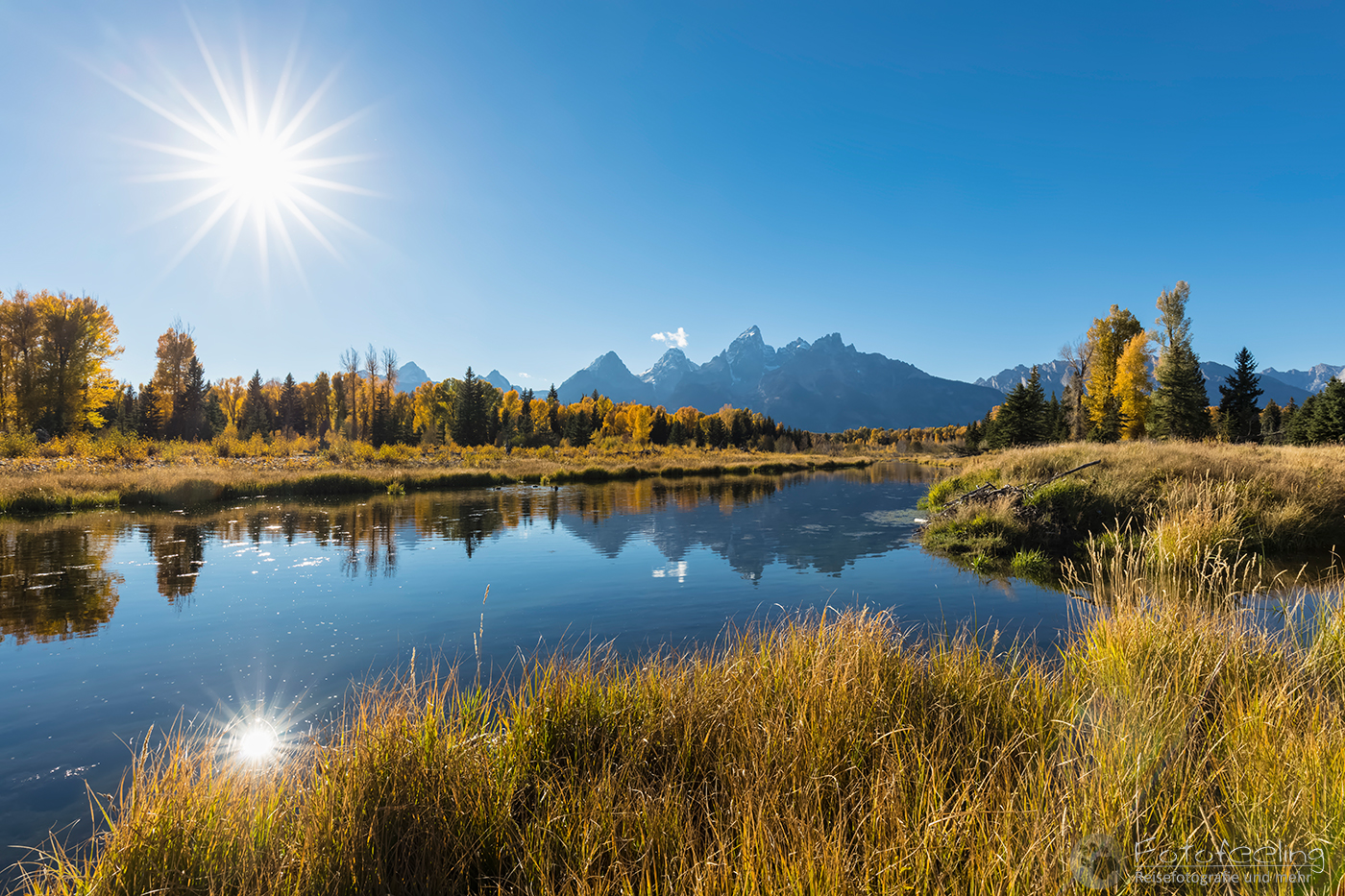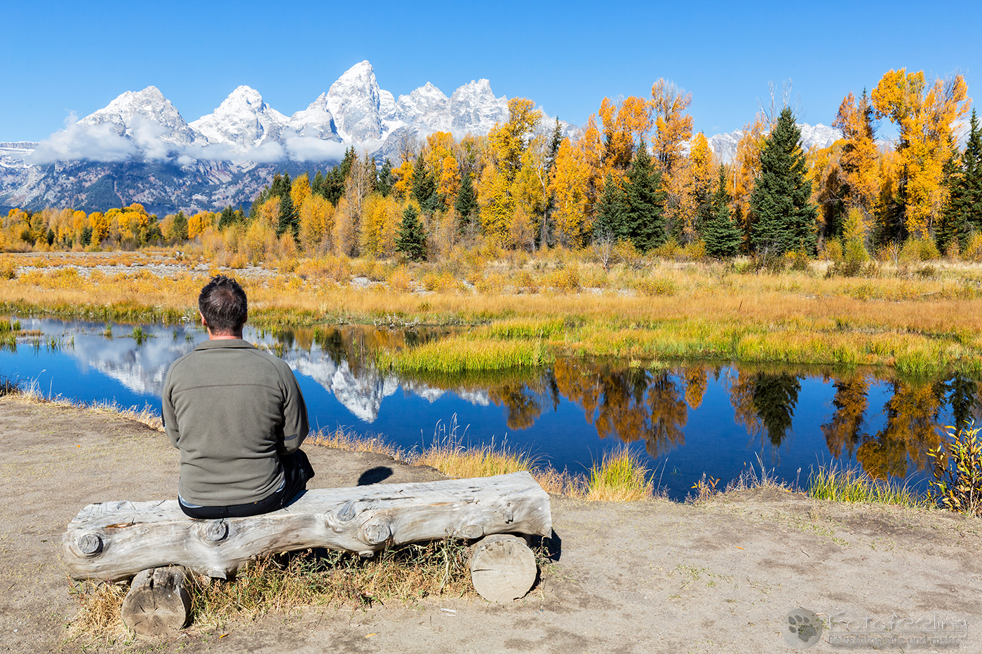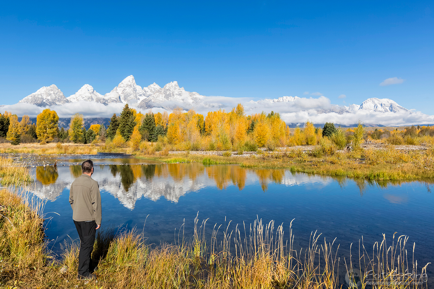 Wir fuhren jedoch nicht weit, sondern hielten gleich am nächsten Parkplatz. Diesmal wollten wir uns auch den Flusslauf des Snake Rivers anschauen. Hier waren wir fast alleine und es war genauso schön wie am hinteren Platz. Die Teton Range spiegelte sich im Wasser, Biberdämme trugen zu einer perfekten Spiegelung bei und der Herbstwald war ebenso schön.