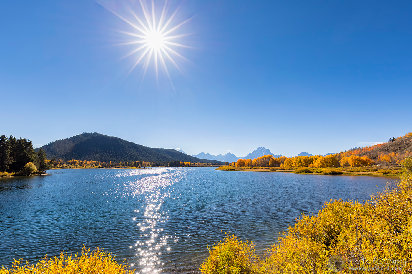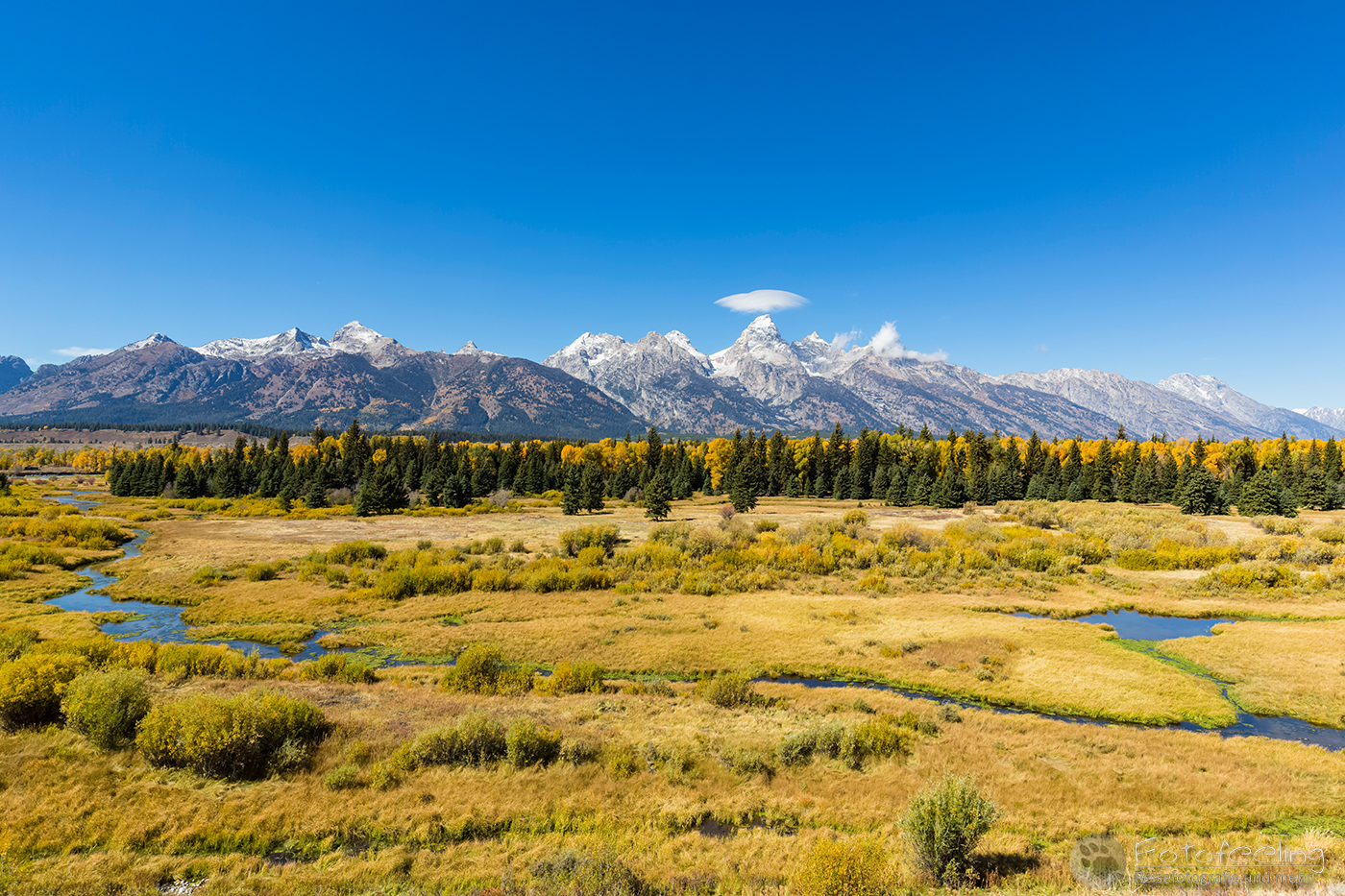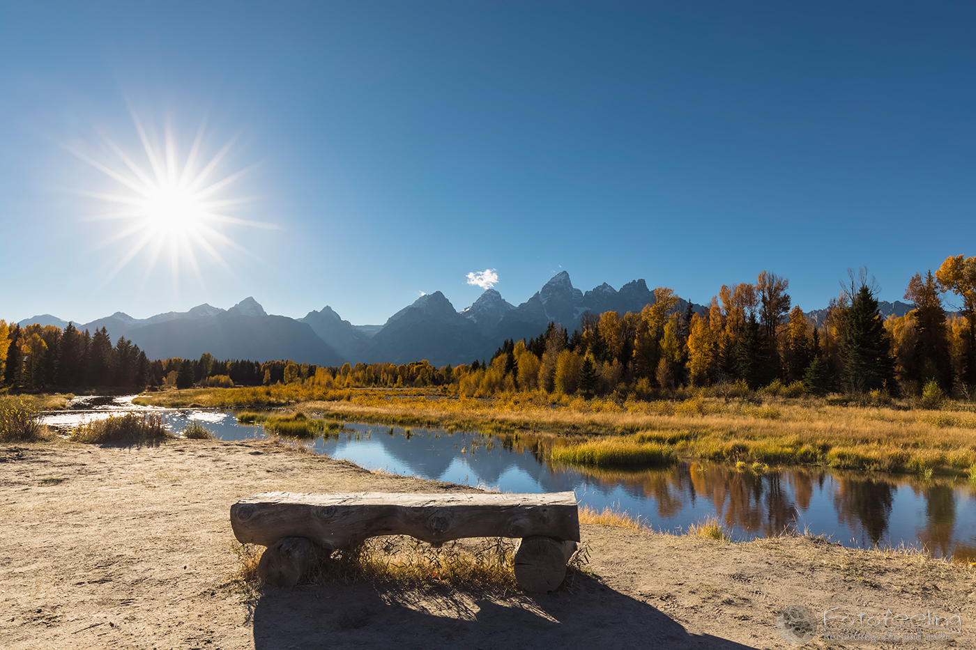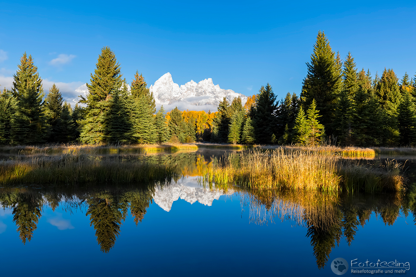 Wir fuhren jedoch nicht weit, sondern hielten gleich am nächsten Parkplatz. Diesmal wollten wir uns auch den Flusslauf des Snake Rivers anschauen. Hier waren wir fast alleine und es war genauso schön wie am hinteren Platz. Die Teton Range spiegelte sich im Wasser, Biberdämme trugen zu einer perfekten Spiegelung bei und der Herbstwald war ebenso schön.