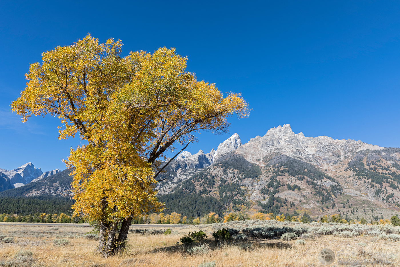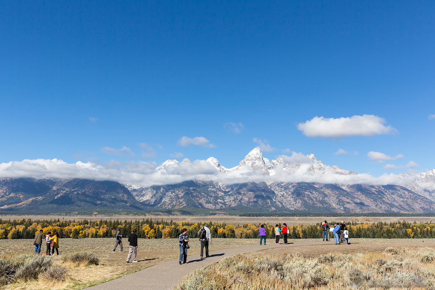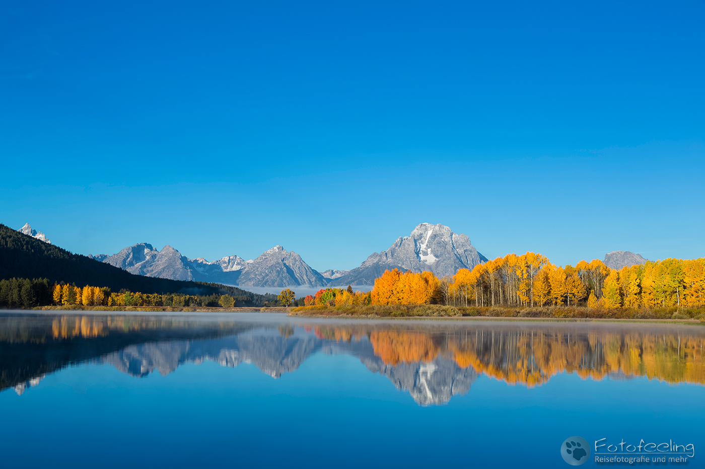 Etwas später ging ich zurück zu Chris, der immer noch gebannt an seinem Platz stand und mit den netten Jungs redete, die hier schon seit Mitternacht Zeit verbracht hatten. Der Platz hier war wirklich ein Traum mit den Laubbäumen, der Teton Range im Hintergrund und der glatten Spiegelung des Wasser. Mittlerweile hatten sich auch die Massen etwas gelichtet und man konnte wieder bequem fotografieren. So machten wir noch ein paar Einstellungen und wanderten dann zum Auto vor.