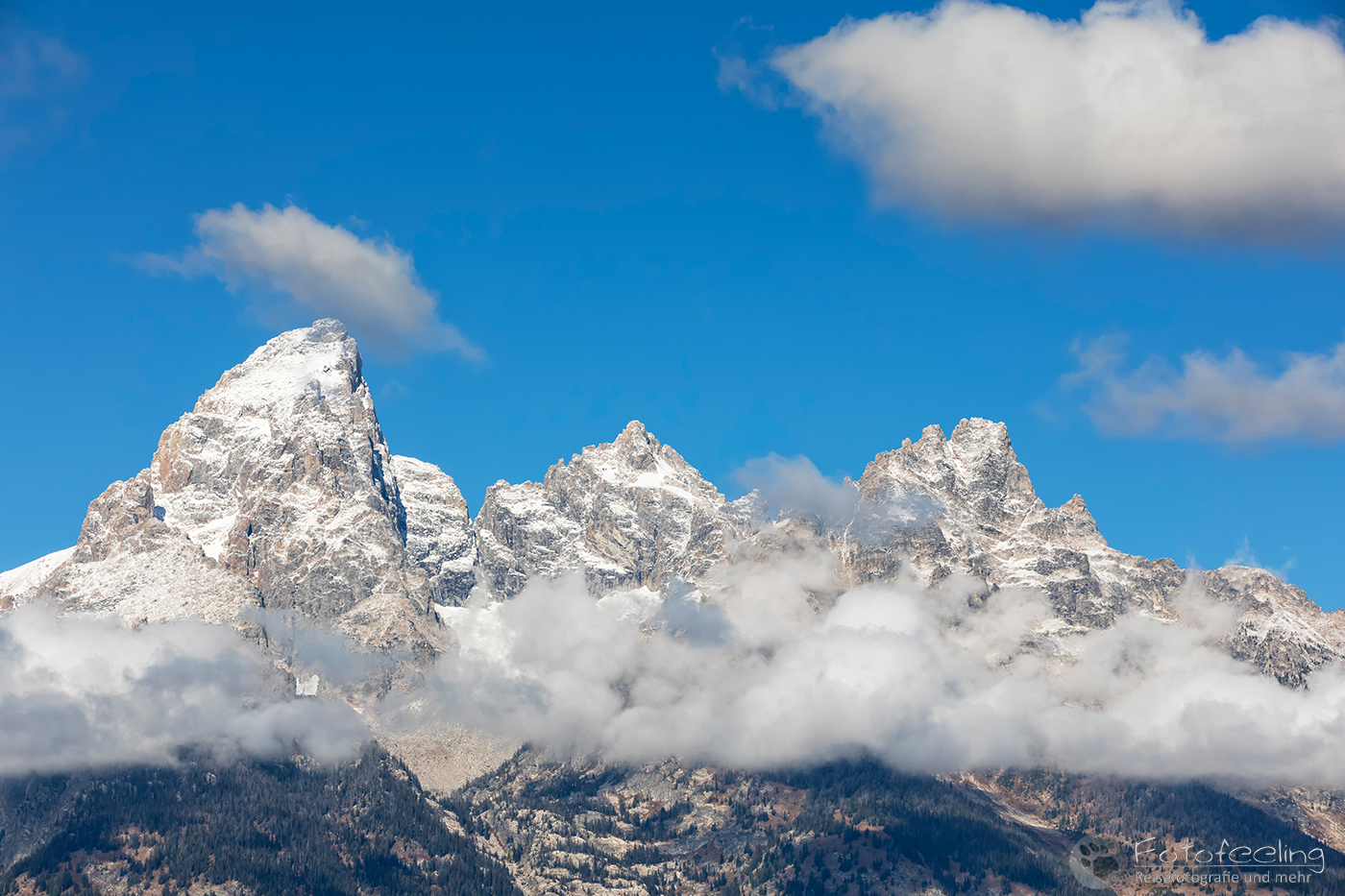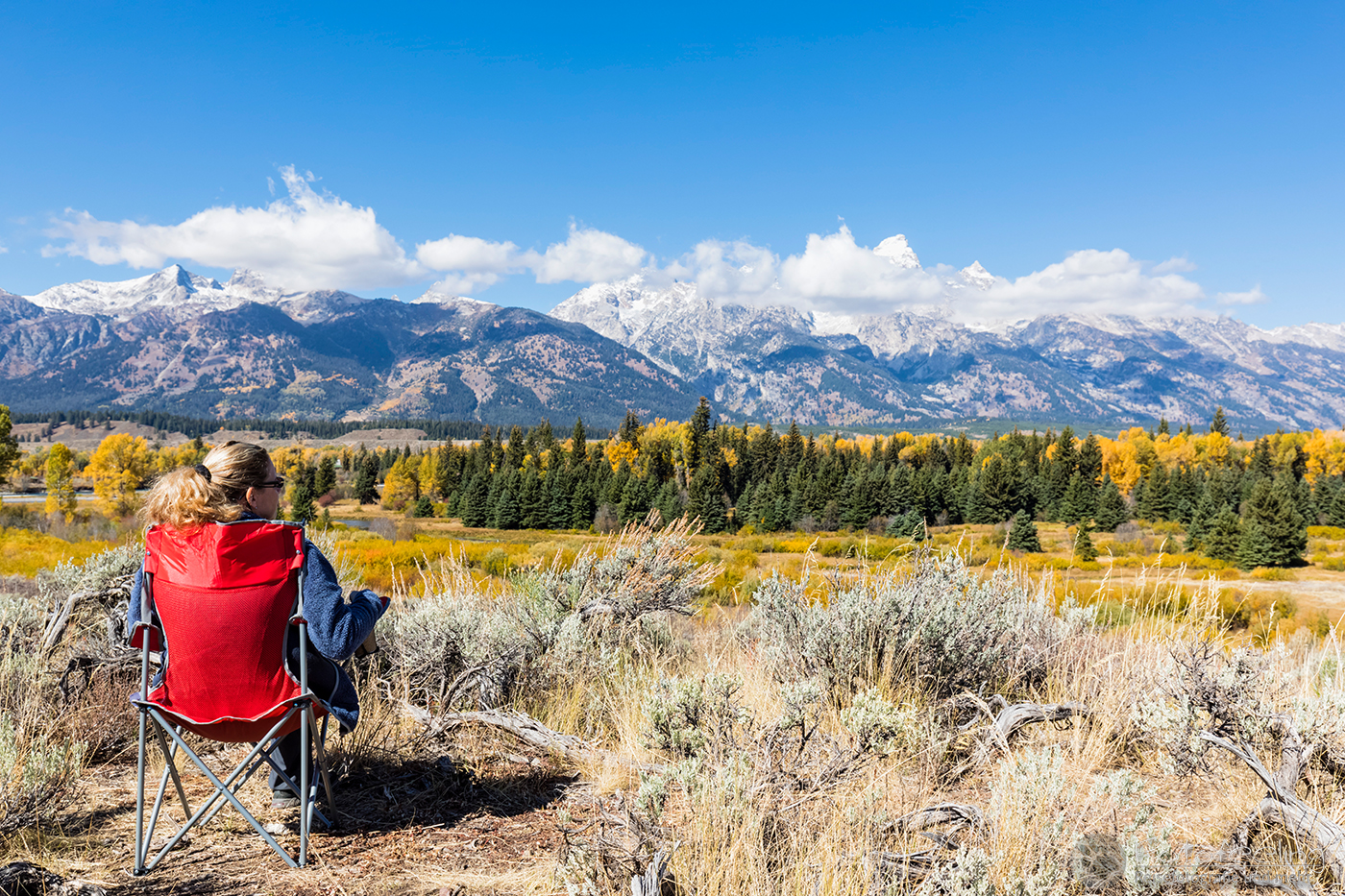 Mittags holten wir uns im Dornan's Chuckwagon Kaffee und Sandwiches, die wir am Aussichtspunkt Blacktail Ponds Overlook essen wollten. Dazu stellten wir uns unsere Stühle an die Abbruchkante und genossen unser Mittagessen mit Aussicht. Die Wolken hingen anfangs noch an den Bergen, aber im Laufe der Zeit lösten sie sich immer mehr und stiegen in den Himmel auf, wo sie dann verpufften.