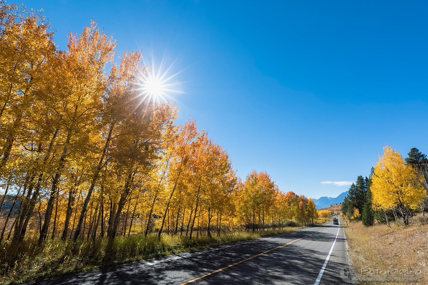 Eine gute Gravelroad brachte uns auf eine Teerstraße, an deren Seitenrändern wunderschöne gelbe Espen standen. Was für ein toller Herbsttag mit strahlend blauem Himmel, Sonnenschein pur und Bäumen im schönsten Herbstkleid. So gelangten wir auf den Jemez Mountain Trail, der uns durch seine knallgelben Espen entlang der Straße begeisterte. Viele kleine Orte säumten den Weg und überall fanden Flohmärkte statt. So kamen wir leider nur sehr langsam voran. Während Chris fast ins Lenkrad biss, schaute ich mir bei Schritttempo die netten Orte und Leute an. Je höher wir hinauf in die Berge kamen, desto weniger Autos waren unterwegs und schon bald waren wir wieder fast alleine.