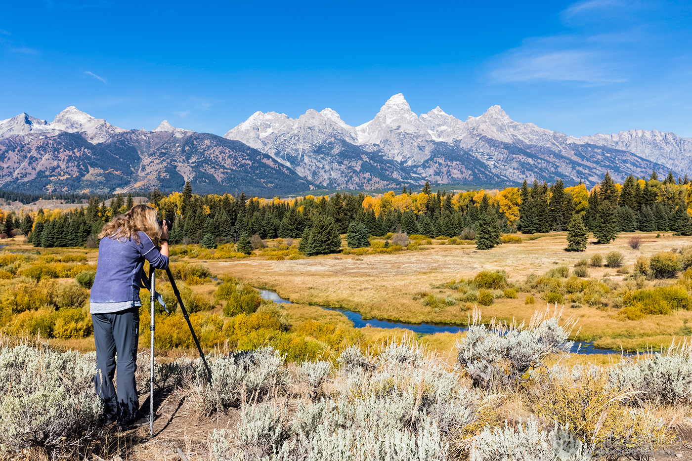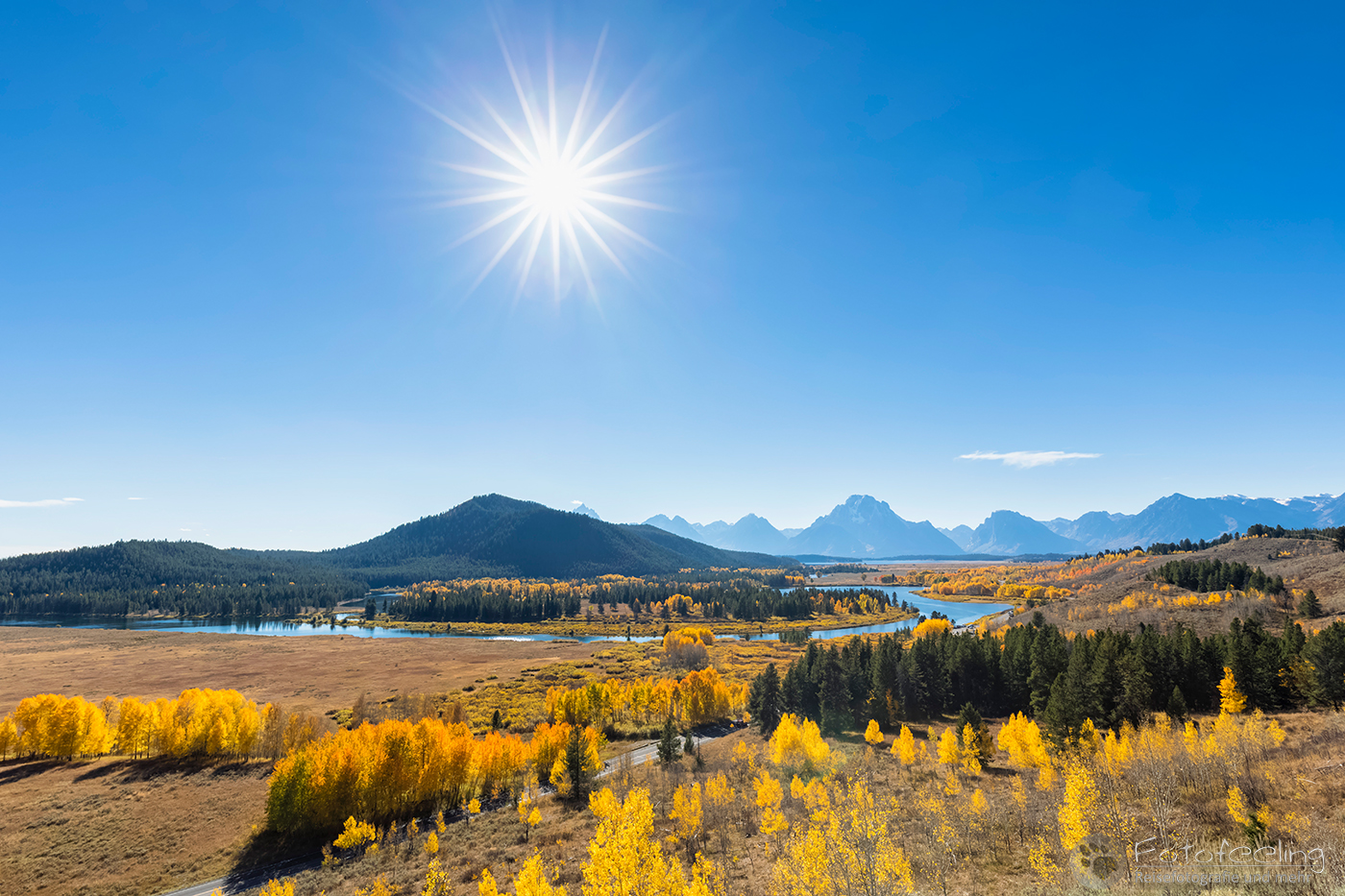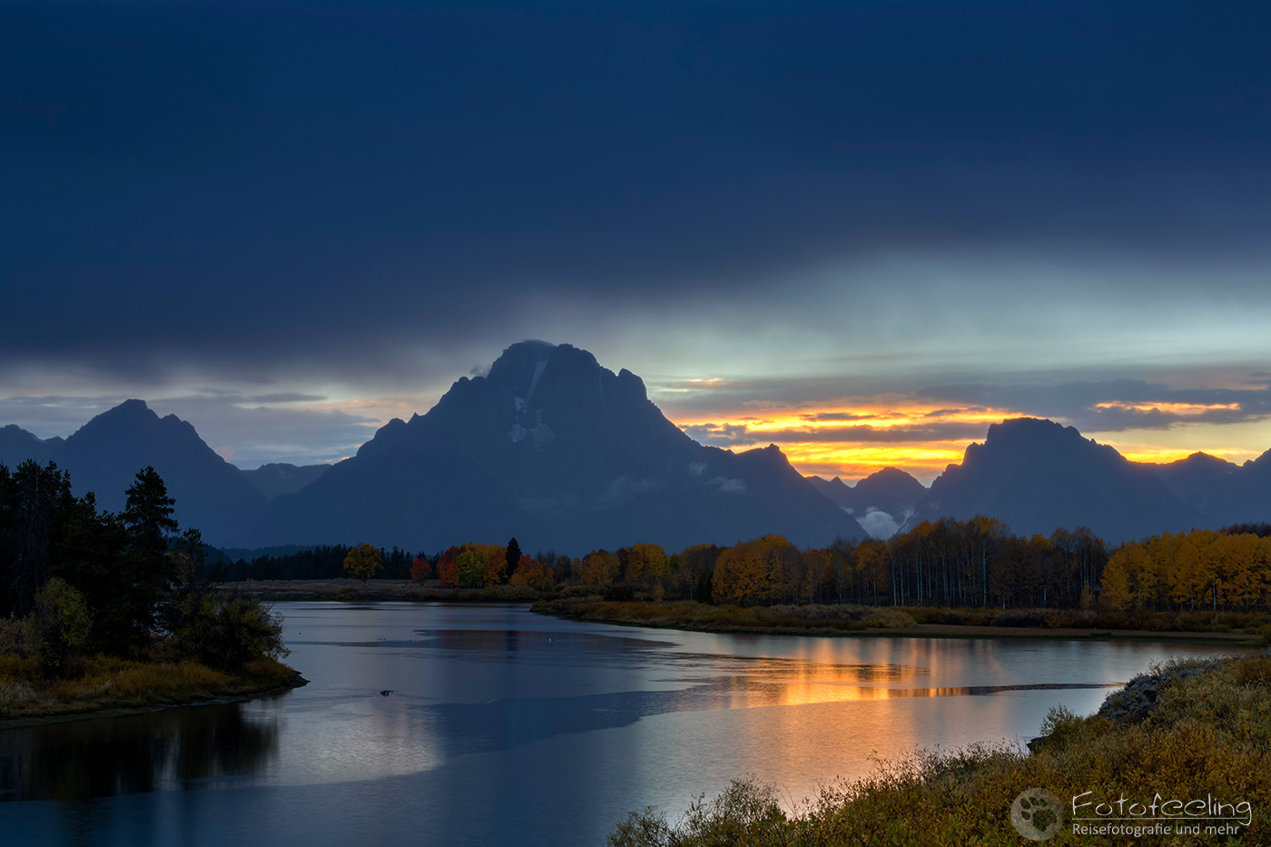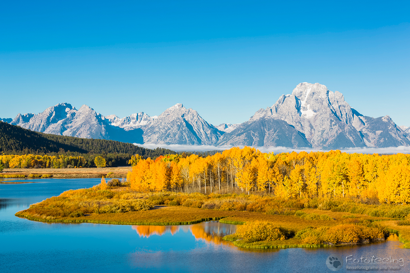 Den Abend verbrachten wir am Oxbow Bend, der bekannten Flusschleife des Snake Rivers mit einer wunderbaren Aussicht auf den Mount Moran (3842m) und die umliegenden Berge. Das Wetter war fast zu perfekt, denn der Himmel war tiefblau und nur ein paar Miniwolken waren zu sehen. Der Indian Summer strahlte in voller Pracht, so dass wir zufrieden die Schönheit der Natur genossen, bis die Sonne hinter den Bergen verschwunden war.