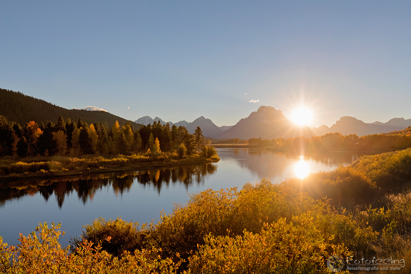 An diesem Morgen fuhren wir zum Oxbow Bend, einer Flussschleife des Snake Rivers und wollten hier den Sonnenaufgang verbringen. Da wir etwas zeitiger als am Vortag dran waren, konnten wir uns unsere Plätze aussuchen. Wieder war es sehr kühl und ein heißer Schluck Kaffee tat gut.