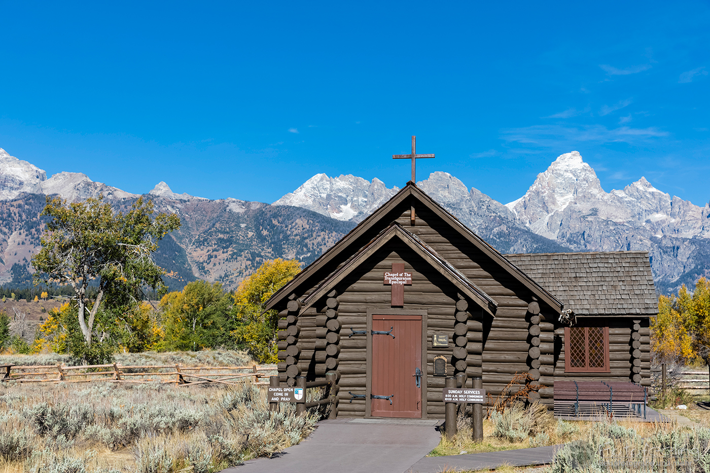 Später fuhren wir durch den Park und fotografierten ein paar Herbstbäume vor den Bergspitzen. Auch zur Kapelle machen wir einen kurzen Abstecher.