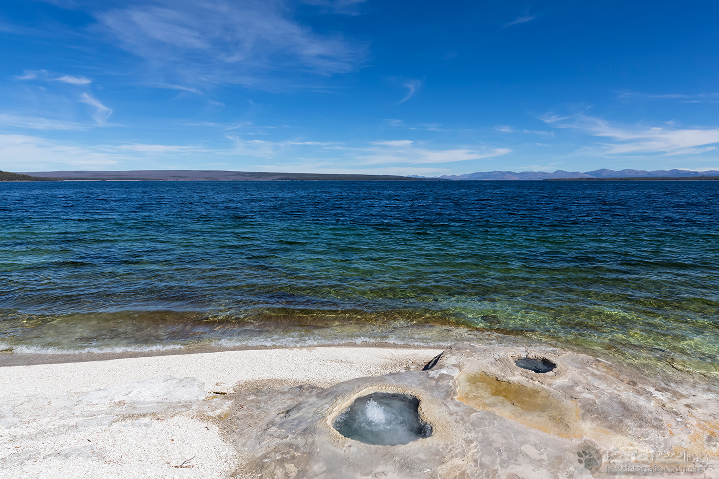Wir fuhren bis zum West Thumb, dem größten Geysir Becken am Ufer des Yellowstone Sees und gingen dort eine Runde auf dem gut ausgebauten Stegsystem spazieren. Auch hier war es ein wenig wie nach Hause kommen. Zwar hatten wir eine andere Jahreszeit, wodurch alles anders aussah, aber es war trotzdem alles so vertraut. Einige Geysire waren ruhiger als sonst, dafür sprudelte aus anderen viel mehr Wasser bzw. Rauch. Wir wanderten rechts den Weg entlang, vorbei an den Thumb Paint Pods. Hier hatten wir gleich einmal ein Erlebnis der anderen Art, als drei Chinesinnen wie von Sinnen über den Steg polterten und dann direkt auf eine kleine Fumarole im Boden zuliefen. Das ganze Gebiet hier ist instabil und es ist leider schon vorgekommen, dass jemand eingebrochen ist und sich üble Verbrennungen oder Schlimmeres zugezogen hat. Warum sonst gab es überall Hinweisschilder auf den Wegen zu bleiben, aber die waren ja nicht auf Chinesisch. Jedenfalls schnappte Chris sich die drei und wies sie nett darauf hin. Sie bedankten sich und blieben dann zum Glück auf dem Steg.