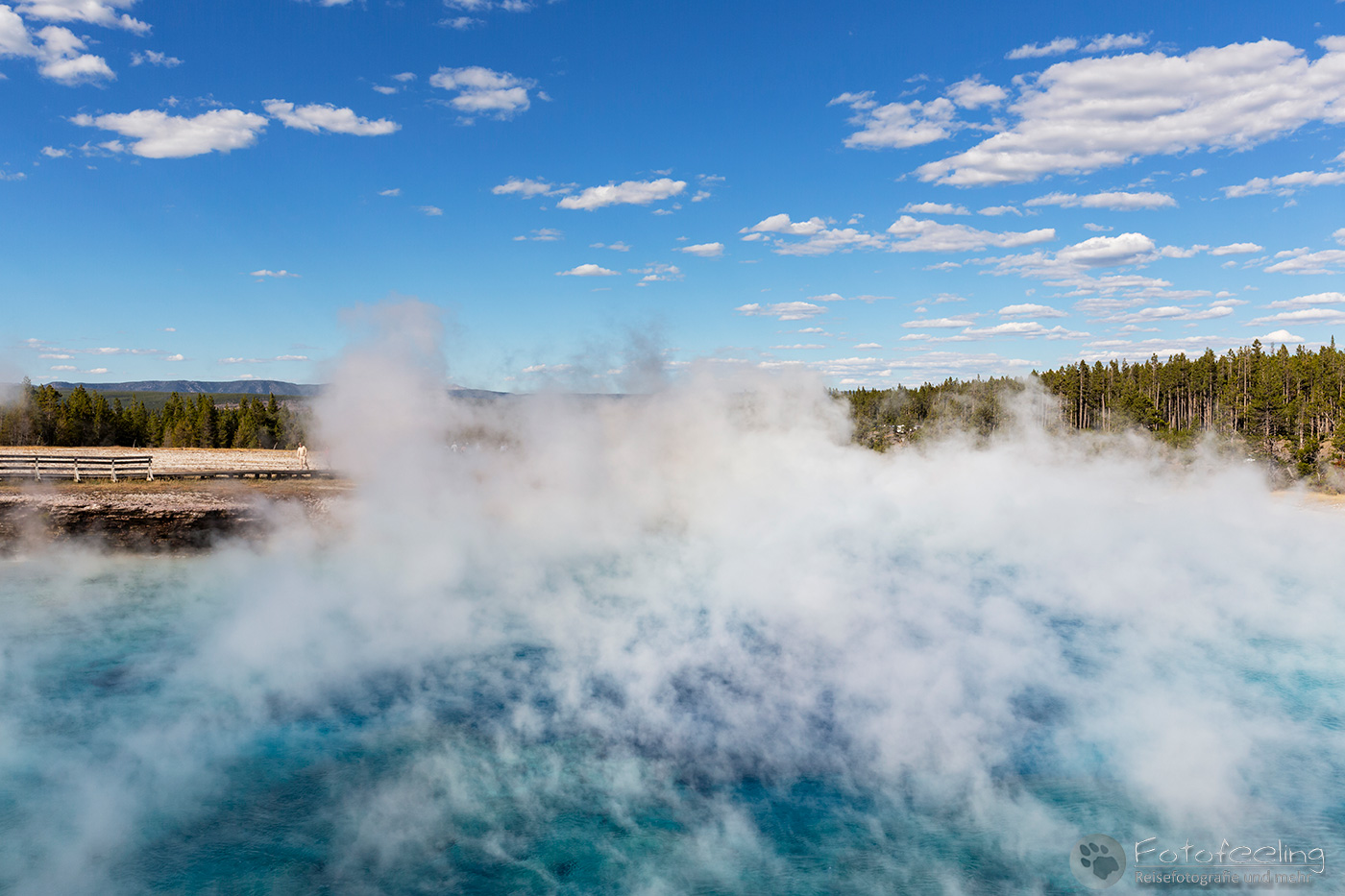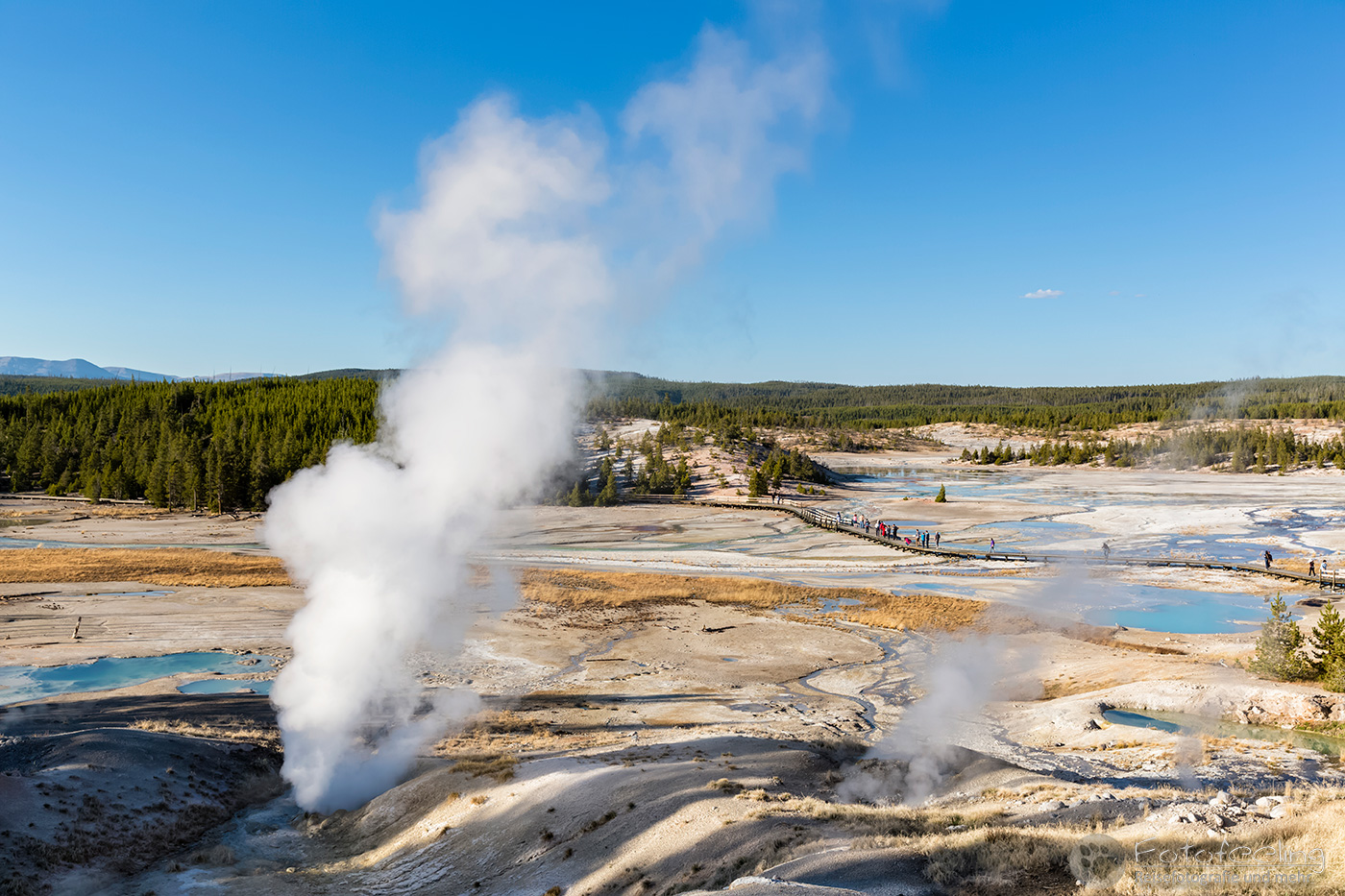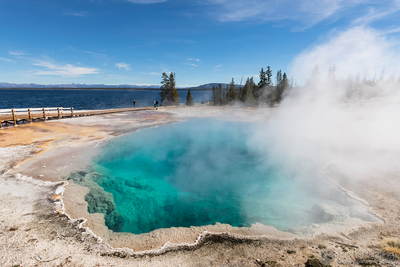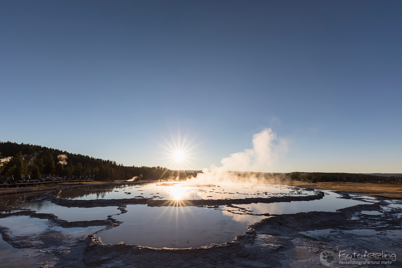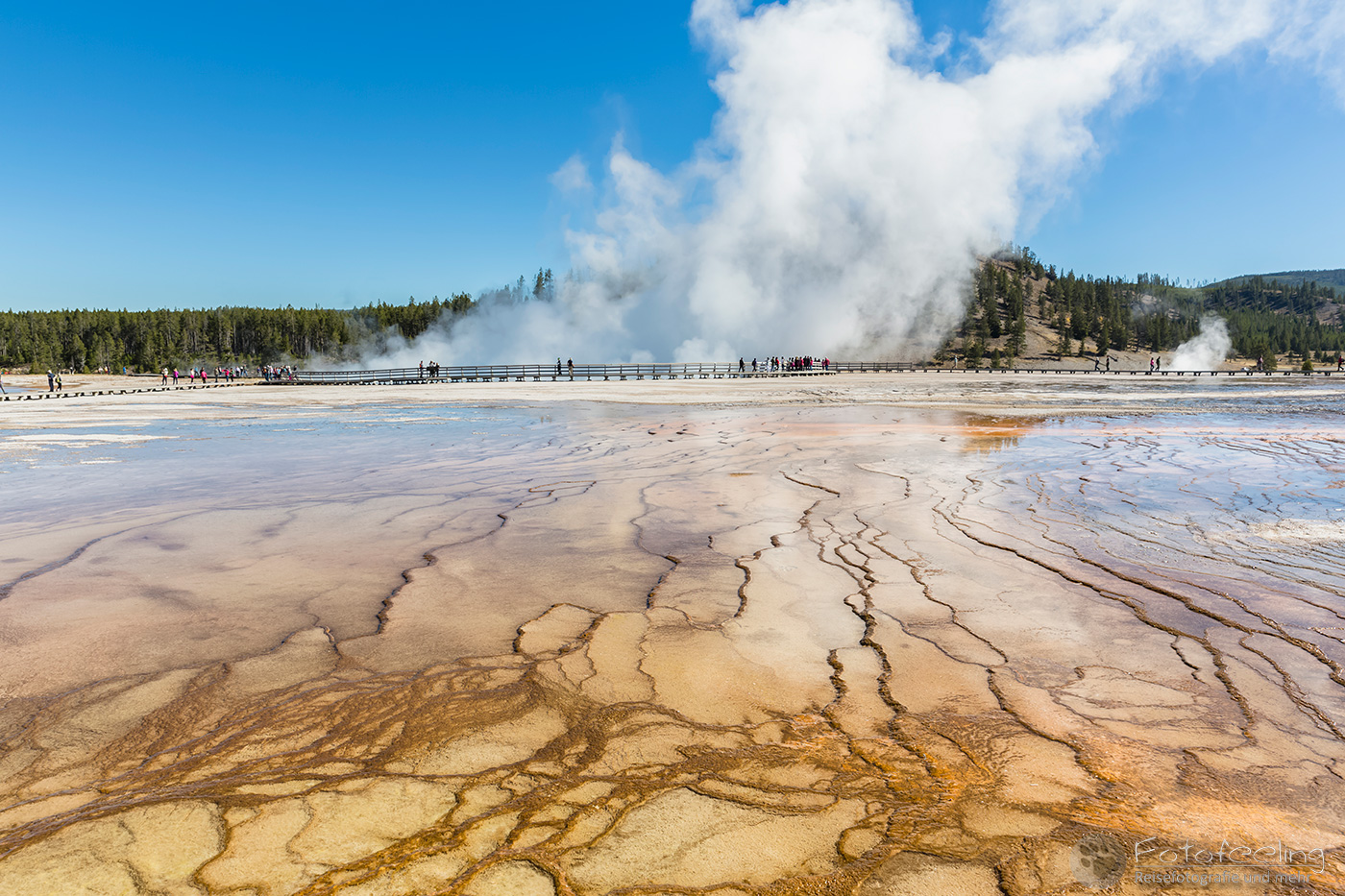 Hier war das Wetter jetzt perfekt, aber leider sahen das alle anderen Menschen auch so wie wir und stürmten das Midway Geysir Basin. Der Parkplatz quoll über und wir parkten gleich freiwillig draußen. Wieder waren es hauptsächlich Asiaten, die sich in allen möglichen Posen vor dem farbenfrohen Wasser fotografieren ließen.