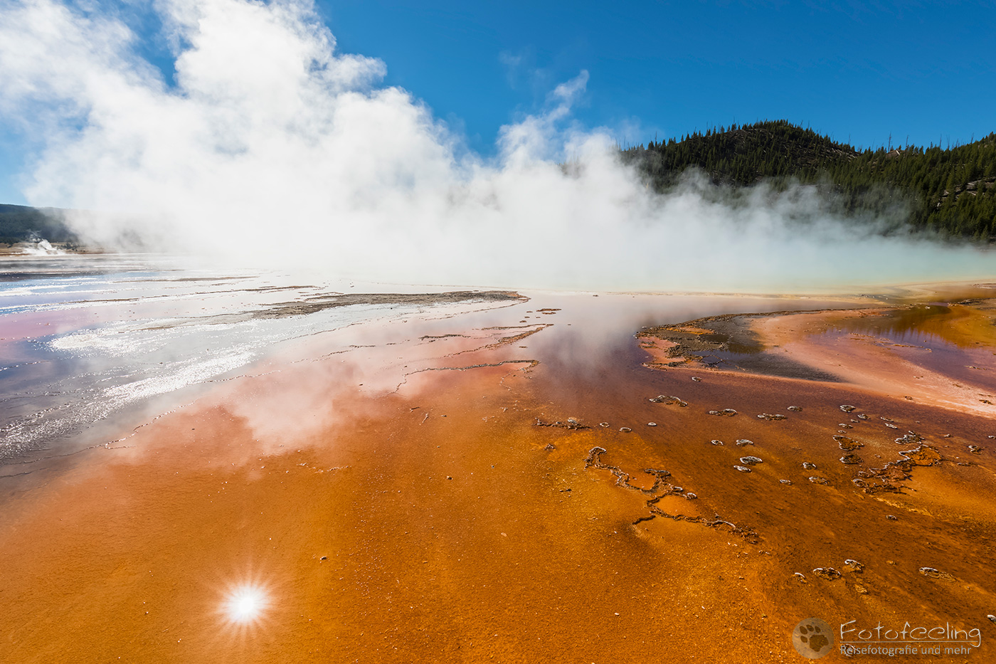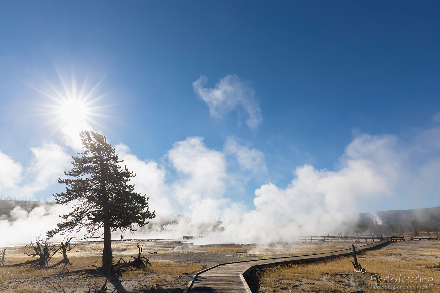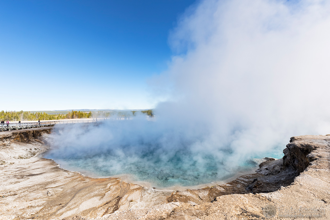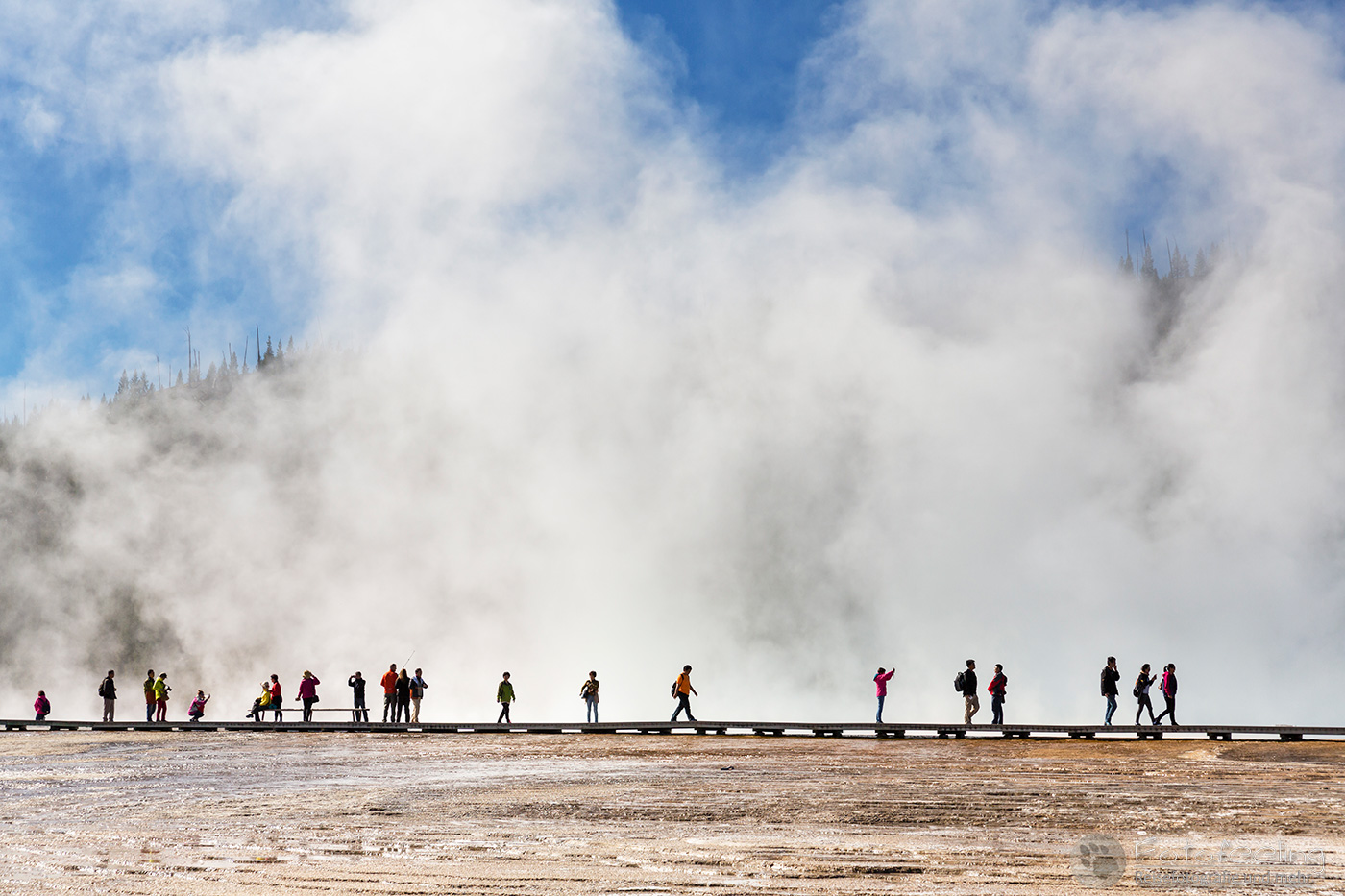 Hier war das Wetter jetzt perfekt, aber leider sahen das alle anderen Menschen auch so wie wir und stürmten das Midway Geysir Basin. Der Parkplatz quoll über und wir parkten gleich freiwillig draußen. Wieder waren es hauptsächlich Asiaten, die sich in allen möglichen Posen vor dem farbenfrohen Wasser fotografieren ließen.