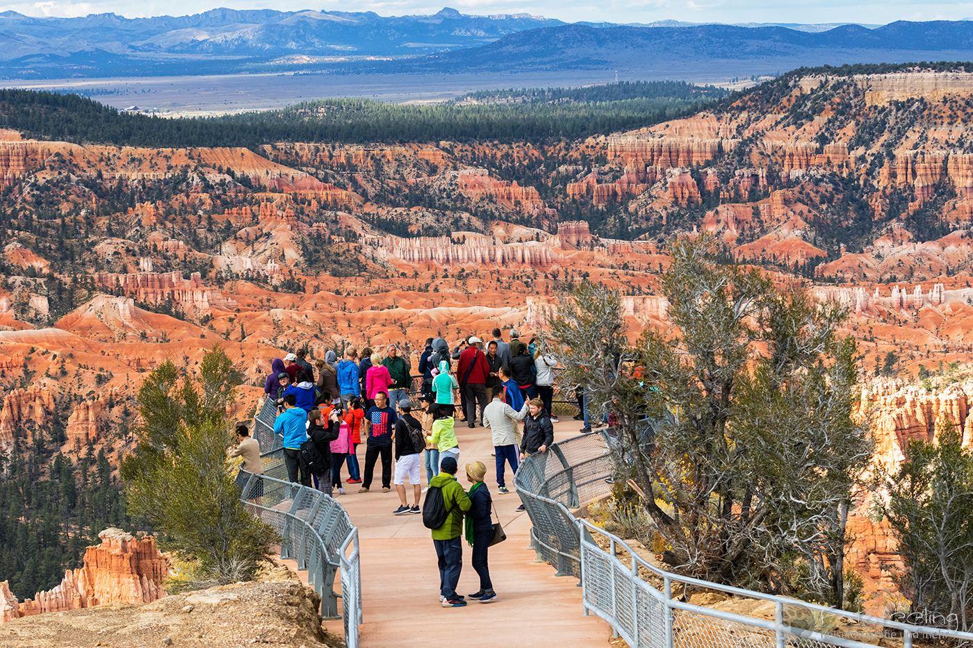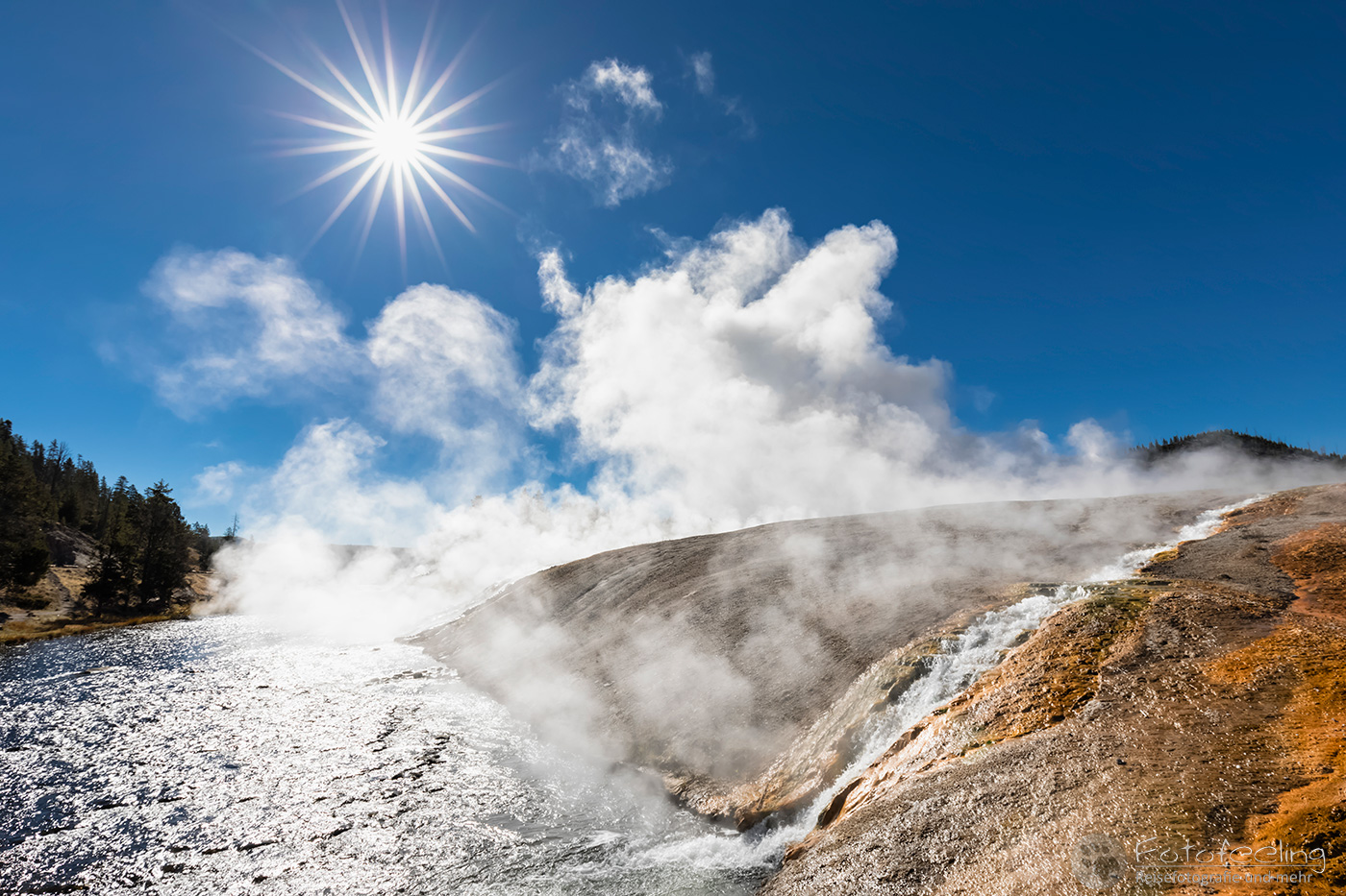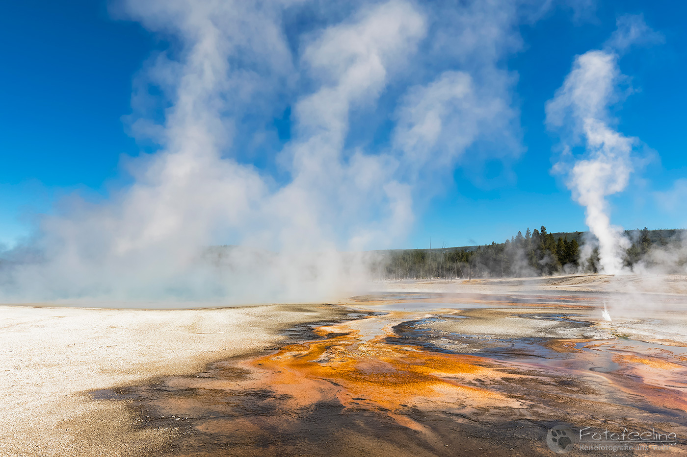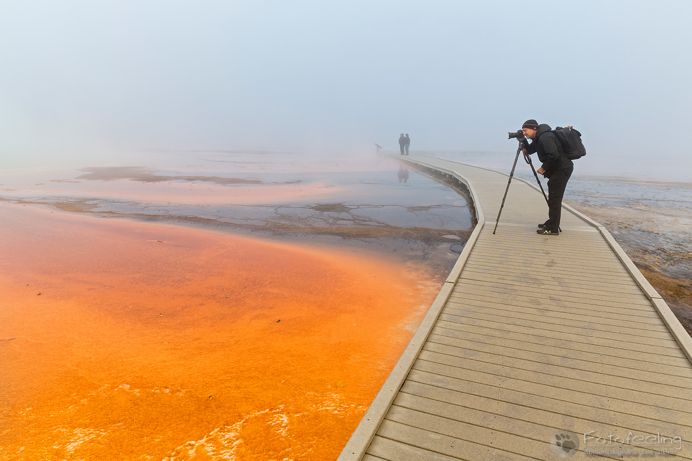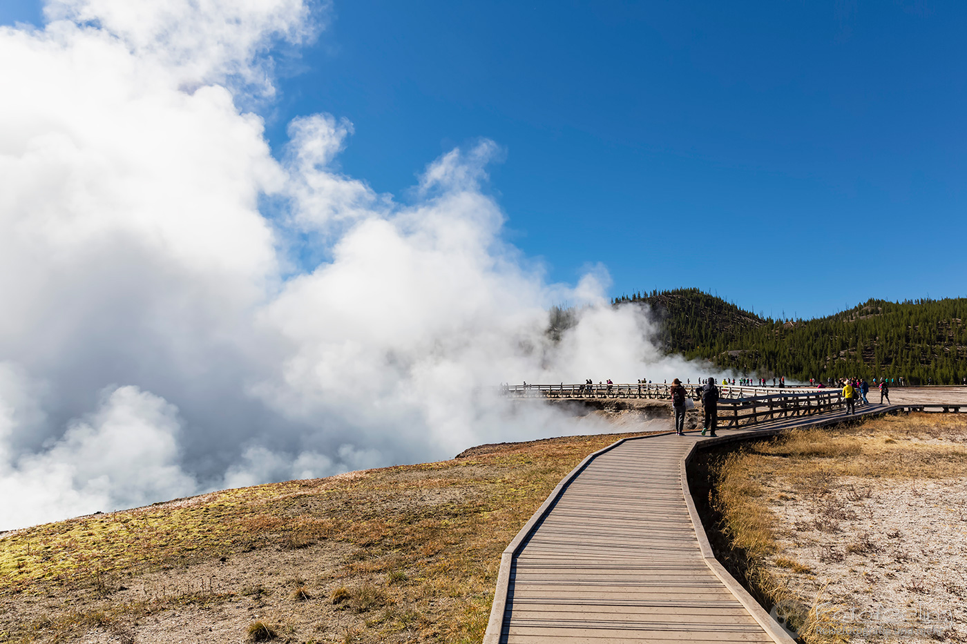Hier war das Wetter jetzt perfekt, aber leider sahen das alle anderen Menschen auch so wie wir und stürmten das Midway Geysir Basin. Der Parkplatz quoll über und wir parkten gleich freiwillig draußen. Wieder waren es hauptsächlich Asiaten, die sich in allen möglichen Posen vor dem farbenfrohen Wasser fotografieren ließen.