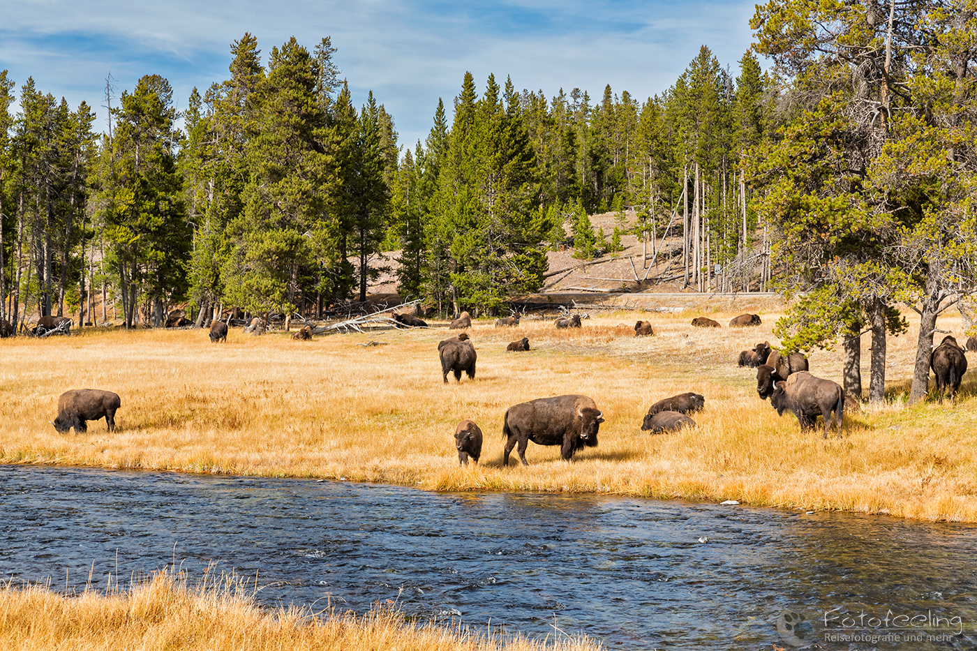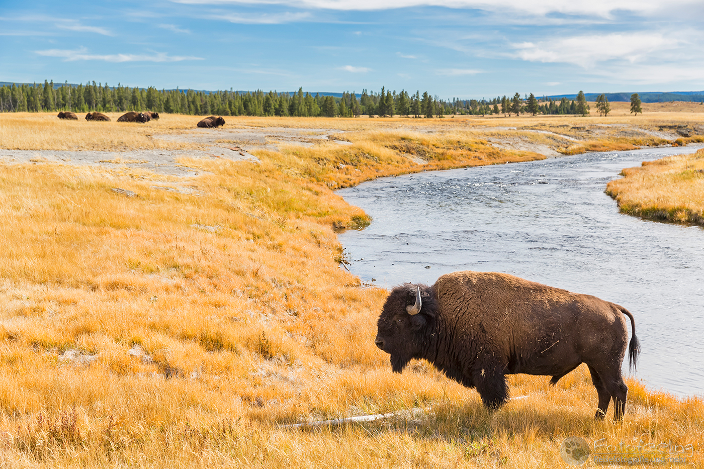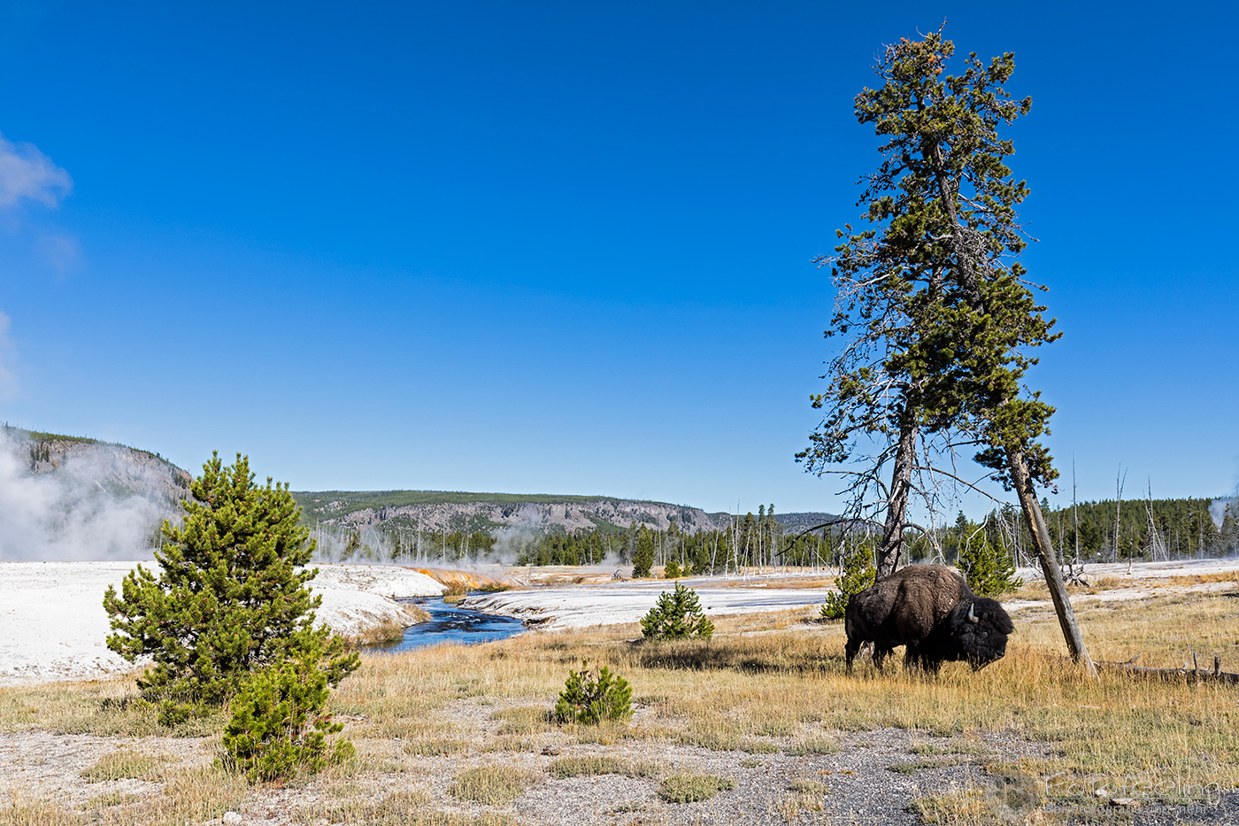 Auch hier gibt es einen Boardwalk, von dem aus man alle wichtigen Punkte des Basins ansehen kann. Wir wanderten an dem kleinen Sprout Geysir, dem großen farbenfrohen Rainbow Pool und dem Sunset Lake vorbei. In der hintersten Ecke befand sich unser Ziel, der Emerald Pool. Er ist einfach ein Prachtstück mit seiner tiefblauen Mitte und dem gelb-orangen Rand, so dass er für uns immer einen Besuch wert ist. Doch am Cliff Geysir verharrten wir diesmal am längsten, denn er war an diesem Vormittag gar nicht zu bremsen und spuckte fast ohne Unterlass meterhoch. Während wir irgendwann langsam zum Auto zurückwanderten, setzte sich ein Mann mit Kaffee und Reiseführer auf den Zaun und begann zu lesen. Weit entfernt näherte sich ein Bisonbulle. Wir hofften natürlich auf ein schönes Bild von dem Bison vor dem farbigen Wasser der Pools und beobachteten ihn. Doch er ging schnurstracks auf den Zaun zu, wo der Mann saß. Ehe man noch etwas sagen konnte, knuffte der Bison nach dem dreisten Zaunbesetzer, der zum Glück gerade noch rechtzeitig den Bullen bemerkte und beherzt hinter den Zaun sprang. Der Bulle war zufrieden und kratzte sich an dem Zaun. Wir waren erleichtert und auch etwas schockiert, denn alles ging so schnell und niemand hatte den Mann gewarnt, aber mit so etwas konnte man ja nicht rechnen und wir alle hatten die Zielstrebigkeit des Bullen unterschätzt.