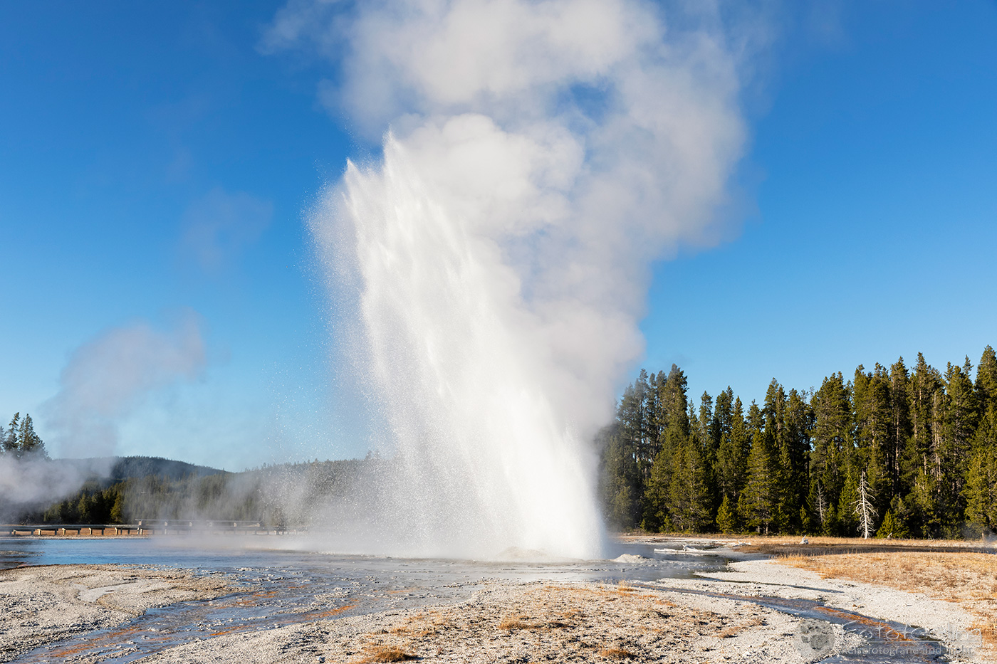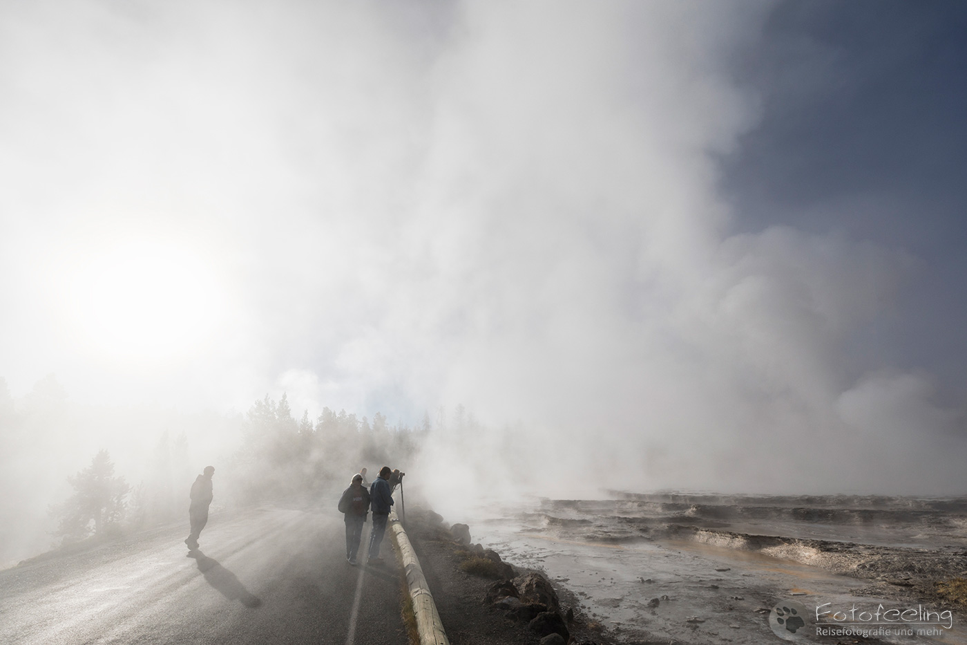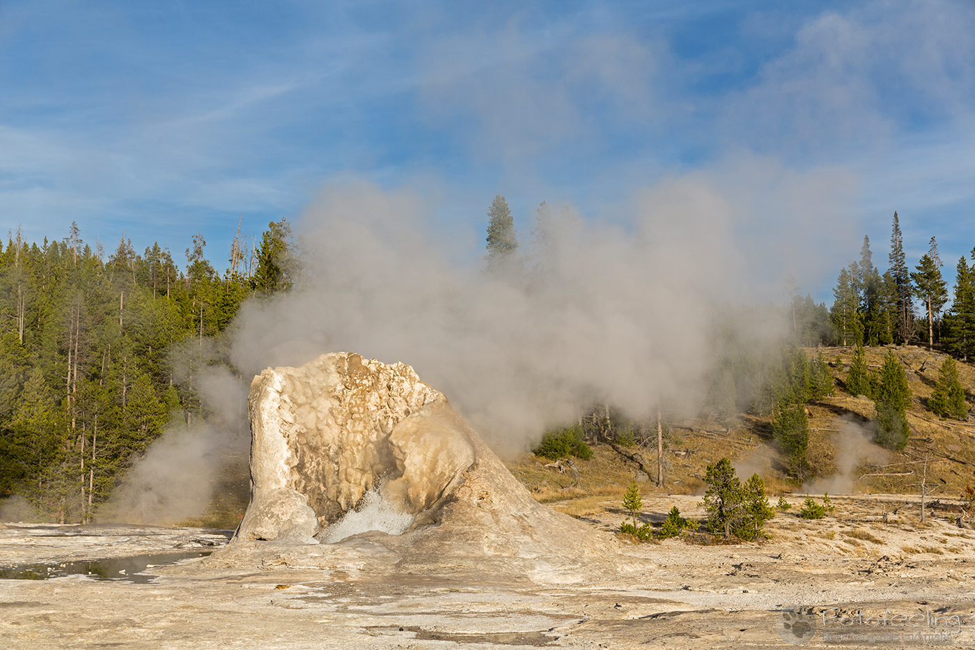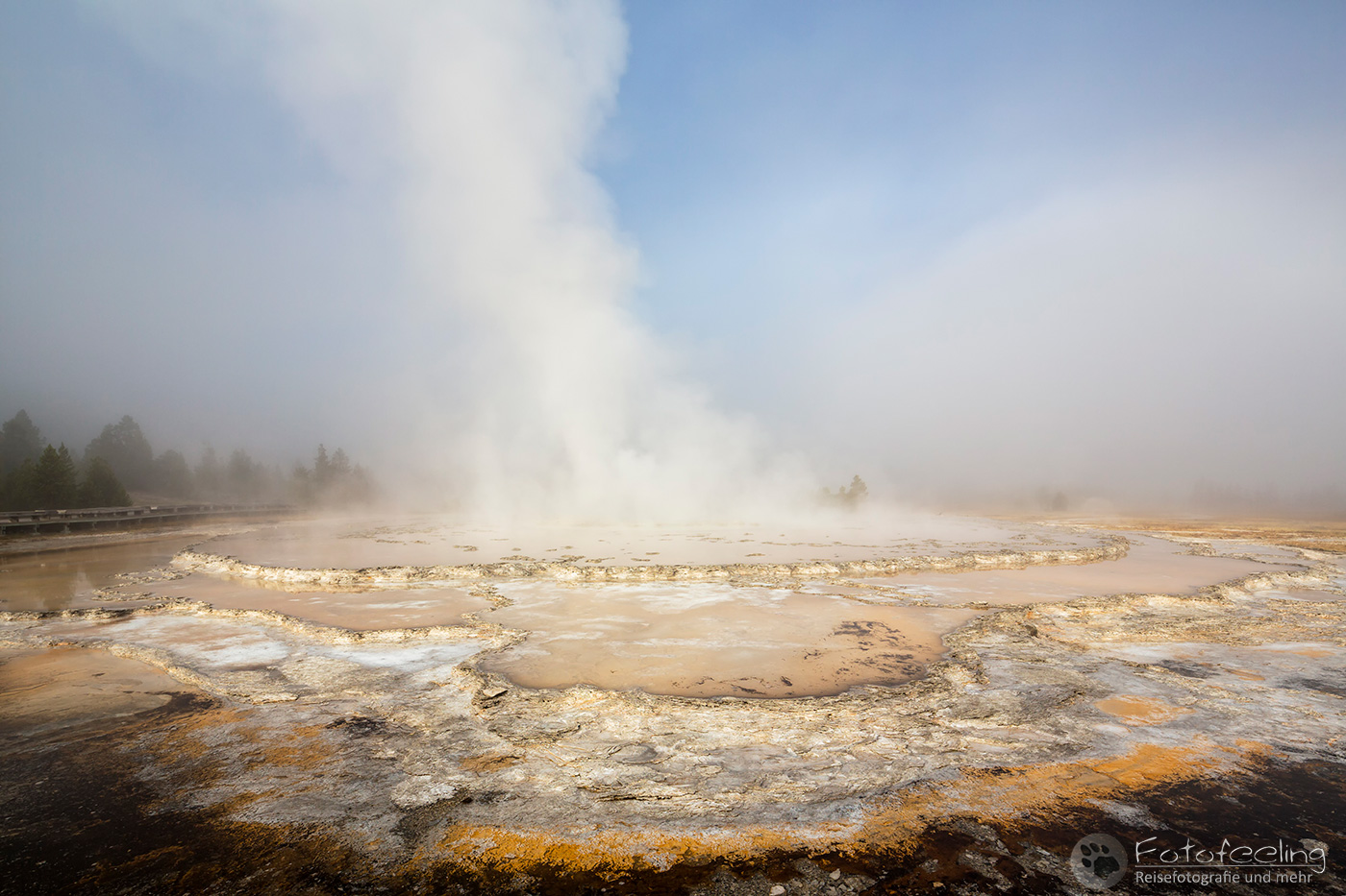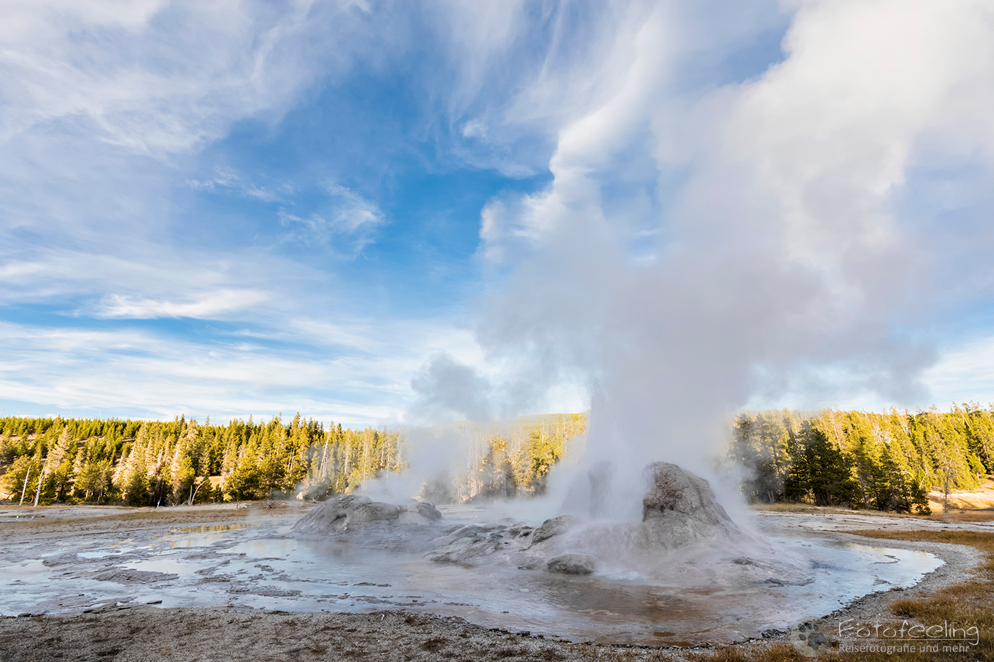 An diesem Morgen suchten wir immer wieder den Firehole Drive auf, denn unser Freund, der Great Fontaine Geysir, sollte zwischen 7.00 Und 9.00 Uhr morgens ausbrechen. Doch außer zähem Nebel, der sich auf diesem Weg besonders hartnäckig zu halten schien, passierte gar nichts. Nachdem wir wieder einmal etwas durch die Gegend gefahren waren und ein paar Landschaftsaufnahmen gemacht hatten, war es dann soweit, um 8.15 Uhr liefen die Terrassen über. Wir parkten unser Auto und suchten uns einen schönen Platz zum Fotografieren. Doch der Nebel war so dicht, dass man ihn kaum vom Dampf unterscheiden konnte. Dank der kühlen Morgentemperaturen dampfte der Geysir gleich noch mehr und wir sahen gar nichts. Doch wir waren guter Dinge und hofften, dass der Nebel sich wenigstens etwas lichtete. Die Sonne kam immer wieder etwas durch. Als er ausbrach, rauchte er noch mehr und wir hörten eigentlich mehr, als wir sahen oder fotografieren konnten, aber gerade das war sehr beeindruckend. Er zischte und blubberte und wir hörten das Wasser spritzen und auf dem Boden aufkommen. Das war trotz eingeschränkter Sicht ein wirklich tolles Erlebnis und der Rauch ging weit in den Himmel hinauf. Während Chris noch versuchte, ein paar Bilder zu machen, ging ich schon mal zum White Dome Geysir, der natürlich wunderschön ausbrach, während ich noch auf dem Weg zu ihm war. Doch auch aus der Entfernung war er toll anzuschauen, die Fontaine ging steil nach oben und auch er dampfte und rauchte nur so. An diesem Morgen war es überall sehr aktiv in diesem Gebiet, selbst aus namenlosen Geysiren schossen kleine Fontänen in die Höhe und es dampfte viel mehr als sonst.