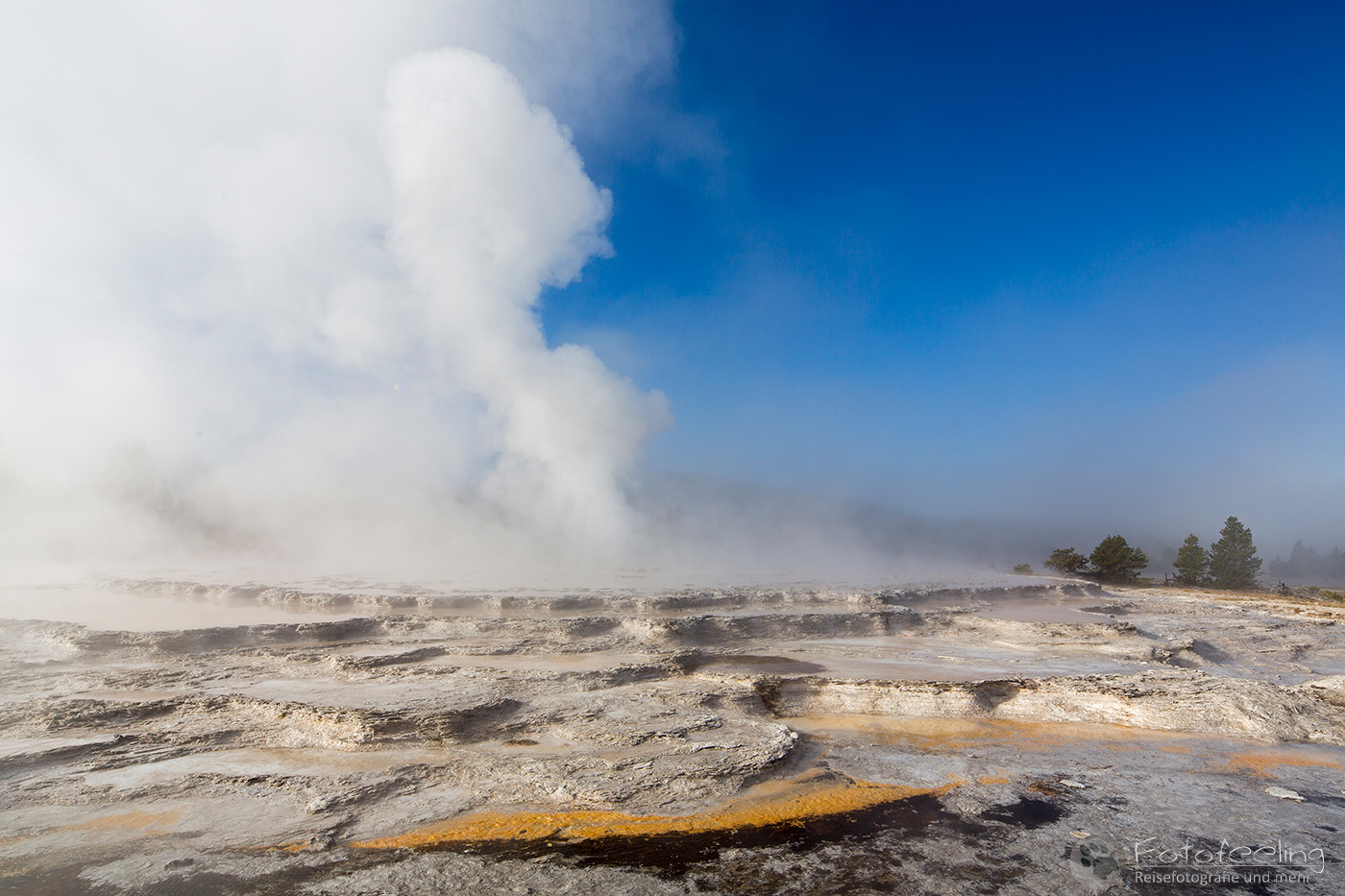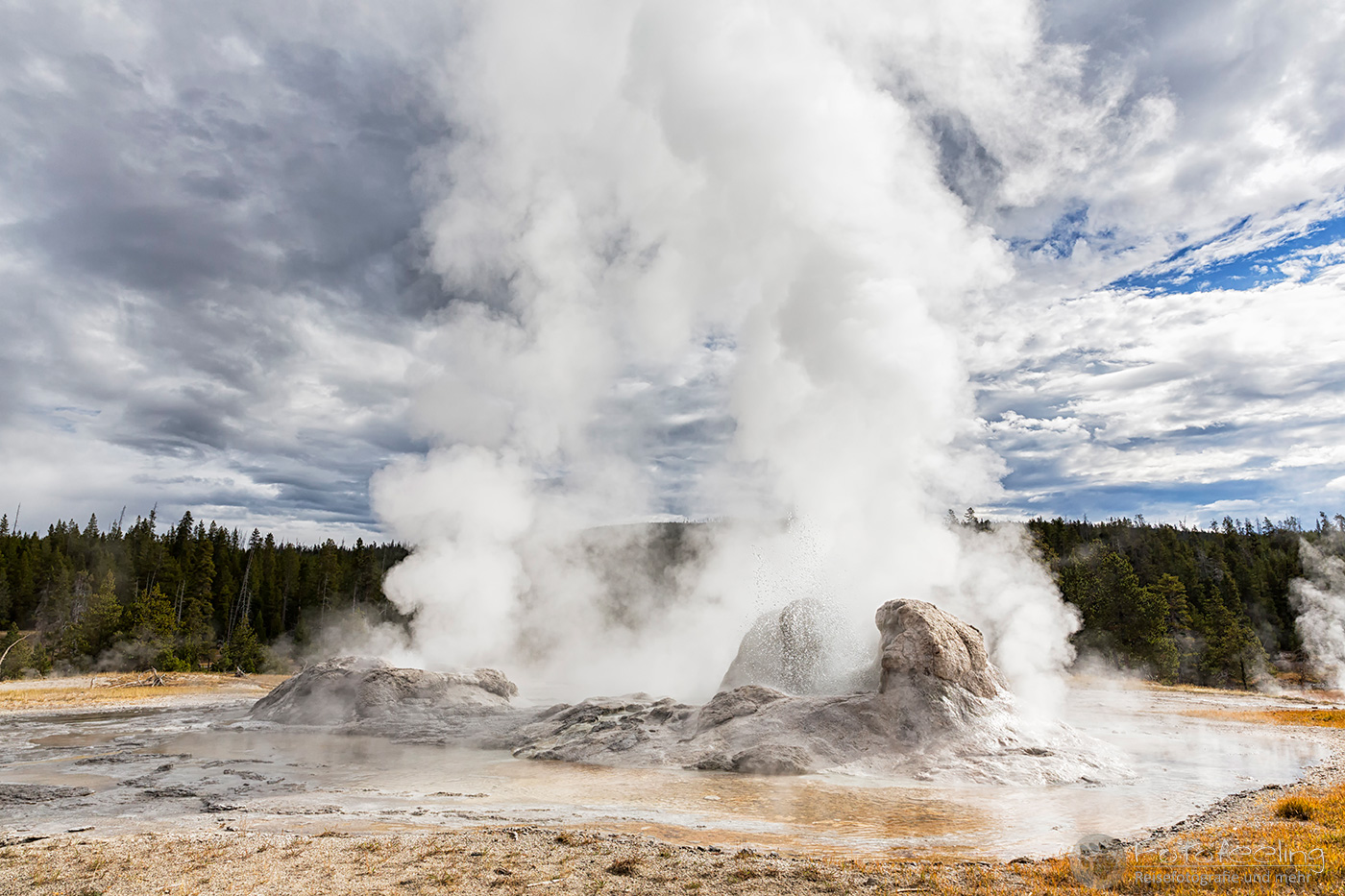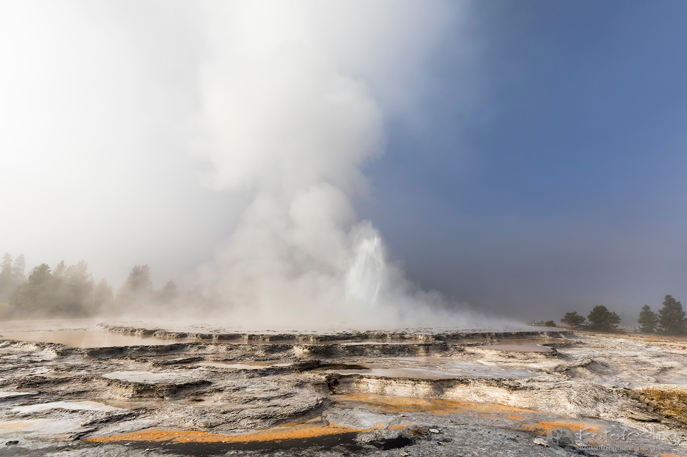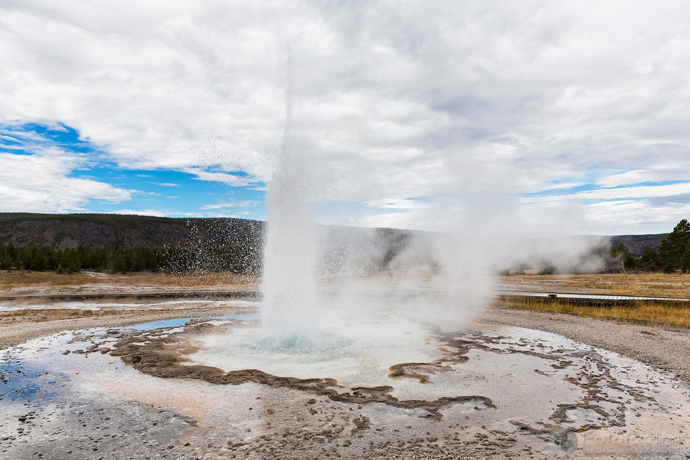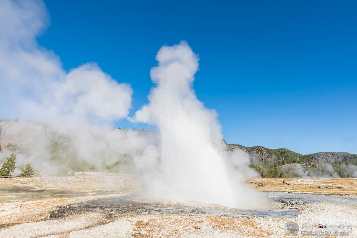 An diesem Morgen suchten wir immer wieder den Firehole Drive auf, denn unser Freund, der Great Fontaine Geysir, sollte zwischen 7.00 Und 9.00 Uhr morgens ausbrechen. Doch außer zähem Nebel, der sich auf diesem Weg besonders hartnäckig zu halten schien, passierte gar nichts. Nachdem wir wieder einmal etwas durch die Gegend gefahren waren und ein paar Landschaftsaufnahmen gemacht hatten, war es dann soweit, um 8.15 Uhr liefen die Terrassen über. Wir parkten unser Auto und suchten uns einen schönen Platz zum Fotografieren. Doch der Nebel war so dicht, dass man ihn kaum vom Dampf unterscheiden konnte. Dank der kühlen Morgentemperaturen dampfte der Geysir gleich noch mehr und wir sahen gar nichts. Doch wir waren guter Dinge und hofften, dass der Nebel sich wenigstens etwas lichtete. Die Sonne kam immer wieder etwas durch. Als er ausbrach, rauchte er noch mehr und wir hörten eigentlich mehr, als wir sahen oder fotografieren konnten, aber gerade das war sehr beeindruckend. Er zischte und blubberte und wir hörten das Wasser spritzen und auf dem Boden aufkommen. Das war trotz eingeschränkter Sicht ein wirklich tolles Erlebnis und der Rauch ging weit in den Himmel hinauf. Während Chris noch versuchte, ein paar Bilder zu machen, ging ich schon mal zum White Dome Geysir, der natürlich wunderschön ausbrach, während ich noch auf dem Weg zu ihm war. Doch auch aus der Entfernung war er toll anzuschauen, die Fontaine ging steil nach oben und auch er dampfte und rauchte nur so. An diesem Morgen war es überall sehr aktiv in diesem Gebiet, selbst aus namenlosen Geysiren schossen kleine Fontänen in die Höhe und es dampfte viel mehr als sonst.