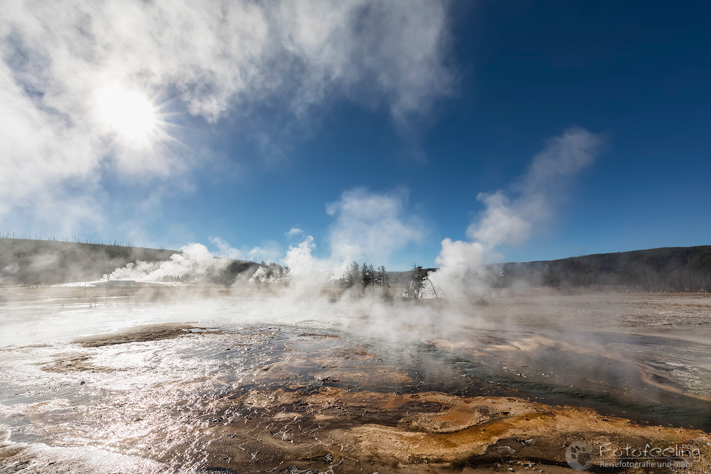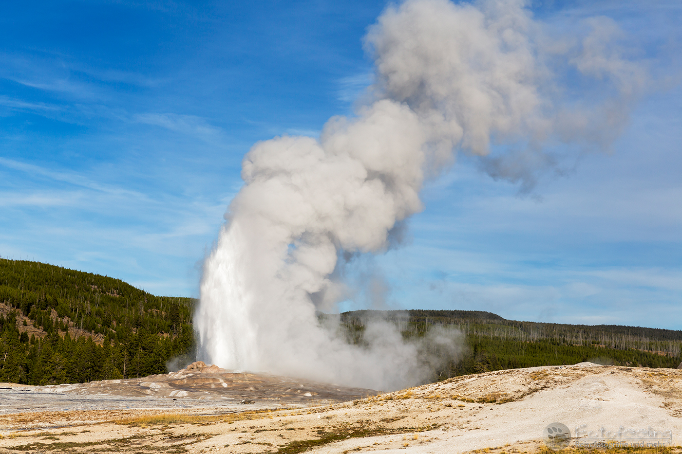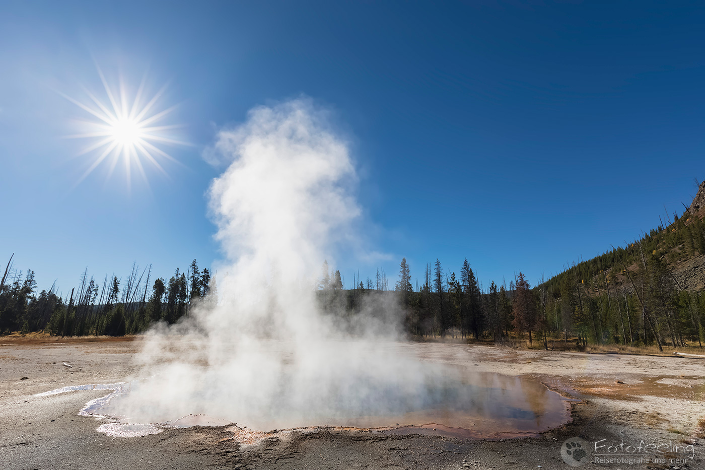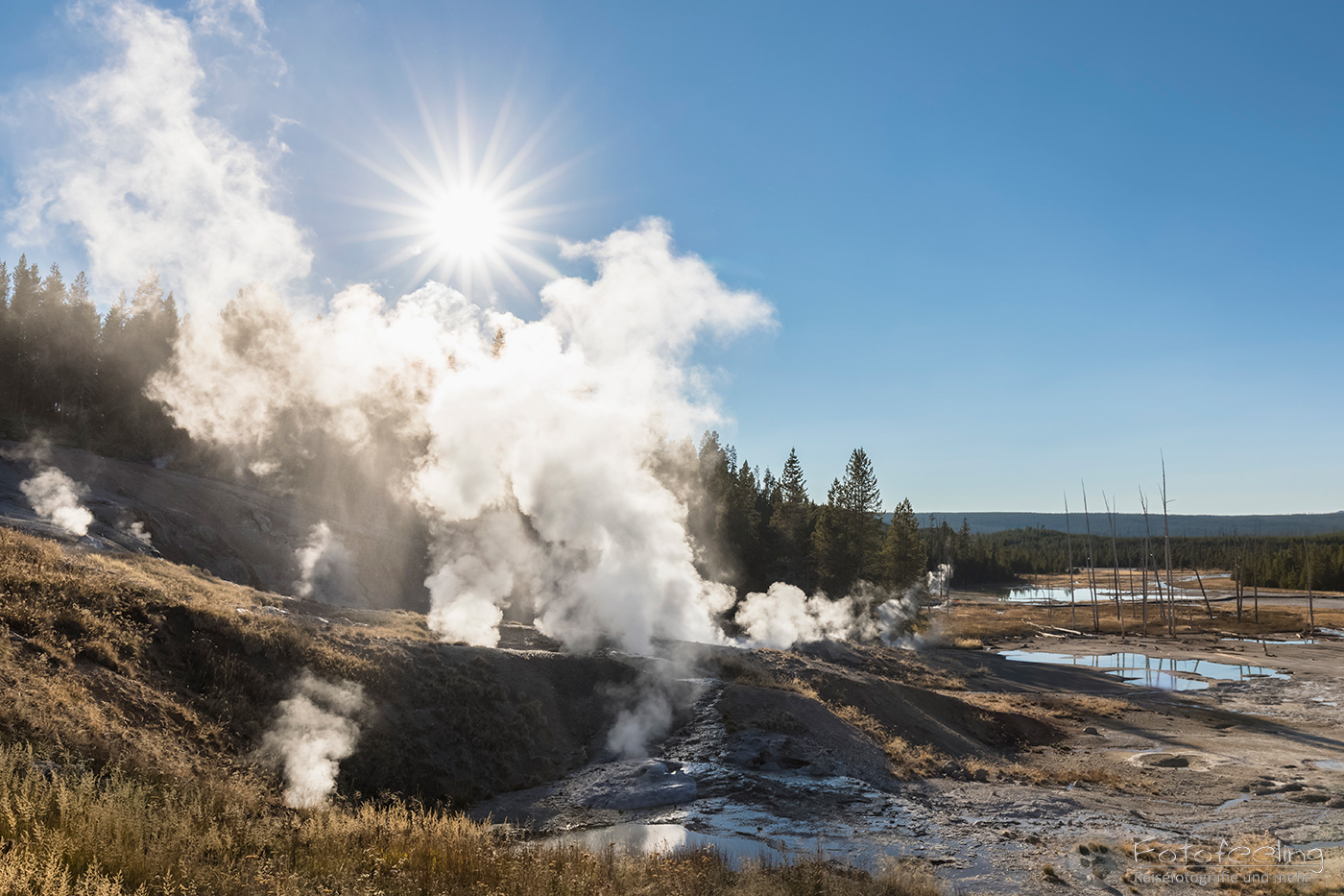 An diesem Morgen suchten wir immer wieder den Firehole Drive auf, denn unser Freund, der Great Fontaine Geysir, sollte zwischen 7.00 Und 9.00 Uhr morgens ausbrechen. Doch außer zähem Nebel, der sich auf diesem Weg besonders hartnäckig zu halten schien, passierte gar nichts. Nachdem wir wieder einmal etwas durch die Gegend gefahren waren und ein paar Landschaftsaufnahmen gemacht hatten, war es dann soweit, um 8.15 Uhr liefen die Terrassen über. Wir parkten unser Auto und suchten uns einen schönen Platz zum Fotografieren. Doch der Nebel war so dicht, dass man ihn kaum vom Dampf unterscheiden konnte. Dank der kühlen Morgentemperaturen dampfte der Geysir gleich noch mehr und wir sahen gar nichts. Doch wir waren guter Dinge und hofften, dass der Nebel sich wenigstens etwas lichtete. Die Sonne kam immer wieder etwas durch. Als er ausbrach, rauchte er noch mehr und wir hörten eigentlich mehr, als wir sahen oder fotografieren konnten, aber gerade das war sehr beeindruckend. Er zischte und blubberte und wir hörten das Wasser spritzen und auf dem Boden aufkommen. Das war trotz eingeschränkter Sicht ein wirklich tolles Erlebnis und der Rauch ging weit in den Himmel hinauf. Während Chris noch versuchte, ein paar Bilder zu machen, ging ich schon mal zum White Dome Geysir, der natürlich wunderschön ausbrach, während ich noch auf dem Weg zu ihm war. Doch auch aus der Entfernung war er toll anzuschauen, die Fontaine ging steil nach oben und auch er dampfte und rauchte nur so. An diesem Morgen war es überall sehr aktiv in diesem Gebiet, selbst aus namenlosen Geysiren schossen kleine Fontänen in die Höhe und es dampfte viel mehr als sonst.