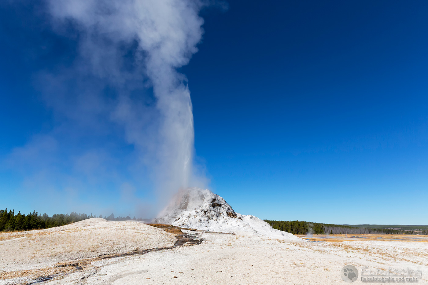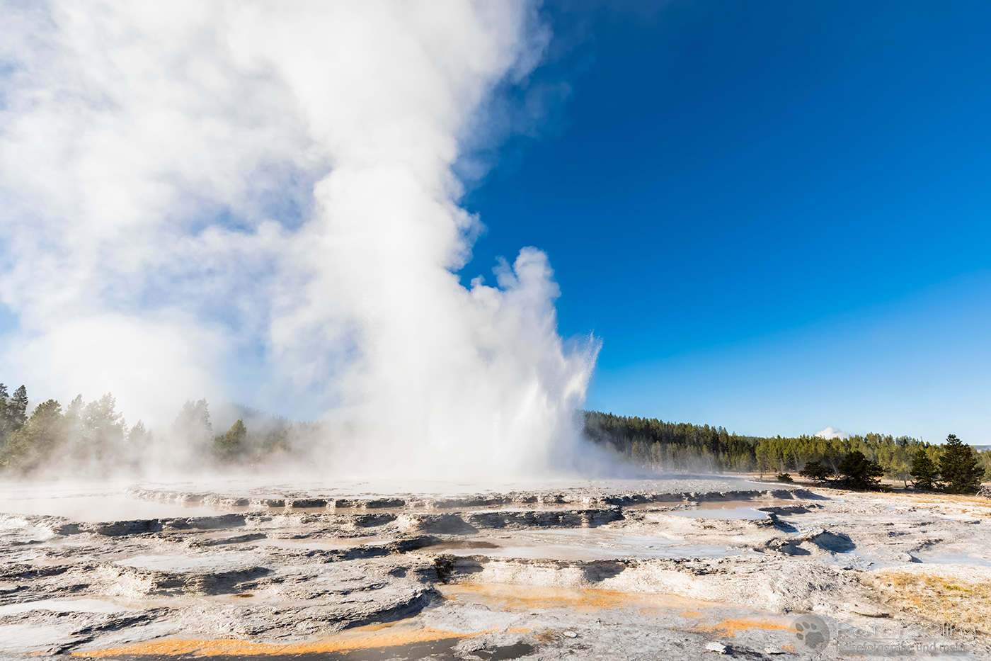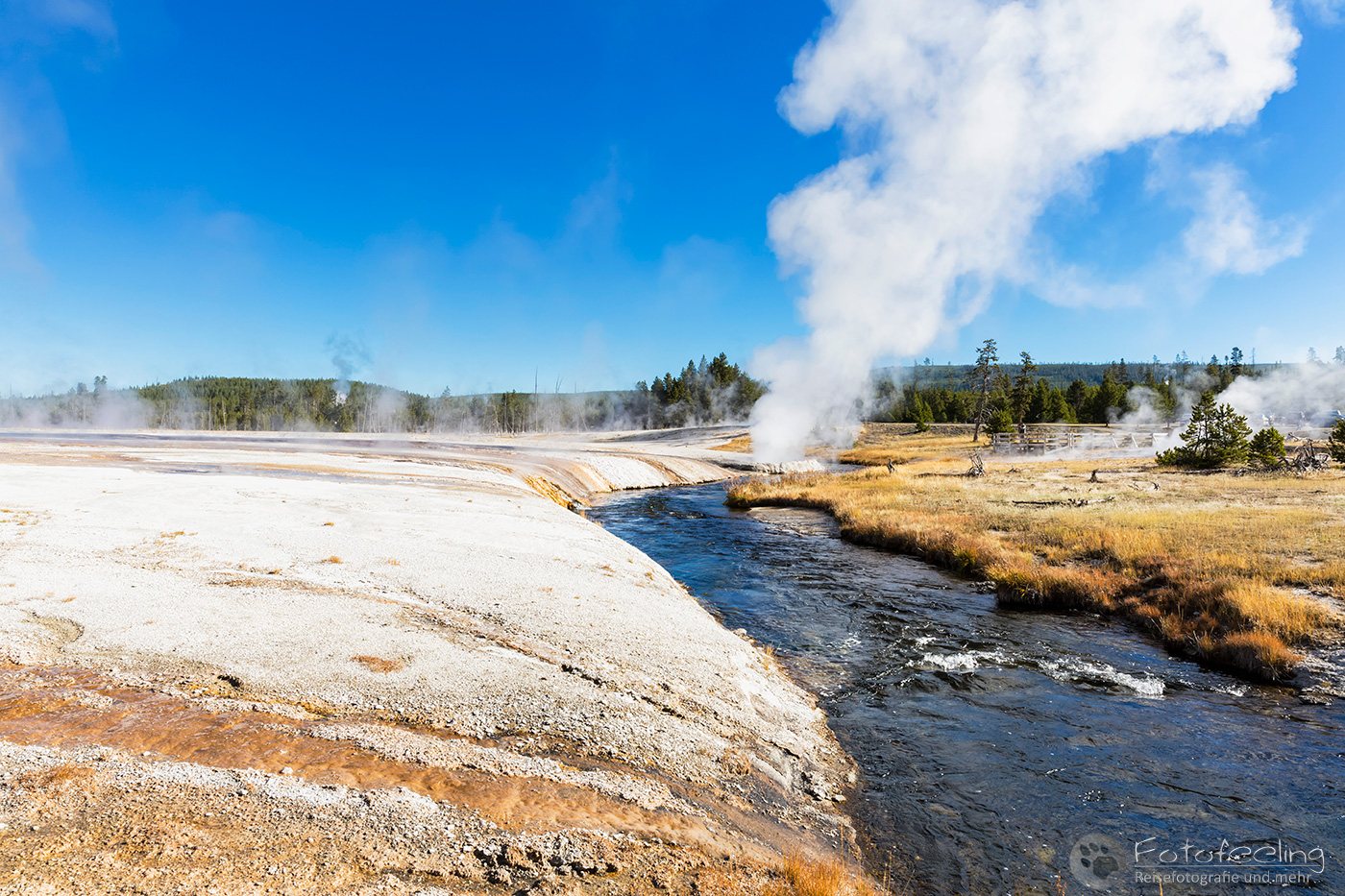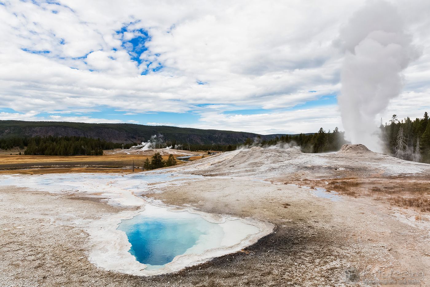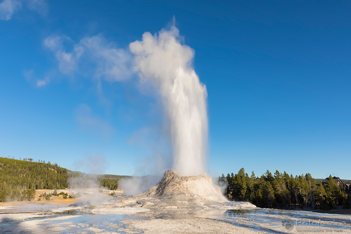 An diesem Morgen suchten wir immer wieder den Firehole Drive auf, denn unser Freund, der Great Fontaine Geysir, sollte zwischen 7.00 Und 9.00 Uhr morgens ausbrechen. Doch außer zähem Nebel, der sich auf diesem Weg besonders hartnäckig zu halten schien, passierte gar nichts. Nachdem wir wieder einmal etwas durch die Gegend gefahren waren und ein paar Landschaftsaufnahmen gemacht hatten, war es dann soweit, um 8.15 Uhr liefen die Terrassen über. Wir parkten unser Auto und suchten uns einen schönen Platz zum Fotografieren. Doch der Nebel war so dicht, dass man ihn kaum vom Dampf unterscheiden konnte. Dank der kühlen Morgentemperaturen dampfte der Geysir gleich noch mehr und wir sahen gar nichts. Doch wir waren guter Dinge und hofften, dass der Nebel sich wenigstens etwas lichtete. Die Sonne kam immer wieder etwas durch. Als er ausbrach, rauchte er noch mehr und wir hörten eigentlich mehr, als wir sahen oder fotografieren konnten, aber gerade das war sehr beeindruckend. Er zischte und blubberte und wir hörten das Wasser spritzen und auf dem Boden aufkommen. Das war trotz eingeschränkter Sicht ein wirklich tolles Erlebnis und der Rauch ging weit in den Himmel hinauf. Während Chris noch versuchte, ein paar Bilder zu machen, ging ich schon mal zum White Dome Geysir, der natürlich wunderschön ausbrach, während ich noch auf dem Weg zu ihm war. Doch auch aus der Entfernung war er toll anzuschauen, die Fontaine ging steil nach oben und auch er dampfte und rauchte nur so. An diesem Morgen war es überall sehr aktiv in diesem Gebiet, selbst aus namenlosen Geysiren schossen kleine Fontänen in die Höhe und es dampfte viel mehr als sonst.