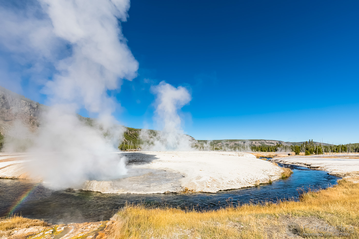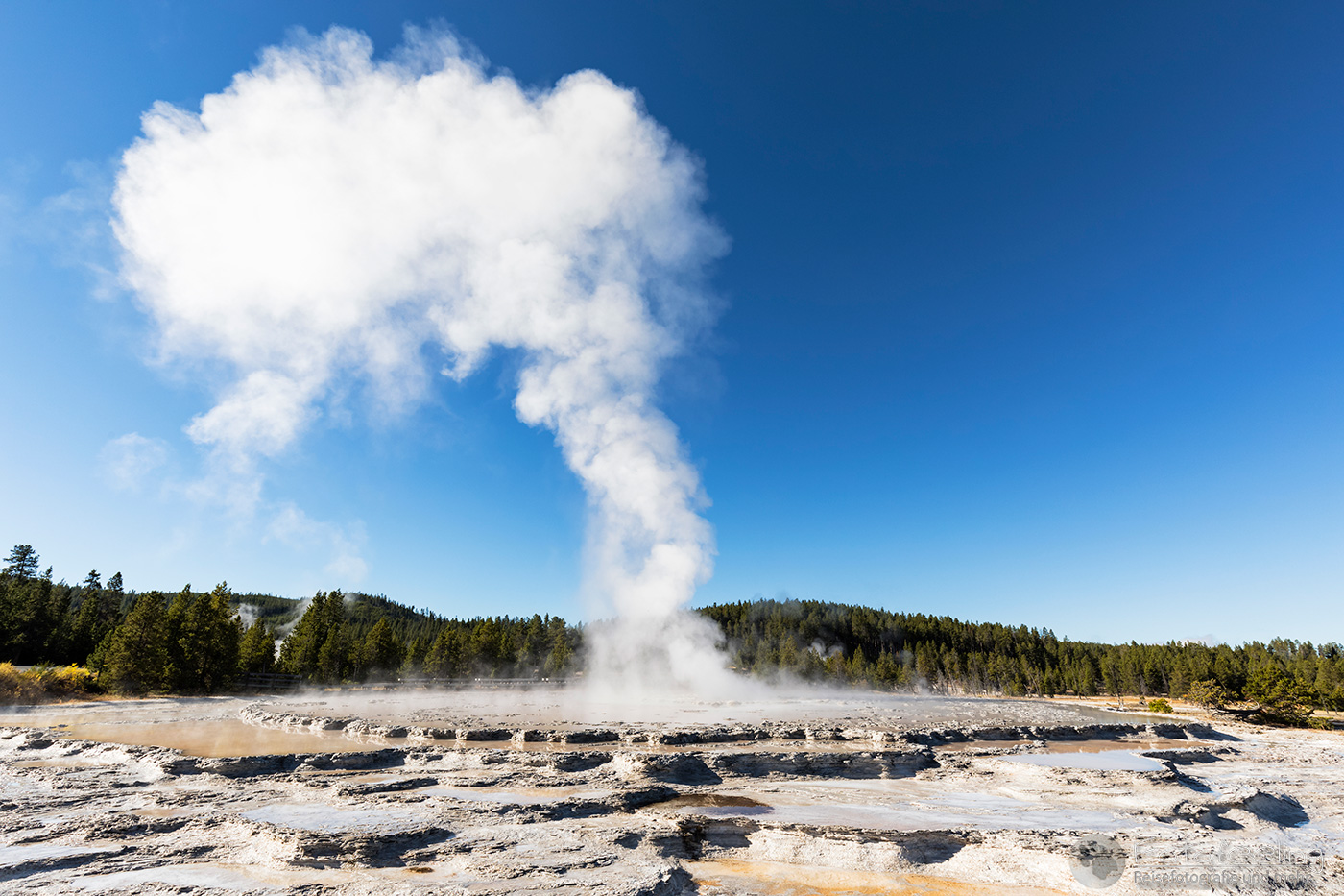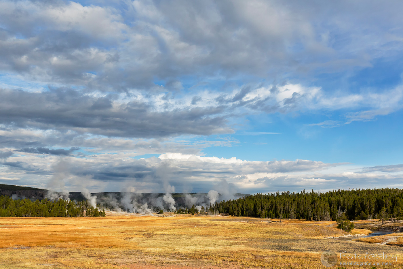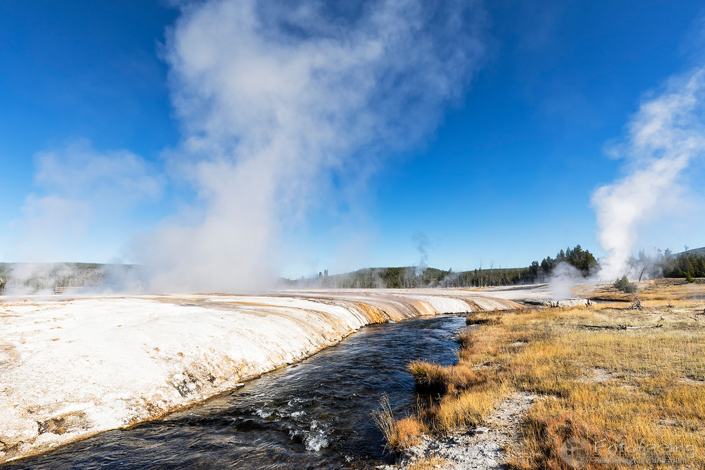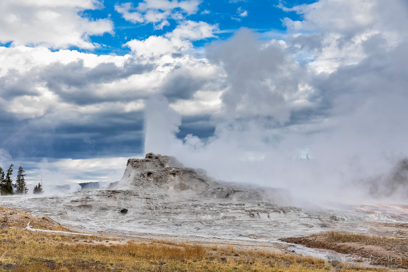 An diesem Morgen suchten wir immer wieder den Firehole Drive auf, denn unser Freund, der Great Fontaine Geysir, sollte zwischen 7.00 Und 9.00 Uhr morgens ausbrechen. Doch außer zähem Nebel, der sich auf diesem Weg besonders hartnäckig zu halten schien, passierte gar nichts. Nachdem wir wieder einmal etwas durch die Gegend gefahren waren und ein paar Landschaftsaufnahmen gemacht hatten, war es dann soweit, um 8.15 Uhr liefen die Terrassen über. Wir parkten unser Auto und suchten uns einen schönen Platz zum Fotografieren. Doch der Nebel war so dicht, dass man ihn kaum vom Dampf unterscheiden konnte. Dank der kühlen Morgentemperaturen dampfte der Geysir gleich noch mehr und wir sahen gar nichts. Doch wir waren guter Dinge und hofften, dass der Nebel sich wenigstens etwas lichtete. Die Sonne kam immer wieder etwas durch. Als er ausbrach, rauchte er noch mehr und wir hörten eigentlich mehr, als wir sahen oder fotografieren konnten, aber gerade das war sehr beeindruckend. Er zischte und blubberte und wir hörten das Wasser spritzen und auf dem Boden aufkommen. Das war trotz eingeschränkter Sicht ein wirklich tolles Erlebnis und der Rauch ging weit in den Himmel hinauf. Während Chris noch versuchte, ein paar Bilder zu machen, ging ich schon mal zum White Dome Geysir, der natürlich wunderschön ausbrach, während ich noch auf dem Weg zu ihm war. Doch auch aus der Entfernung war er toll anzuschauen, die Fontaine ging steil nach oben und auch er dampfte und rauchte nur so. An diesem Morgen war es überall sehr aktiv in diesem Gebiet, selbst aus namenlosen Geysiren schossen kleine Fontänen in die Höhe und es dampfte viel mehr als sonst.
