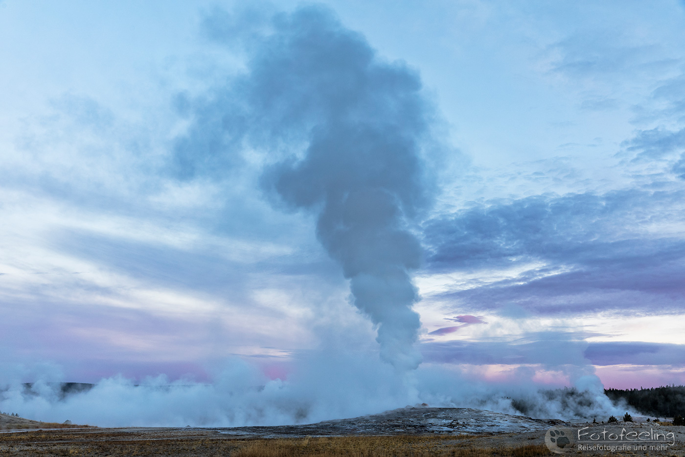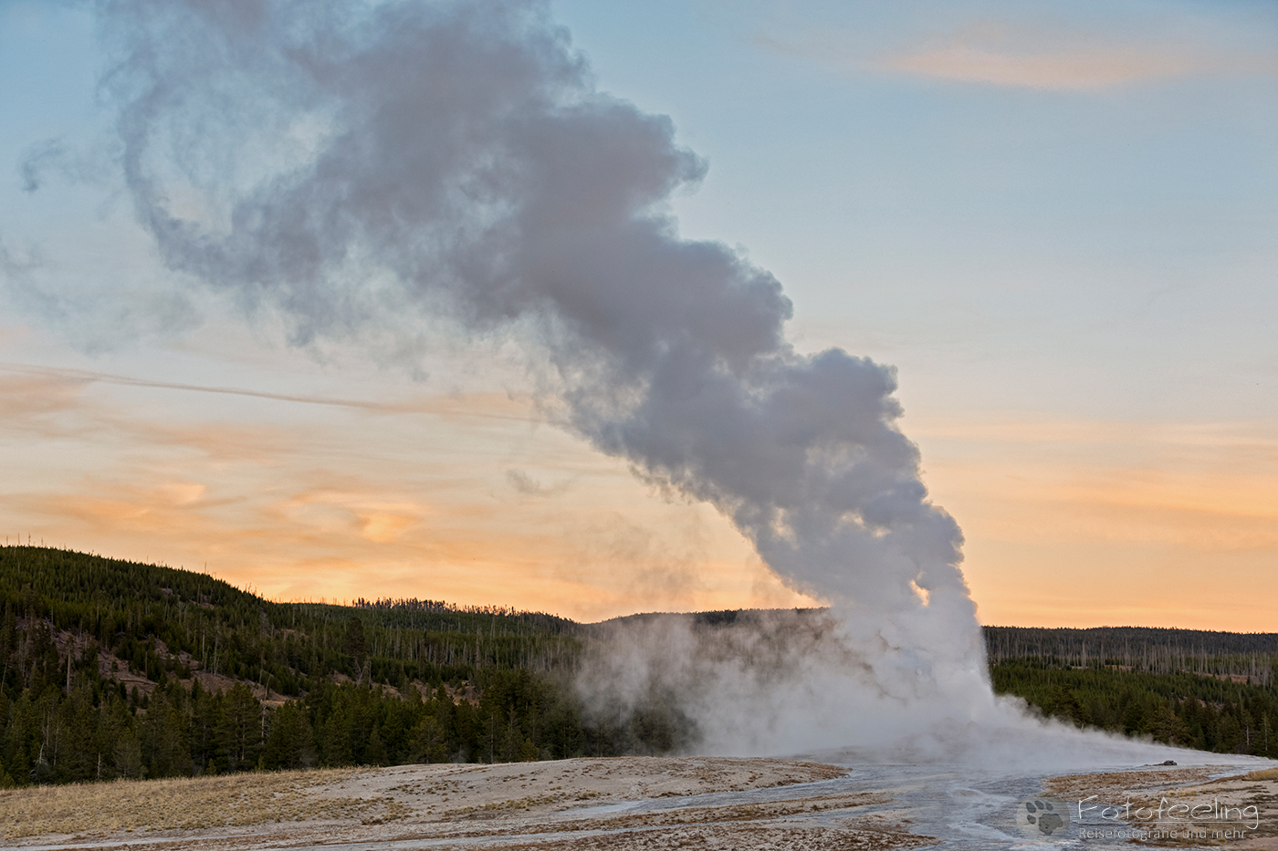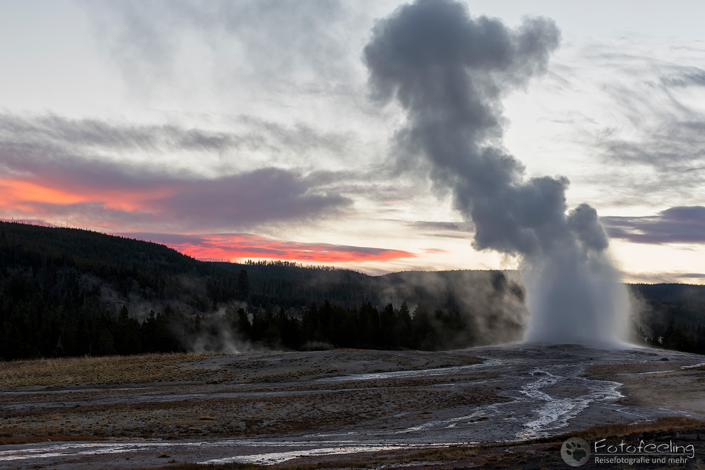 An diesem Morgen fuhren wir noch einmal zum Old Faithful, der diesmal 20 Minuten zu früh hochging, so dass wir gerade noch rechtzeitig ankamen für ein paar Bilder. Wir warteten einen weiteren Ausbruch ab, während langsam die Sonne aufging. Leider zog es immer weiter zu und schon bald war die Sonne hinter einer dunklen Wolkenwand verschwunden. Aber auch so war die Stimmung an den Geysiren toll. Wir wanderten weiter zum Castle und auch hier durften wir einen kurzen Ausbruch miterleben. Weiter ging es bis zum Morning Glory, der mit seinem gelben Rand und der tiefblauen Mitte einfach wunderschön aussah.
