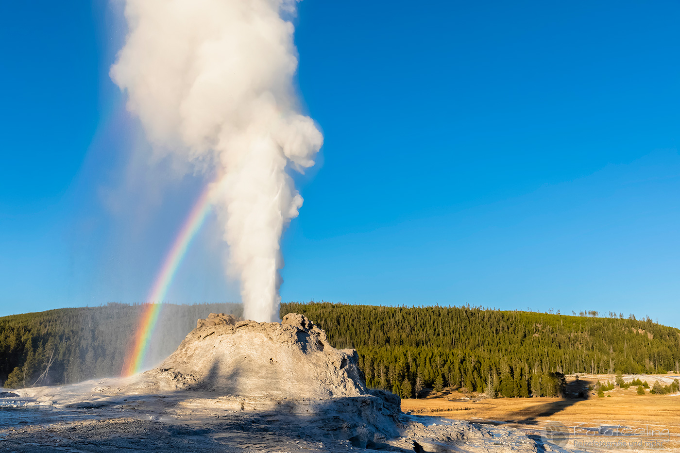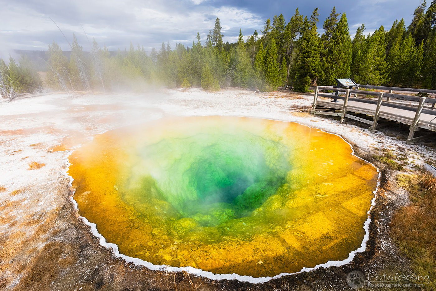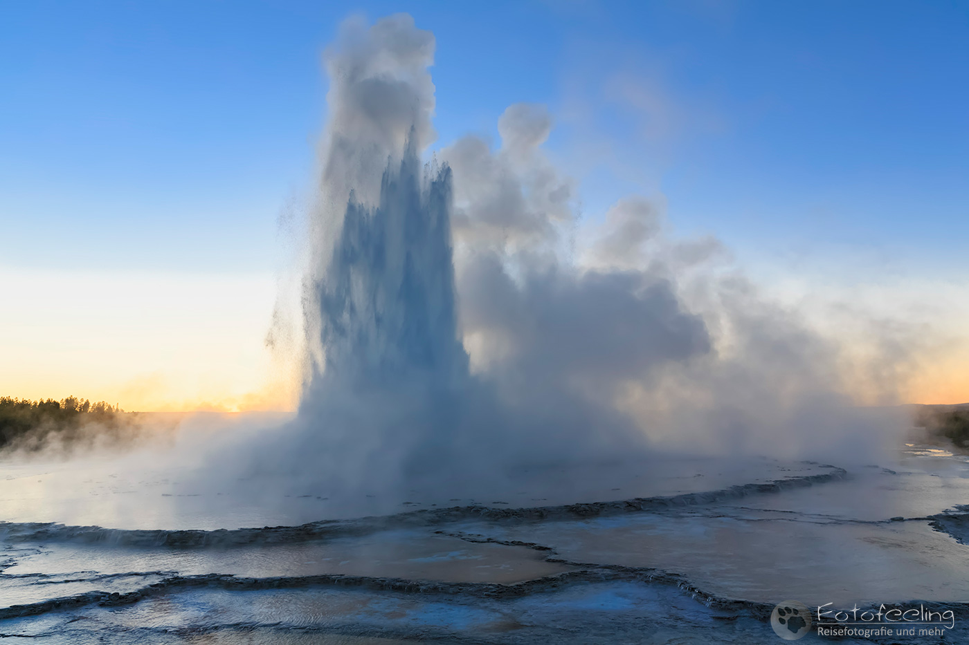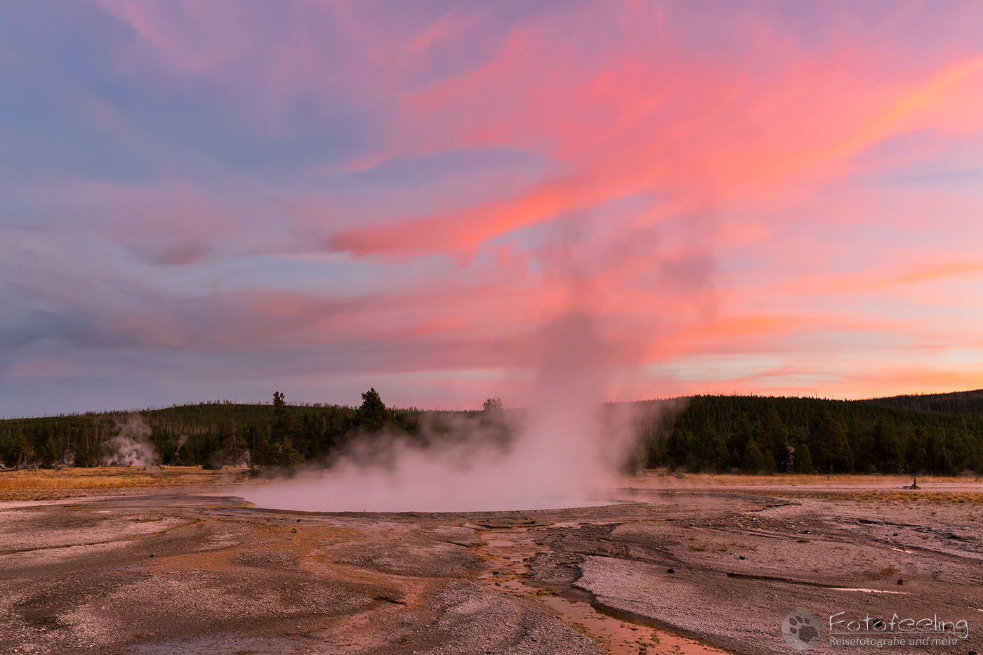 An diesem Morgen fuhren wir noch einmal zum Old Faithful, der diesmal 20 Minuten zu früh hochging, so dass wir gerade noch rechtzeitig ankamen für ein paar Bilder. Wir warteten einen weiteren Ausbruch ab, während langsam die Sonne aufging. Leider zog es immer weiter zu und schon bald war die Sonne hinter einer dunklen Wolkenwand verschwunden. Aber auch so war die Stimmung an den Geysiren toll. Wir wanderten weiter zum Castle und auch hier durften wir einen kurzen Ausbruch miterleben. Weiter ging es bis zum Morning Glory, der mit seinem gelben Rand und der tiefblauen Mitte einfach wunderschön aussah.