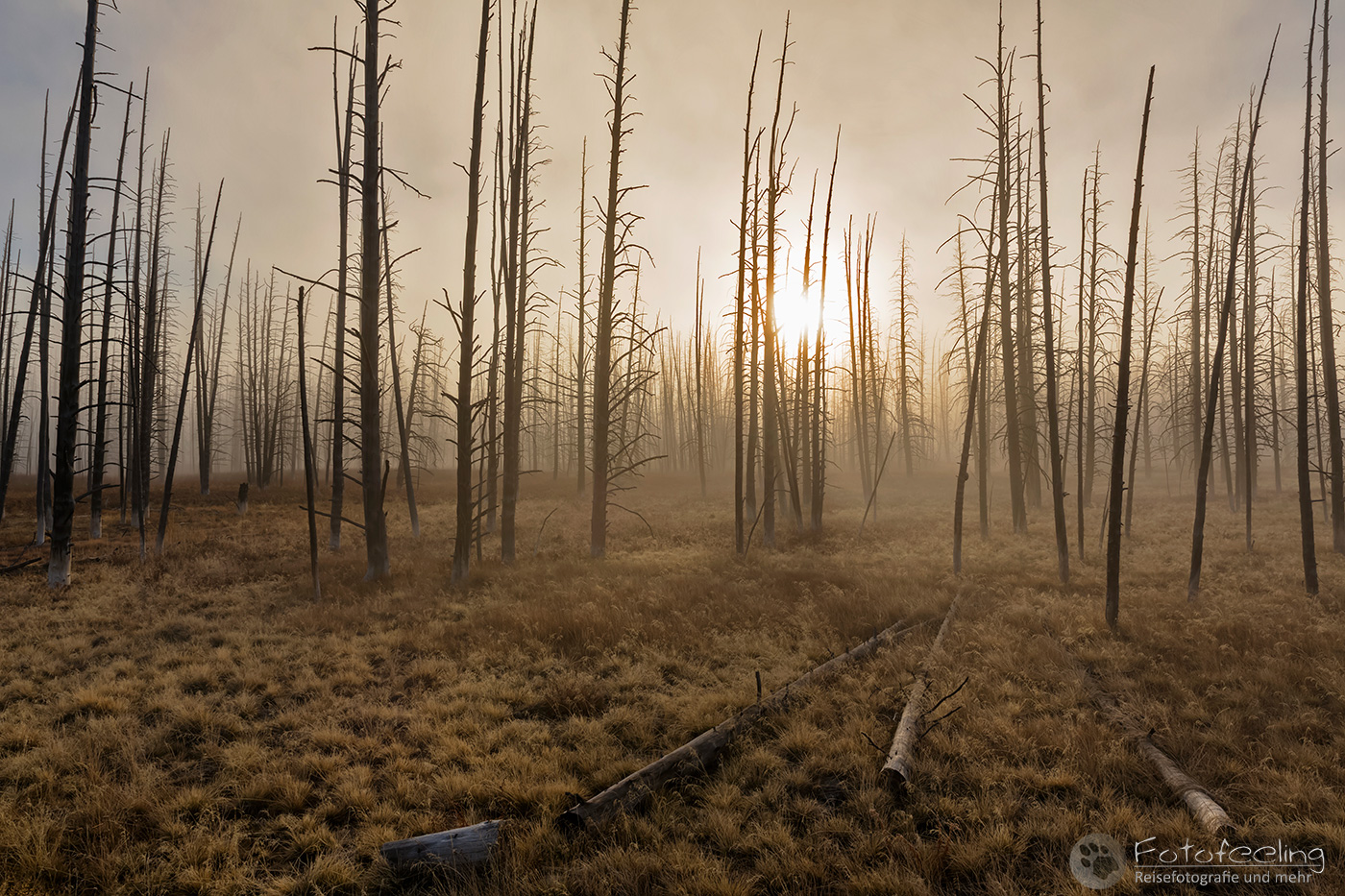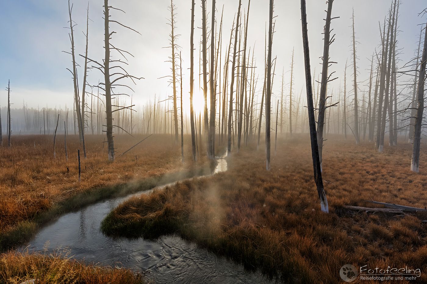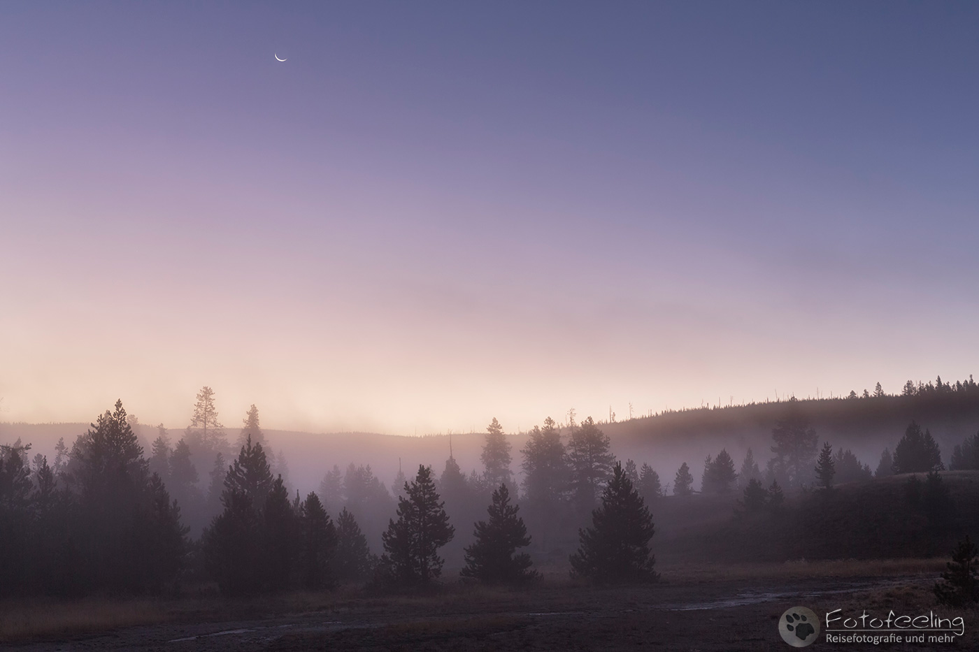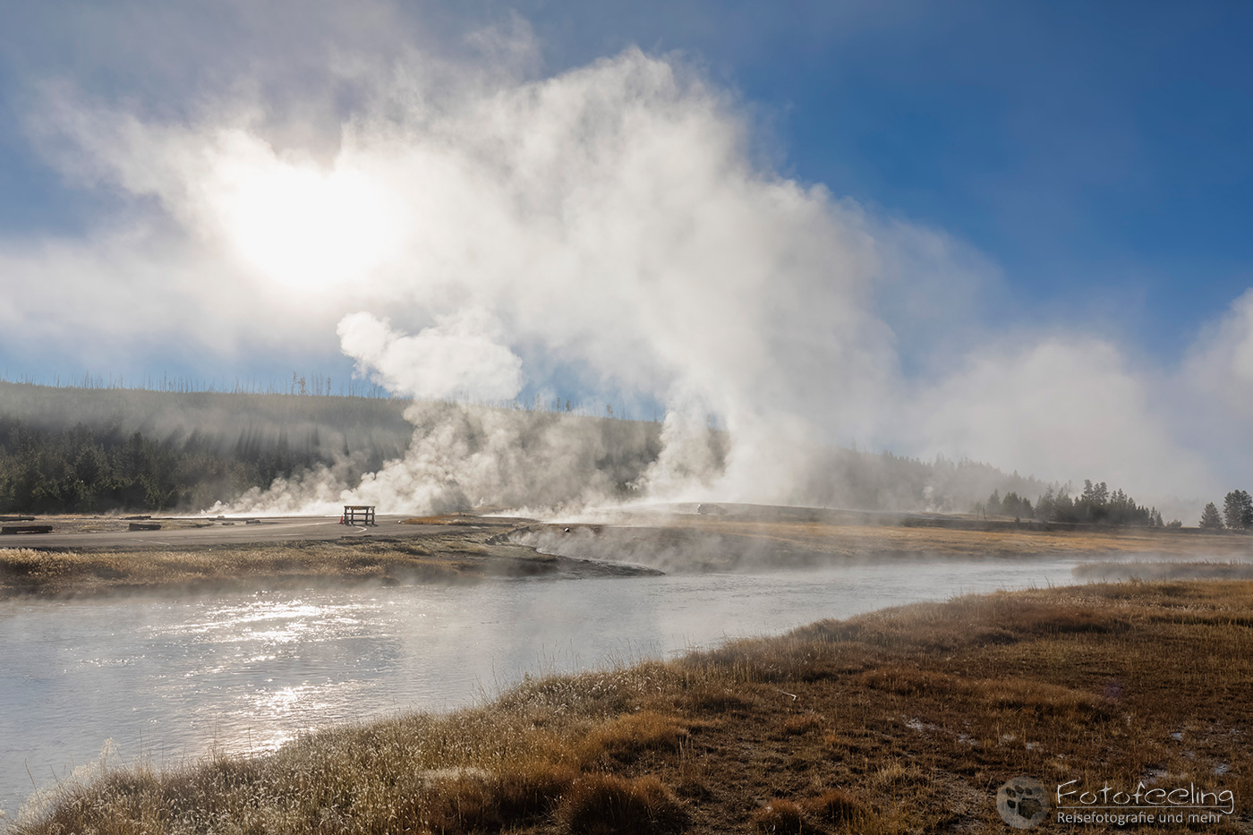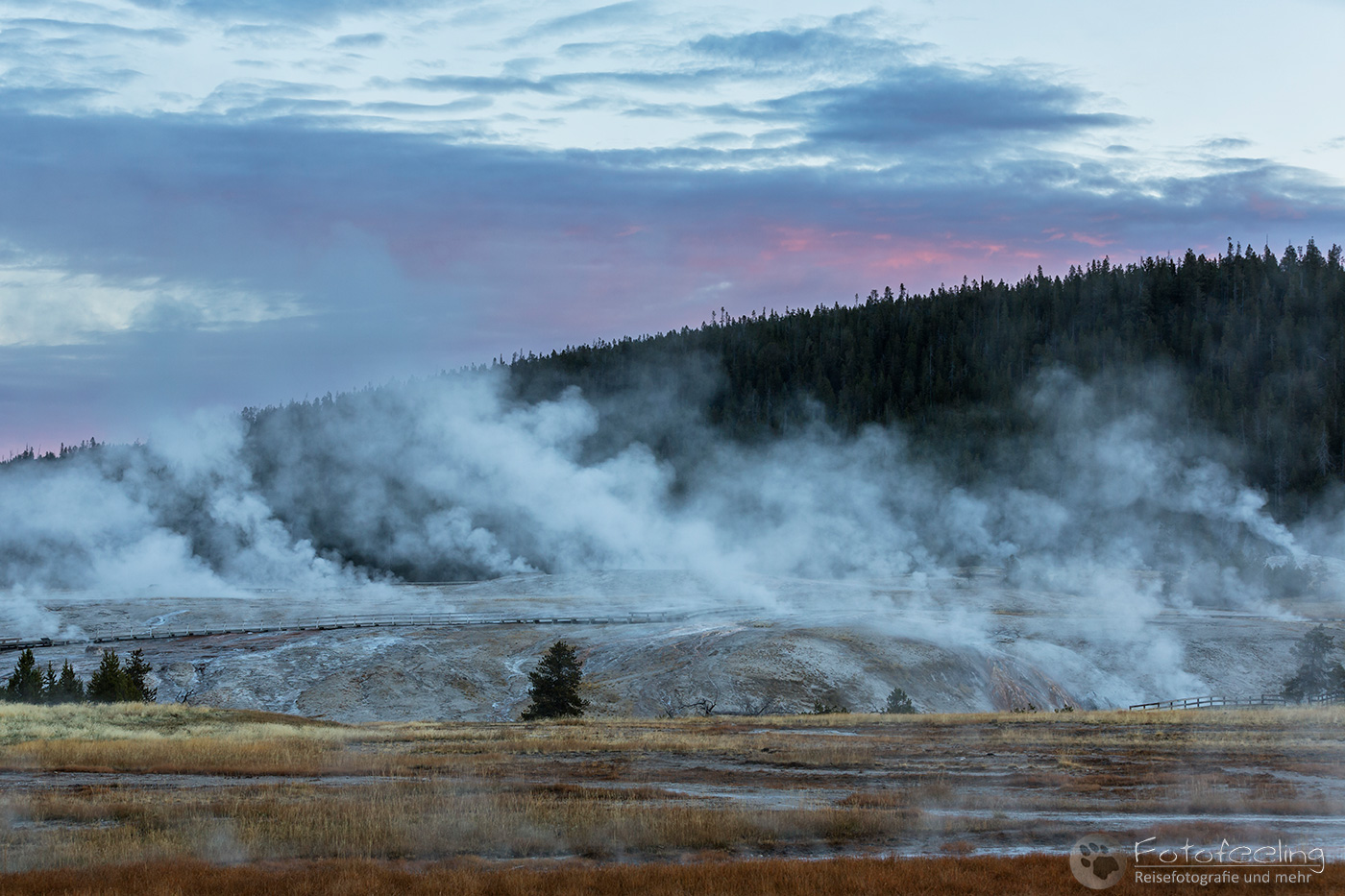 Bei -2 °C standen wir morgens auf, aber es fühlte sich nicht so kalt an. Wir fuhren zum Firehole Drive, denn diesen kurzen Weg mit einigen tollen Geysiren, mögen wir besonders gerne. Doch an diesem Morgen ärgerte uns zäher Nebel. Er war so dicht, dass wir rein gar nichts sahen und auch der Sonnenaufgang änderte nichts daran, außer dass es heller wurde.