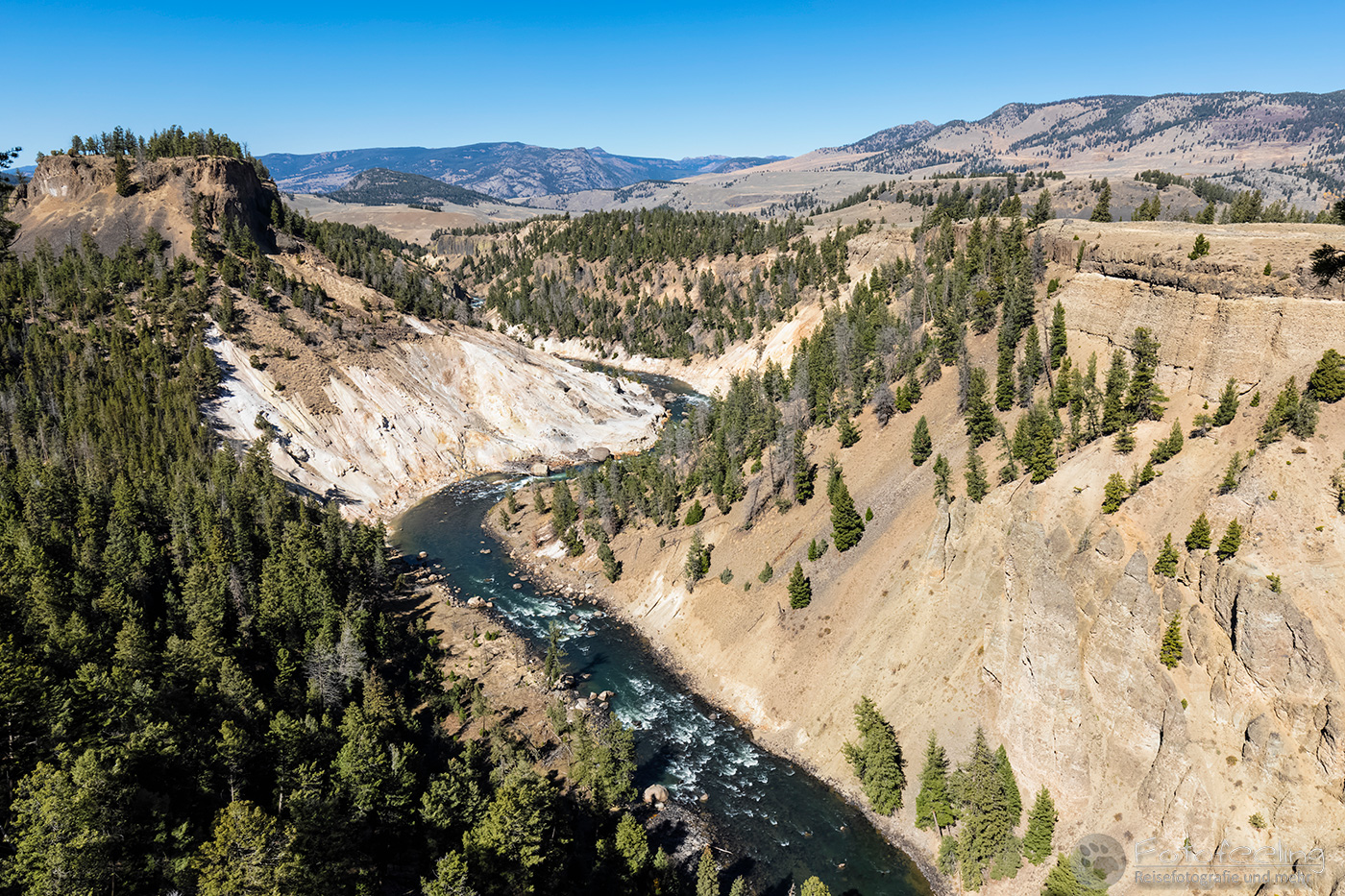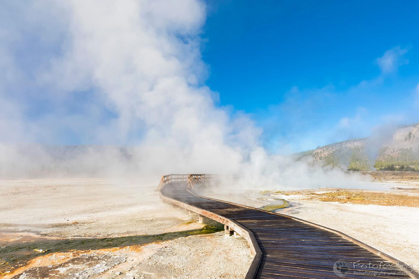 Wir machten noch einen kurzen Abstecher zum Midway Geysir Basin, wo wir wie am Vortag eine Runde über das Stegsystem gingen und die herrlichen Farben des Excelsior Geysir und der Grand Prismatic Spring genossen.