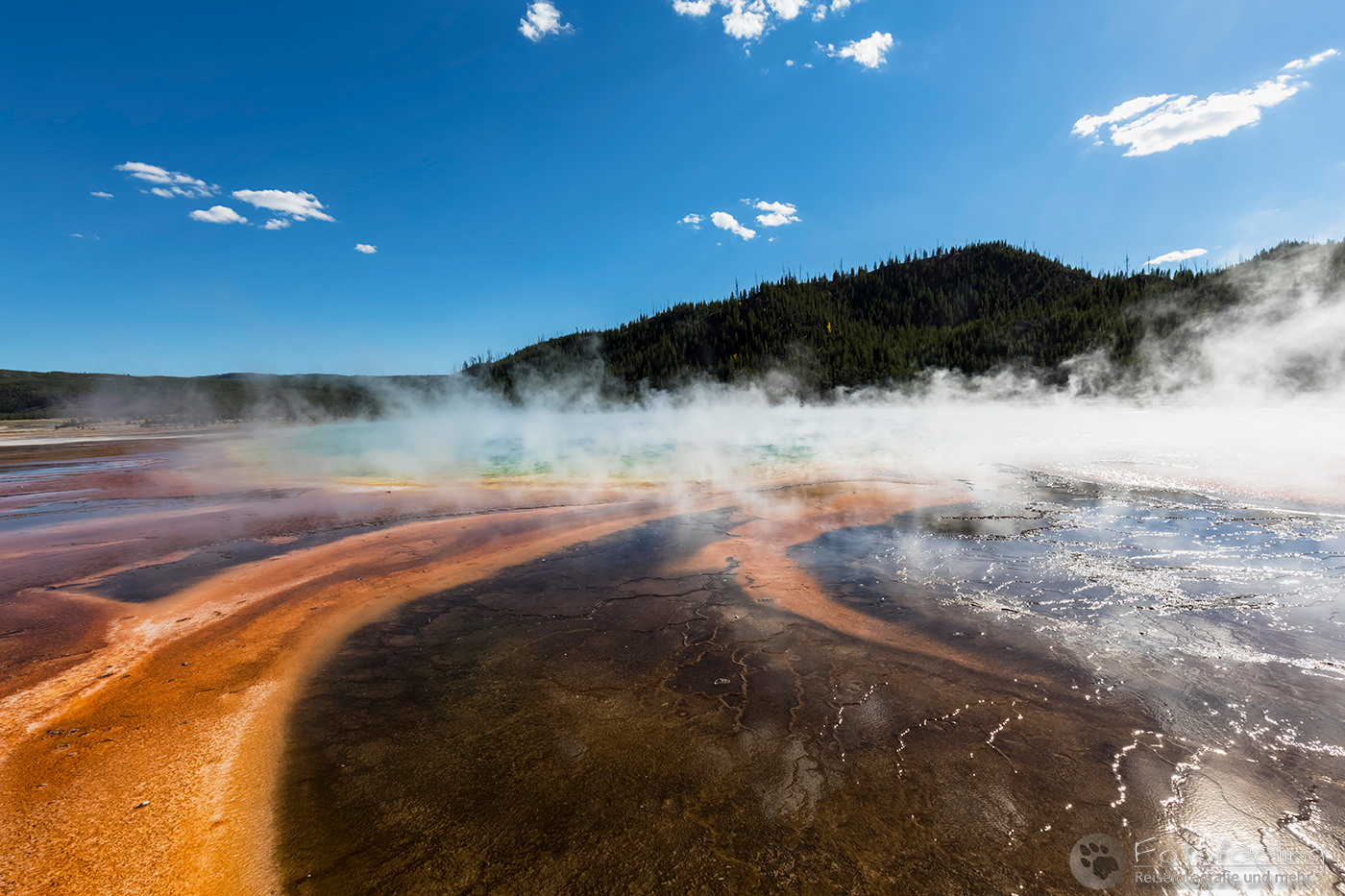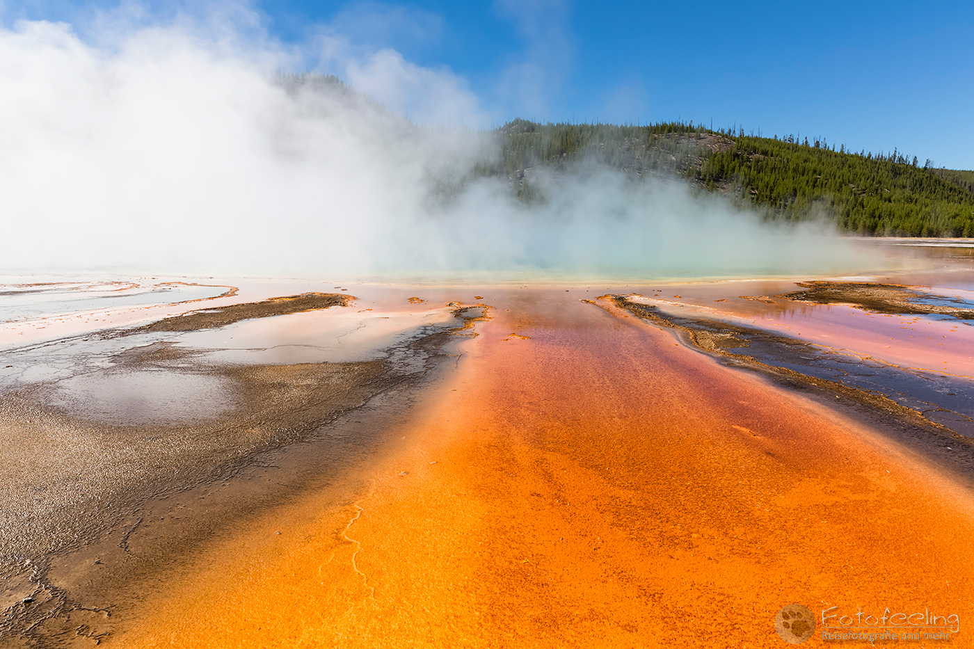 Danach versuchten wir unser Glück noch einmal am Midway Geysir Basin. Hier befindet sich neben dem Exelsior Geysir die bekannte Grand Prismatic Spring, eine der farbenfrohsten und größten Thermalquellen der USA. Ihr Becken ist ca. 75 × 91 m groß und ungefähr 49 m tief. In einer Minute fließen durchschnittlich 2000 Liter 71 °C heißen Wassers aus der Quelle. Die wundervollen Farben am Rand der Quelle stammen von einzelligen Mikroorganismen (Bakterien und Archaeen). Sie leuchten zwischen grün und rot was von dem Gehalt an Chlorophyll und Carotinoiden der Mikroorganismen abhängt. Im Zentrum der Quelle ist das Wasser wegen der hohen Temperaturen frei von Mikroorganismen. Die tiefblaue Färbung in der Mitte liegt an der Tiefe der Quelle und deren Wasserreinheit.
