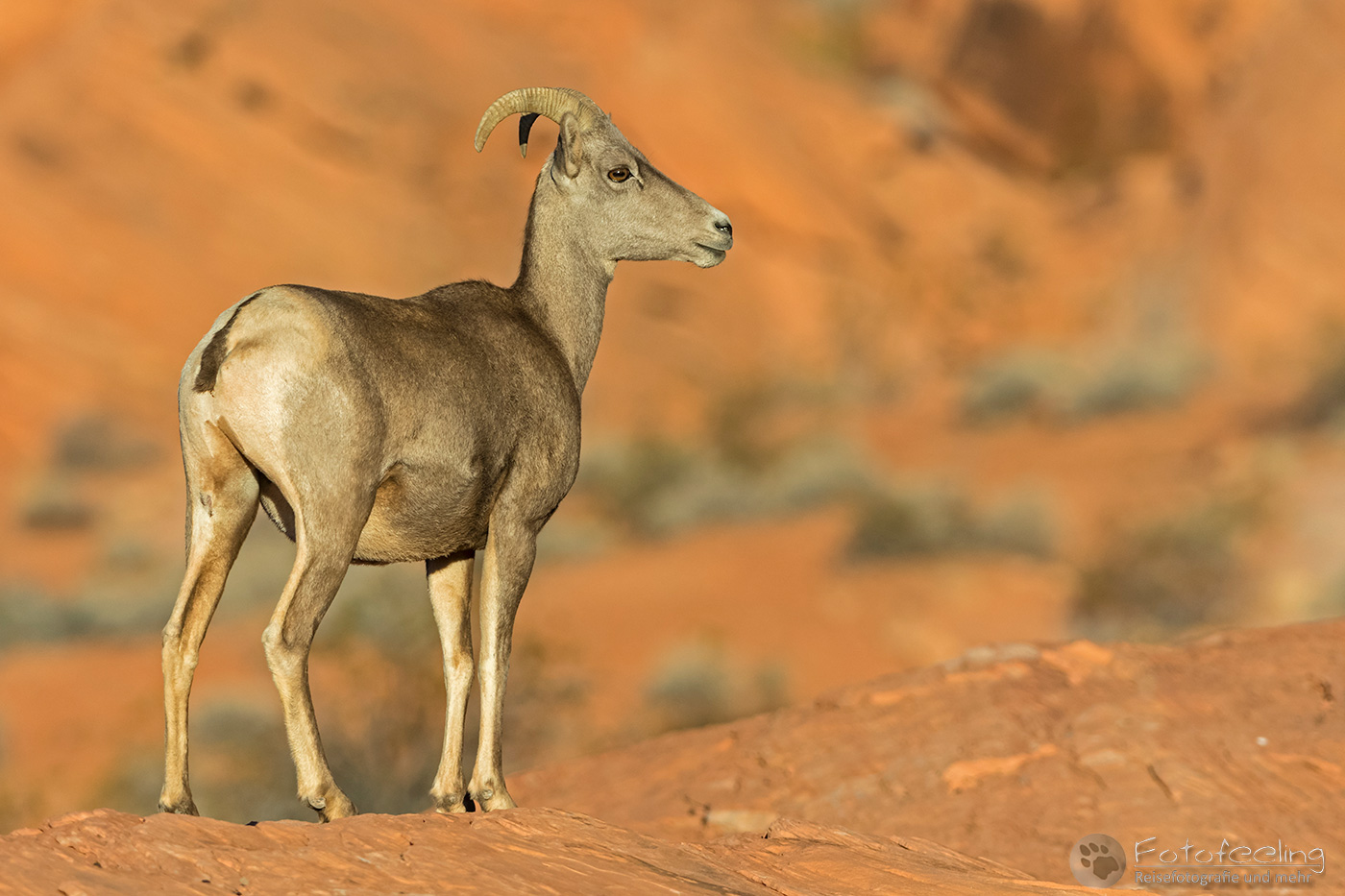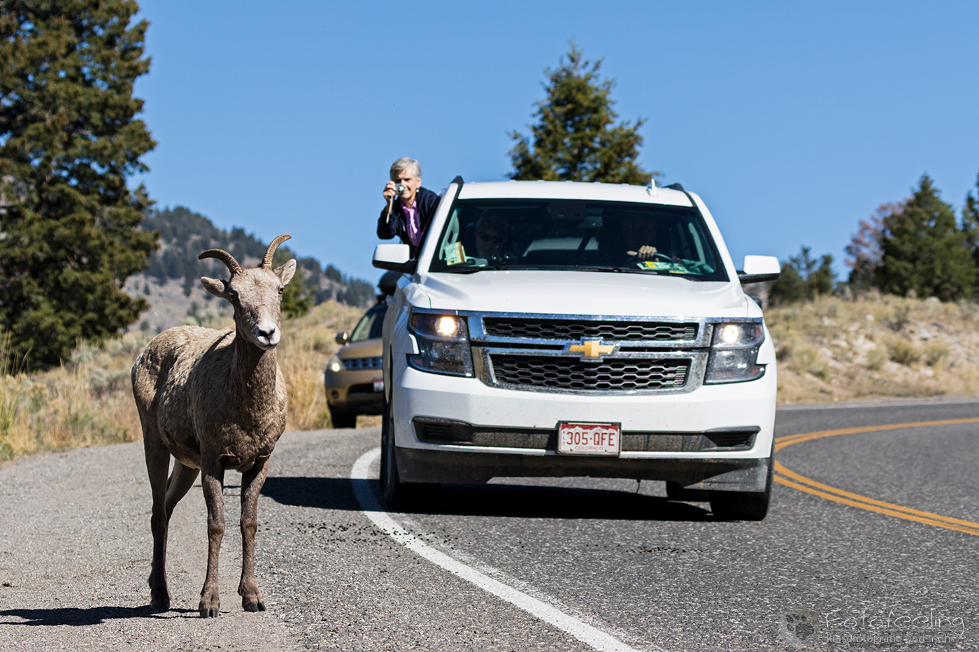 Mittags fuhren wir bei schönstem Sonnenschein und 20 °C an den beeindruckenden Gibon Falls vorbei und über den schneefreien Dunraven Pass (2700m) ins Lamar Valley. Ein paar Bisons grasten am Hang. Kurz vor dem Lamar Valley beobachten wir zwei Dickhornschafe (Ovis canadensis) mit einem Jungtier, die gemütlich am Straßenrand grasten.