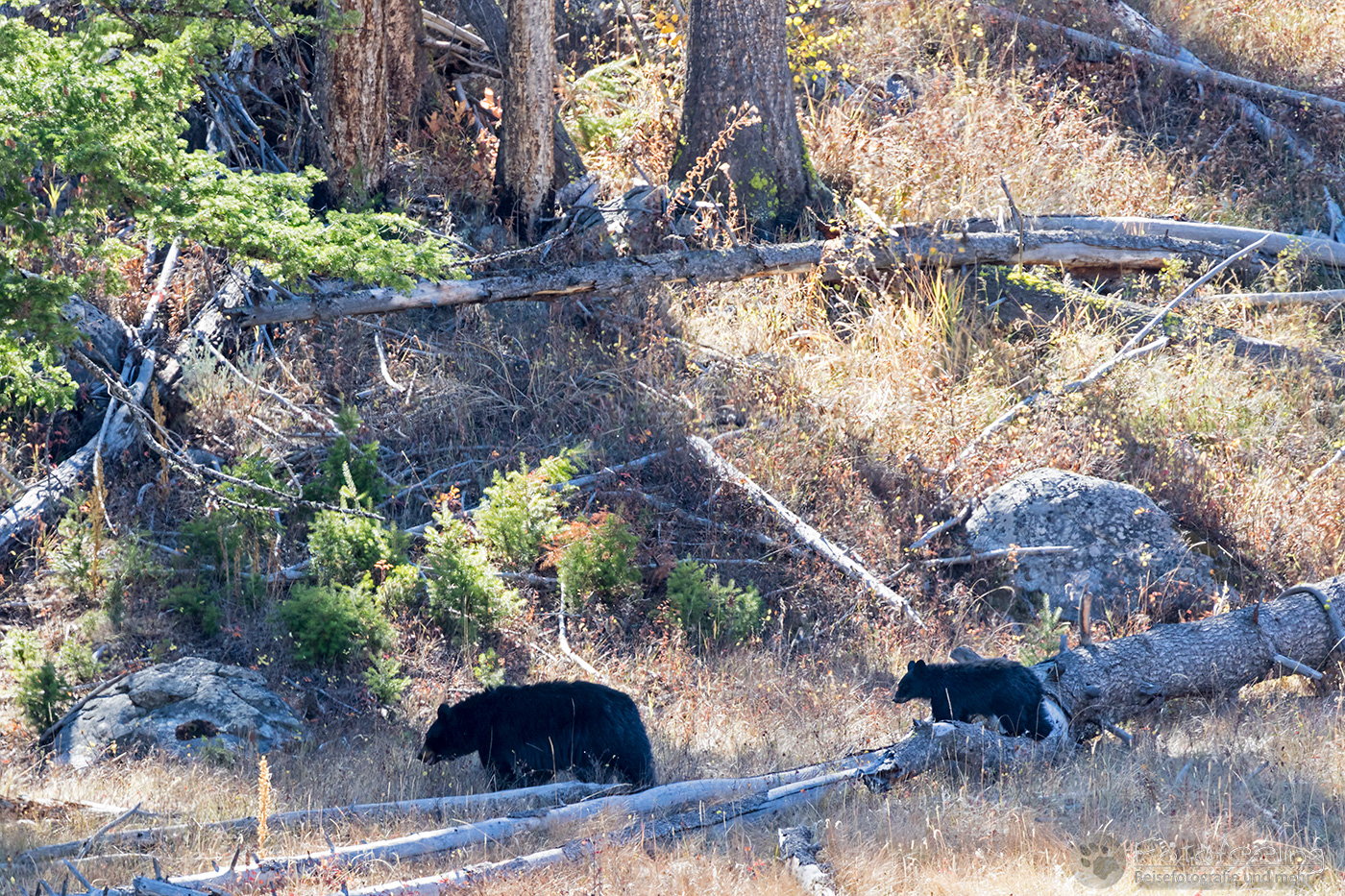 Als wir ins Lamar Valley kamen, fanden wir einen Massenauflauf vor. Ranger regelten den Verkehr und Autos über Autos standen am Straßenrand, während sich die Fahrer am Seitenrand tummelten und angestrengt einen Berghang hinauf schauten. Chris ergatterte eine Parklücke und wir gesellten uns zu den Schaulustigen und starrten ebenfalls in die gleiche Richtung. Dort hatte es sich eine Schwarzbärin mit zwei Jungen gemütlich gemacht, die nach einem Schläfchen die Umgebung erkundeten. Die Bären waren sehr weit entfernt und nur mit dem Fernglas konnten wir die drei einigermaßen erkennen. Als die Bärin kurz die Richtung änderte und auf uns zu kam, wurde unser Ranger unruhig und bat uns, zu den Autos zu gehen, aber zum Glück überlegte sie es sich anders und blieb auf dem Hang. Die Kleinen spielten unterdessen mit allem, was sie finden konnten. Sie kletterten unter Wurzeln hindurch und erklommen umgefallene Bäume, auf denen sie balancierten. Die Mutter hatte die Strolche immer im Auge und war sehr wachsam.