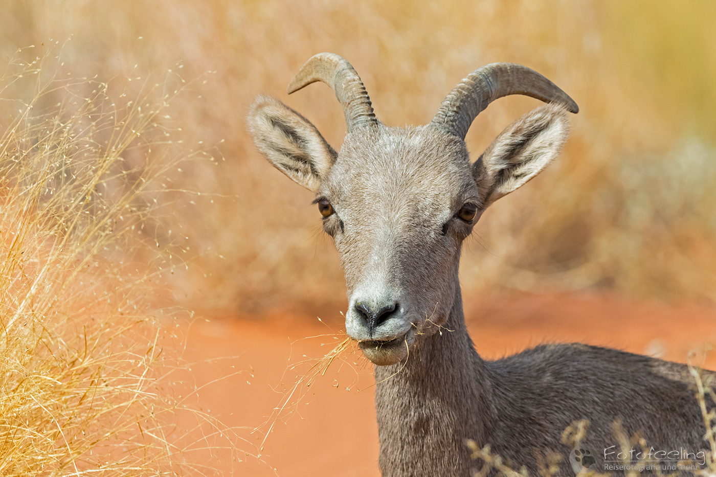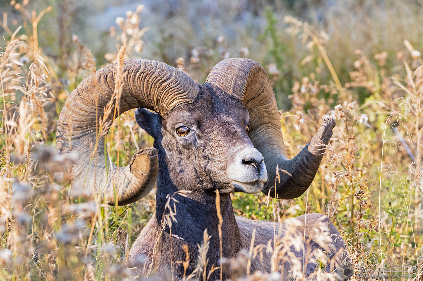 Auf dem Rückweg blockierten mal wieder Autos die Straße und Ranger regelten den Verkehr. Der Grund waren diesmal Dickhornschafe, die direkt neben der Straße im Gras lagen und das Geschehen um sich herum mit großen Augen sehr gelassen betrachteten.