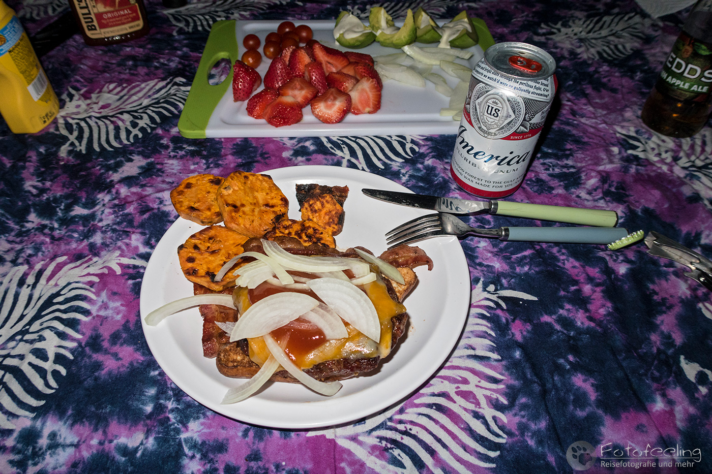 Zum Abschluss dieses langen Tages grillten wir Burger auf unserer Campsite, die einfach nur klasse wurden. Dazu gab es Käse, Erdbeeren und Avocado.