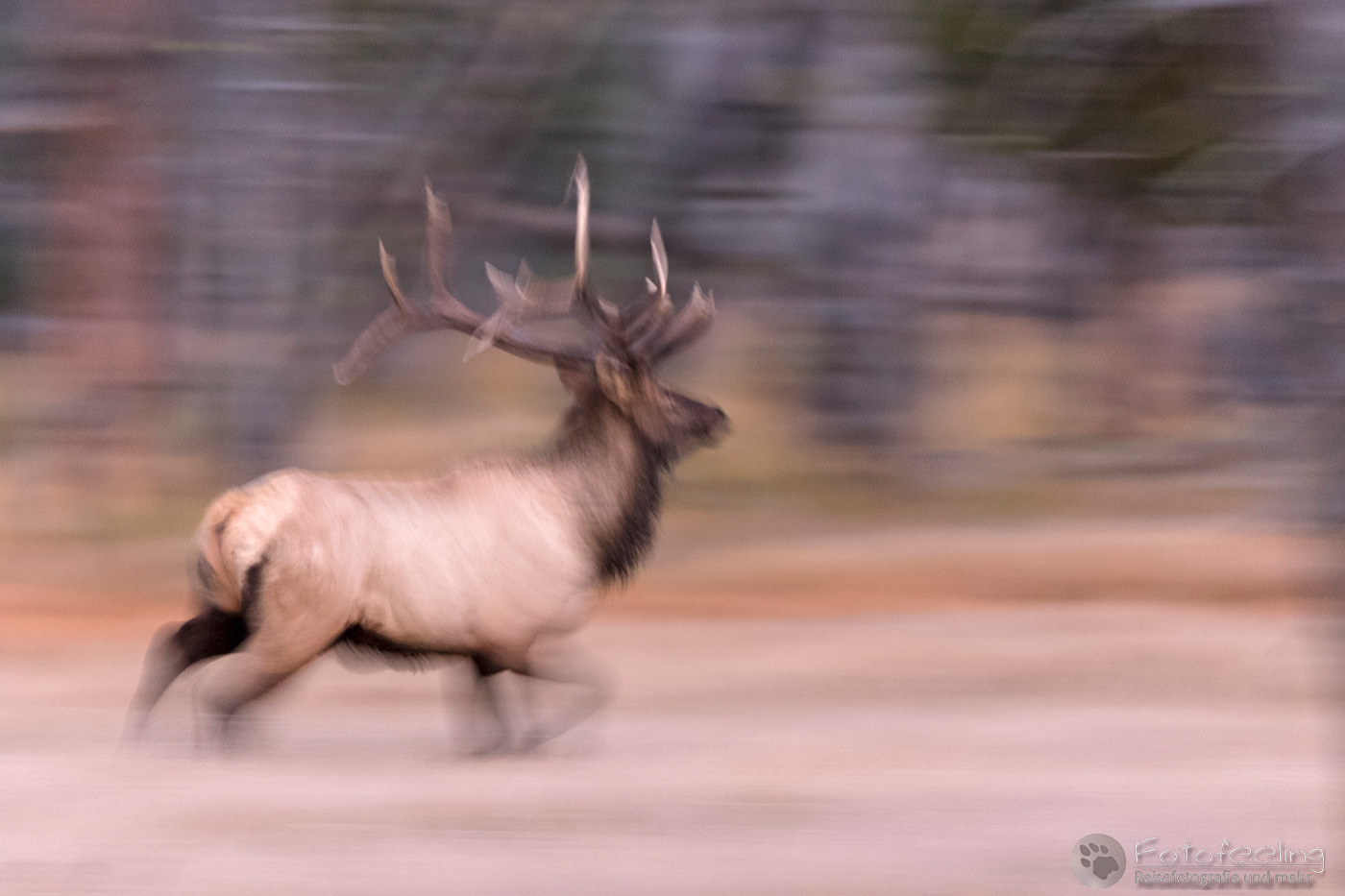 Bei -2 °C starteten wir wieder in den Morgen. Auch heute war viel Nebel, der die Landschaft in ein helles Tuch aus Gaze hüllte. Doch an diesem Morgen war der Nebel lichter und wir suchten nach einem schönen Platz, um ein paar Aufnahmen zu machen. Unterwegs sahen wir mächtige Wapitis (Elks) auf einer Wiese und ein kräftiger Hirsch lief stolz vor seinen Mädels her.