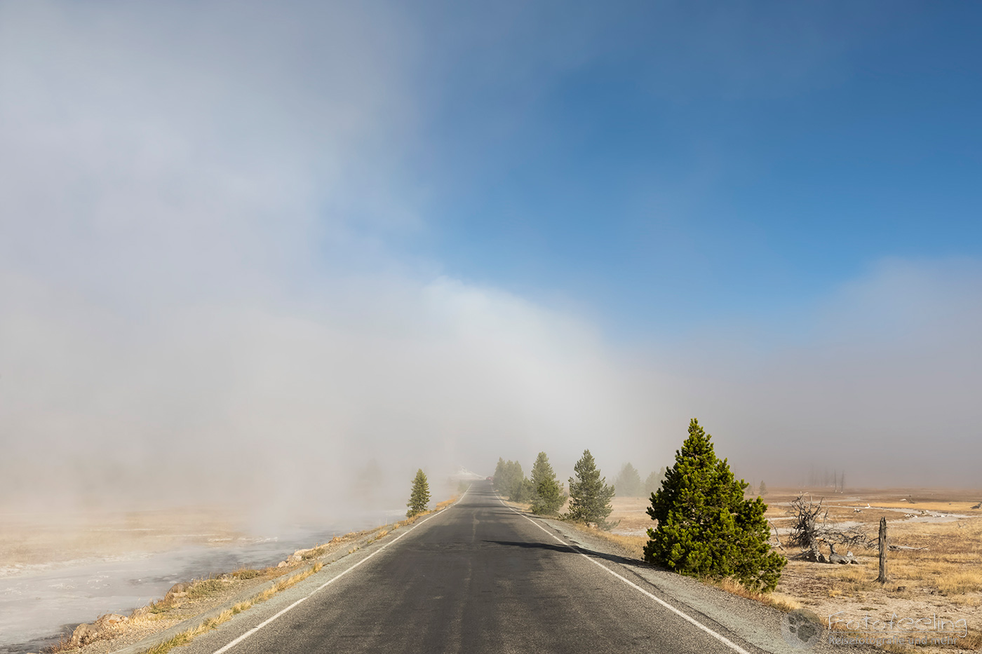 Wir entdeckten ein Wäldchen mit abgestorbenen Bäumen und einem kleinen dampfenden Flusslauf. Während Chris das Auto parkte, machte ich schon ein paar Aufnahmen. Aus dem Augenwinkel sah ich Chris zu dem Flusslauf gehen und fotografieren. Ich gesellte mich zu ihm und sagte spaßig: „Du suchst dir auch immer die schönsten Plätze zum Fotografieren aus.“ Er reagierte überhaupt nicht, da wurde ich stutzig und schaute genauer hin und bemerkte, dass es ein völlig fremder Mann war, den ich da angequatscht hatte und der sicherlich und glücklicherweise überhaupt kein Deutsch verstand. Der muss gedacht haben, dass ich vollkommen irre bin, denn anfangs rückte ich ihm ziemlich auf die Pelle, quatschte in einer fremden Sprache wild drauf los und dann konnte ich mich kaum noch halten vor Lachen. Ich kicherte immer noch, als Chris endlich auftauchte und ich ihm die Story berichten konnte. Unser stummer Fremder zog langsam von dannen, aber wir konnten ihm noch einen Coyoten zeigen, der gerade auf der anderen Straßenseite entlanglief.