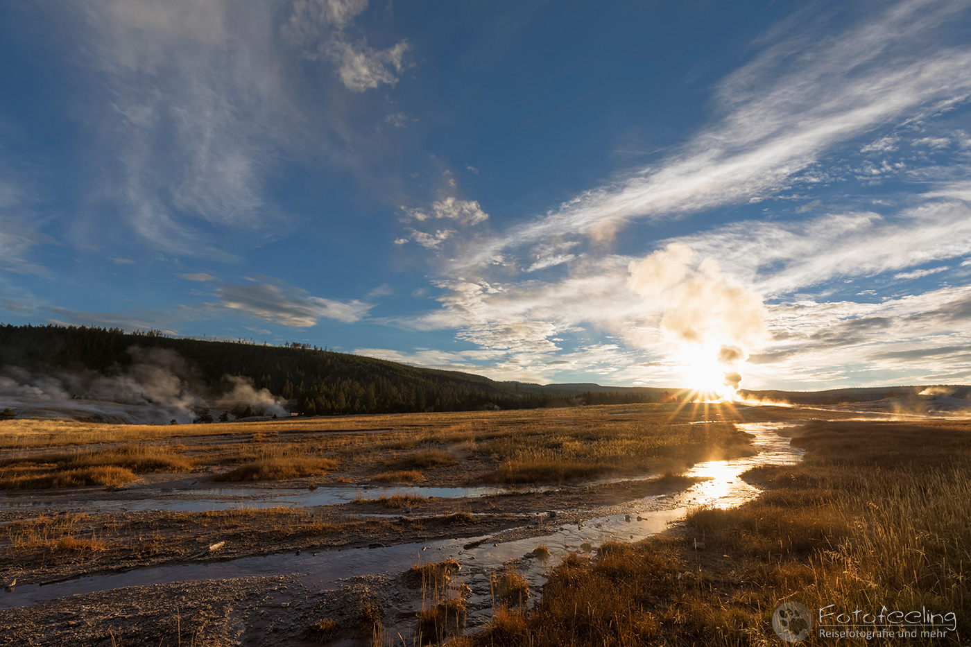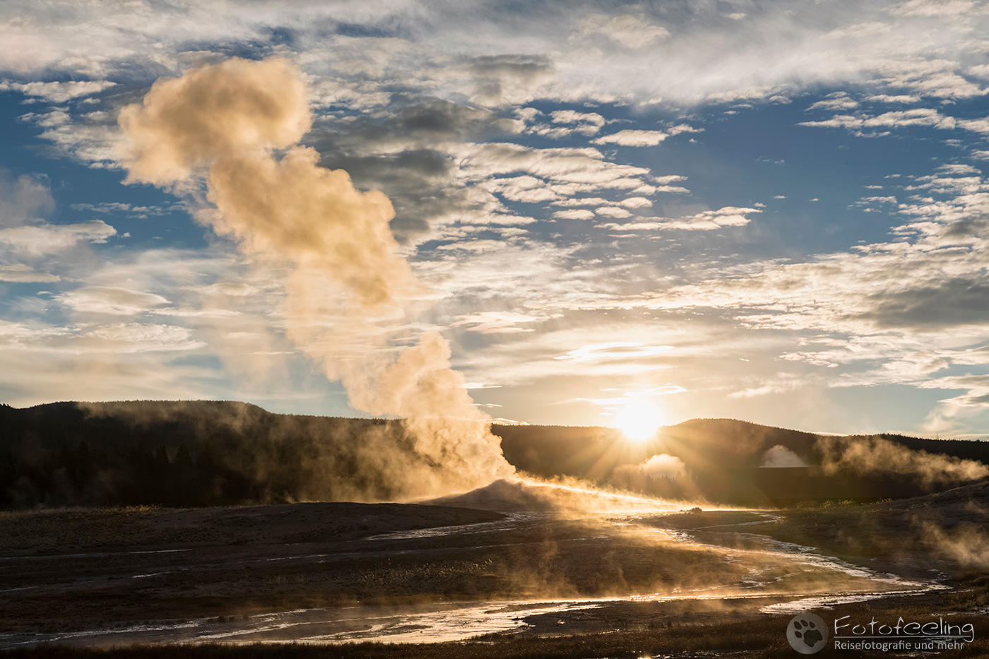 Wir wanderten noch an unserem Liebling dem Castle Geysir vorbei und landeten schließlich am Morning Glory. Die Sonne verschwand gerade hinter den Bergen. Sanft stieg der Dampf des warmen Wassers in die Höhe. Auch jetzt im Gegenlicht war der Morning Glory einfach schön anzuschauen und wir genossen die letzten Sonnenstrahlen hier, ehe es in der Dämmerung zurück zum Auto ging.