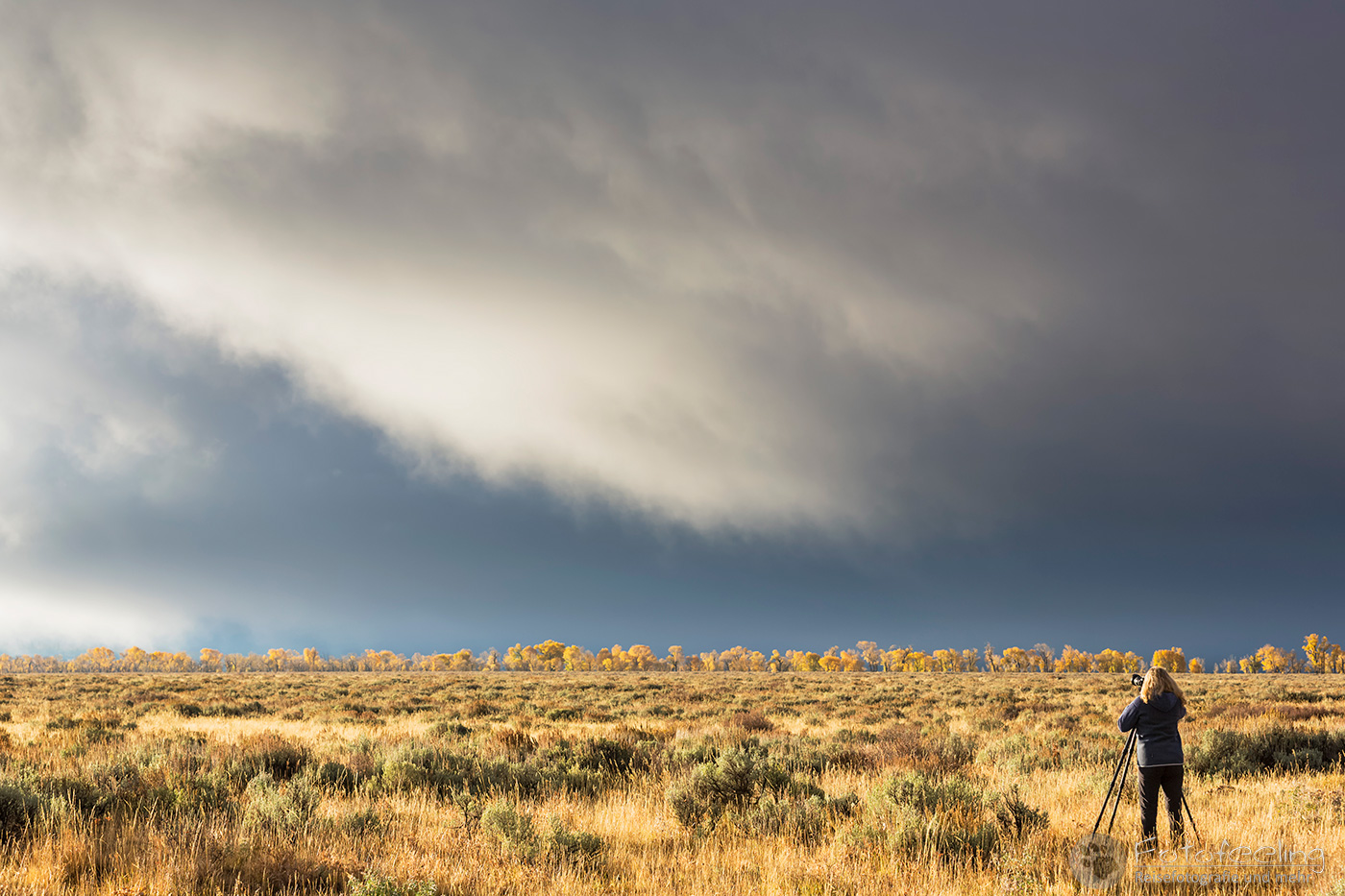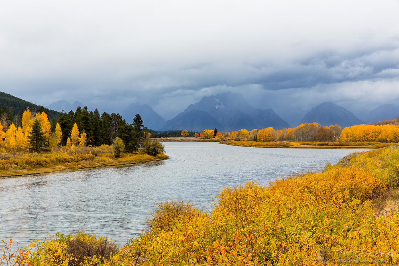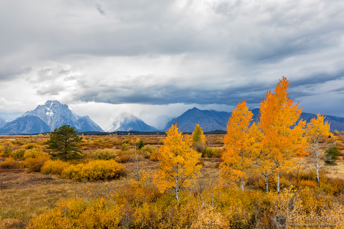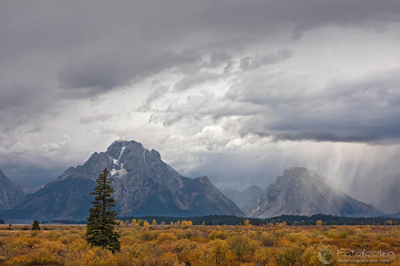 Unterwegs zu den Tetons wurde das Wetter immer schlechter und heftiger Regen peitscht auf die Scheibe. Eine Gewitterfront stand über den Bergen und der Jackson Lake war aufgewühlt. Kleine Schaumkronen tanzen auf den Wellen. Zum Glück hatte der Regen aufgehört, so dass wir ein paar Bilder machen konnten. Das gelbe Laub strahlte bei dem Wetter richtig, aber wir sahen auch, dass in den letzten Tagen viel Laub von den Bäumen gefallen war. Der Herbst war ziemlich durch.
