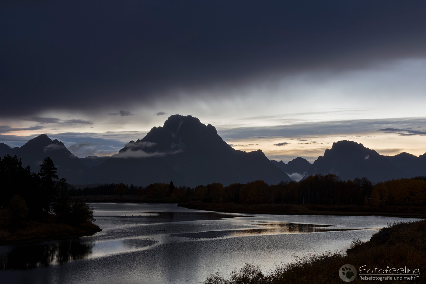 Am späteren Nachtmittag hielten wir noch kurz am Oxbow Bend, wo es wieder stark regnete und das Wasser ebenfalls sehr aufgewühlt war. So fuhren wir noch ein wenig durch den Park und stellten uns zum Sonnenuntergang an den Oxbow Bend.