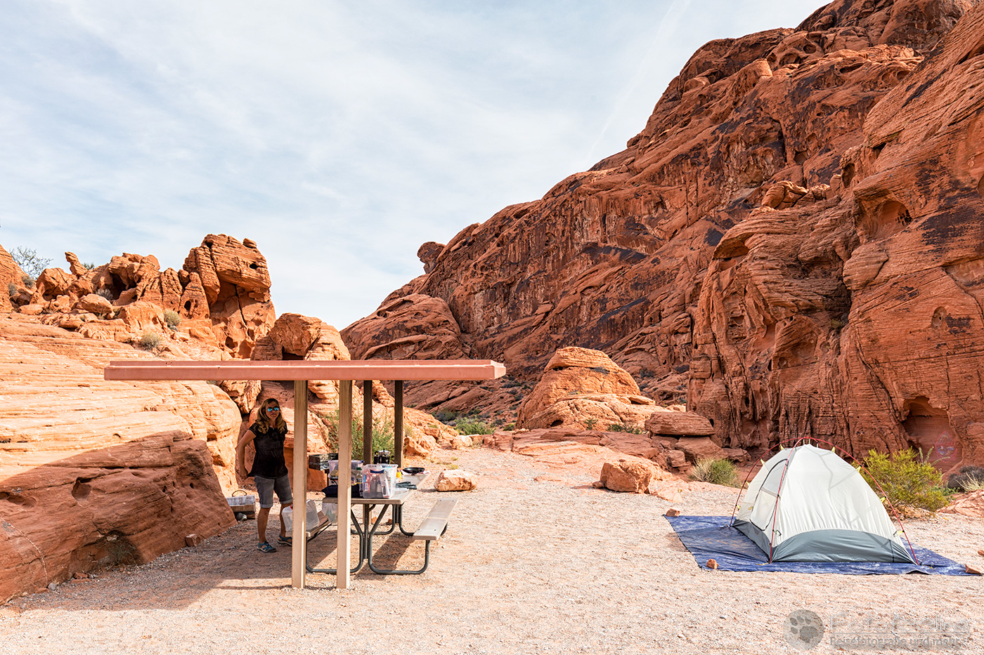 Als wir abends zurück auf die Campsite kamen, war sie von 6 Chinesen belegt. Uns blieb der Mund offen stehen, denn das war wirklich dreist. Zwei Zelte waren aufgebaut und die Autos standen wie selbstverständlich in der zugehörigen Parkbucht. Als wir ausstiegen kam sofort eine Chinesin auf uns zu. Wir zeigten ihr unsere Buchung und ließen uns ihre zeigen. Da löste sich das Rätsel, denn die Mädels hatten die Campsite E 173 direkt daneben. So tauschten wir kurzerhand die Stellplätze und hatten jetzt eine super gute ruhige und lichtgeschützte Fläche, wo wir unser Zelt aufbauten. Das Mädchen half mir sogar noch mit beim Zeltaufbau, während Chris das Feuer machte.