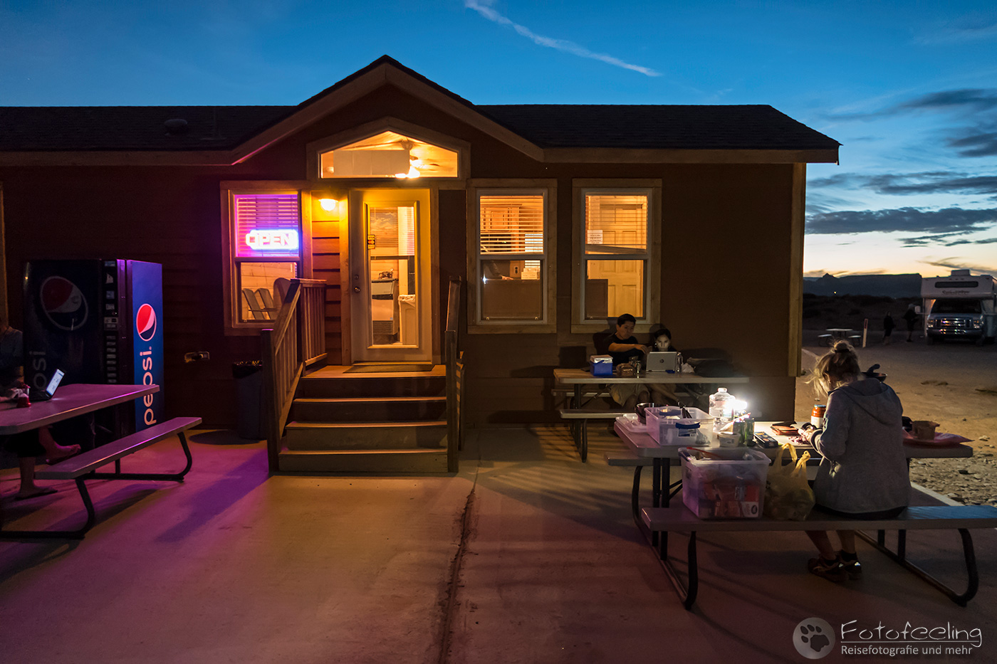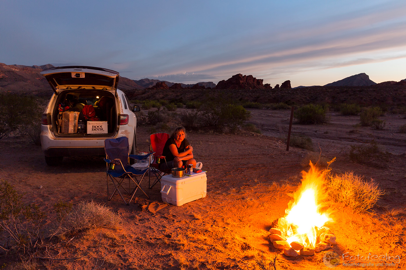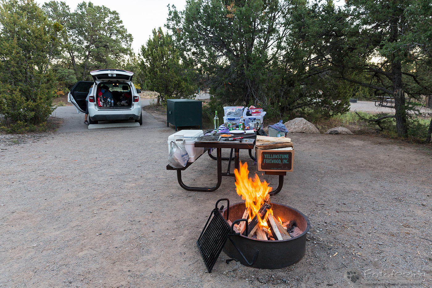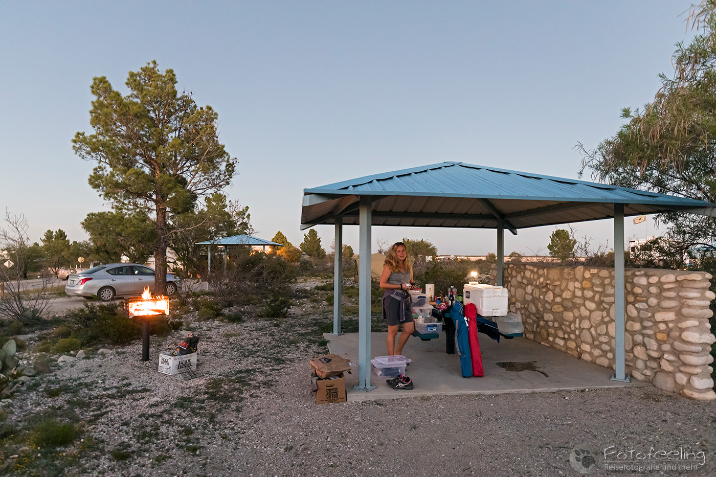 Mit der Dämmerung kam auch die Kälte zurück und wir suchten unsere Campsite auf dem Hügel auf. Zum Glück war unsere kleine Nische noch frei. Mittlerweile hatten wir auch den offiziellen Weg gefunden und mussten nicht mehr umständlich über die Ranch fahren. Wieder machten wir ein schönes Lagerfeuer, grillten gemütlich und wärmten uns am knisternden Feuer. Ein wundervoller Tag ging zu Ende.