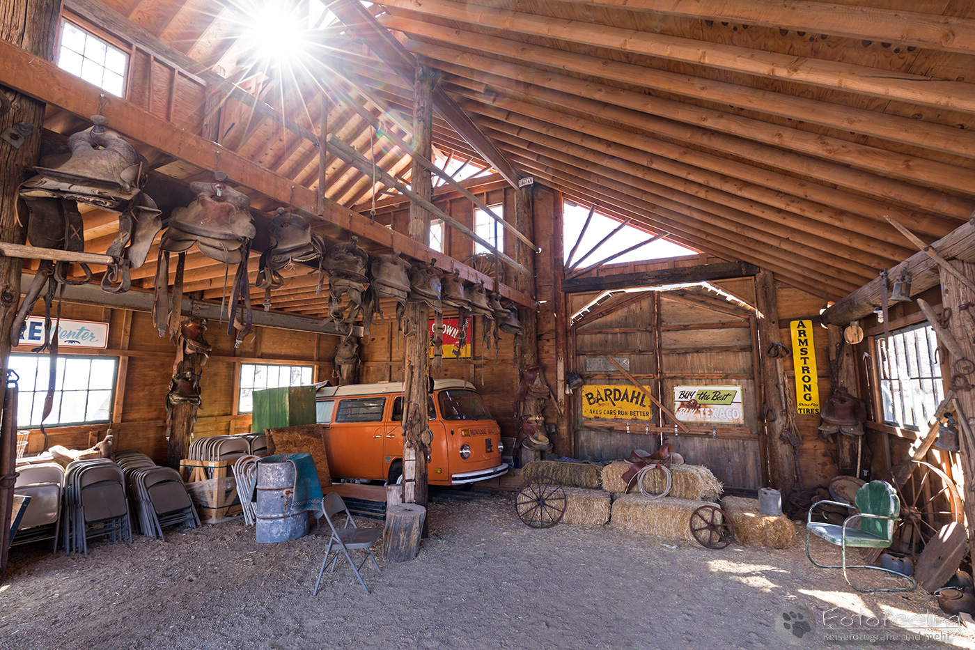Später fuhren wir noch zu den Mormonen Barns im Morgenlicht. Hier waren, wie schon erwartet, sehr viele Leute, aber das Licht war super schön und die Bäume in ihrem Herbstkleid fantastisch. Chris fotografierte noch einen riesigen Virginia Uhu, die es sich in einem Baum gemütlich gemacht hatte und auf die Nacht wartete.