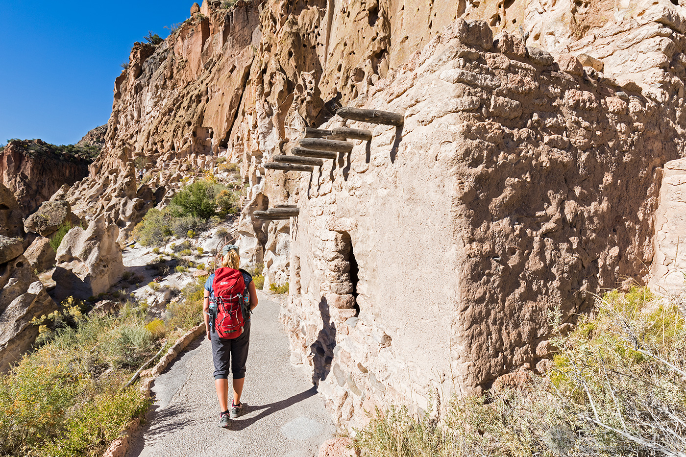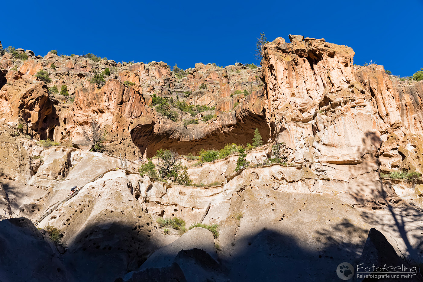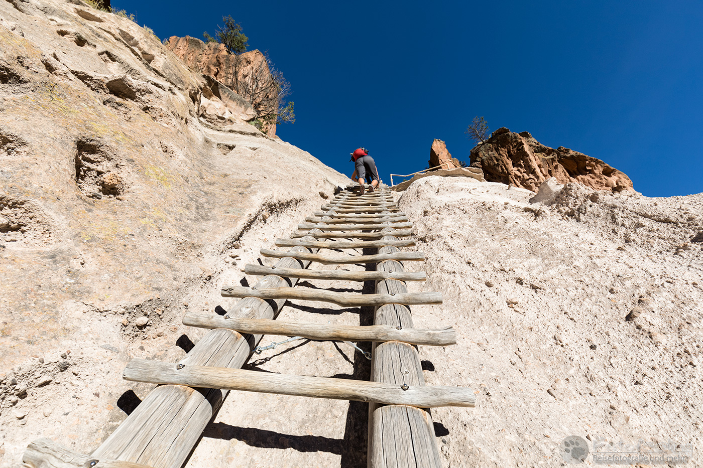Kaum war die Schranke offen, fuhren wir mit unserem Auto bis zum Parkplatz des Visitor Centers. Von hier aus kann man einen gut angelegten Weg folgen, der einen vorbei an der Big Kiva zum Tyuony House und weiter zu den Cliff Dwellings, dem Talus und dem Long House führt. Der Weg war klasse und vor allem die Felshäuser begeisterten uns. In einige durften wir über Leitern hinein klettern und uns kurz im kühlen Schatten der Häuser vor der gnadenlos brennenden Sonne schützen.
