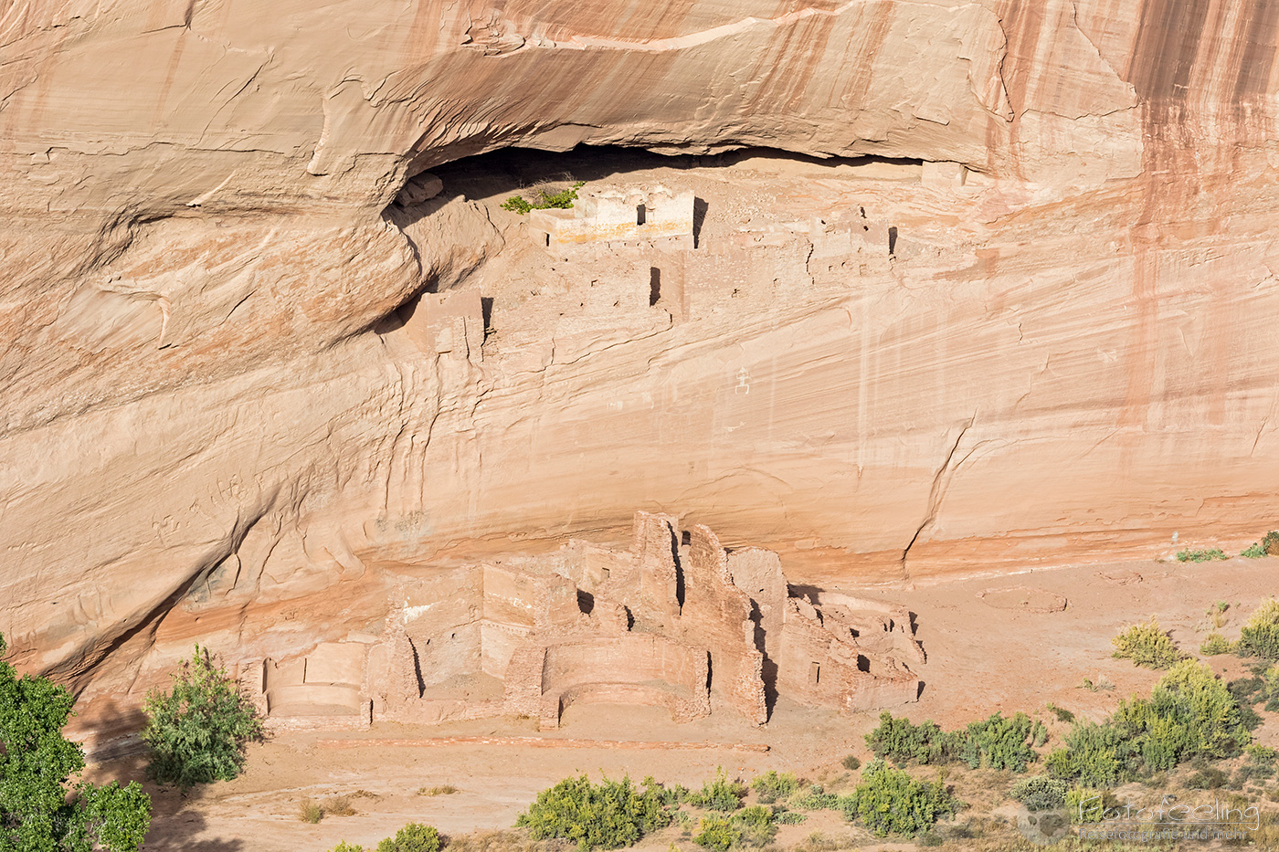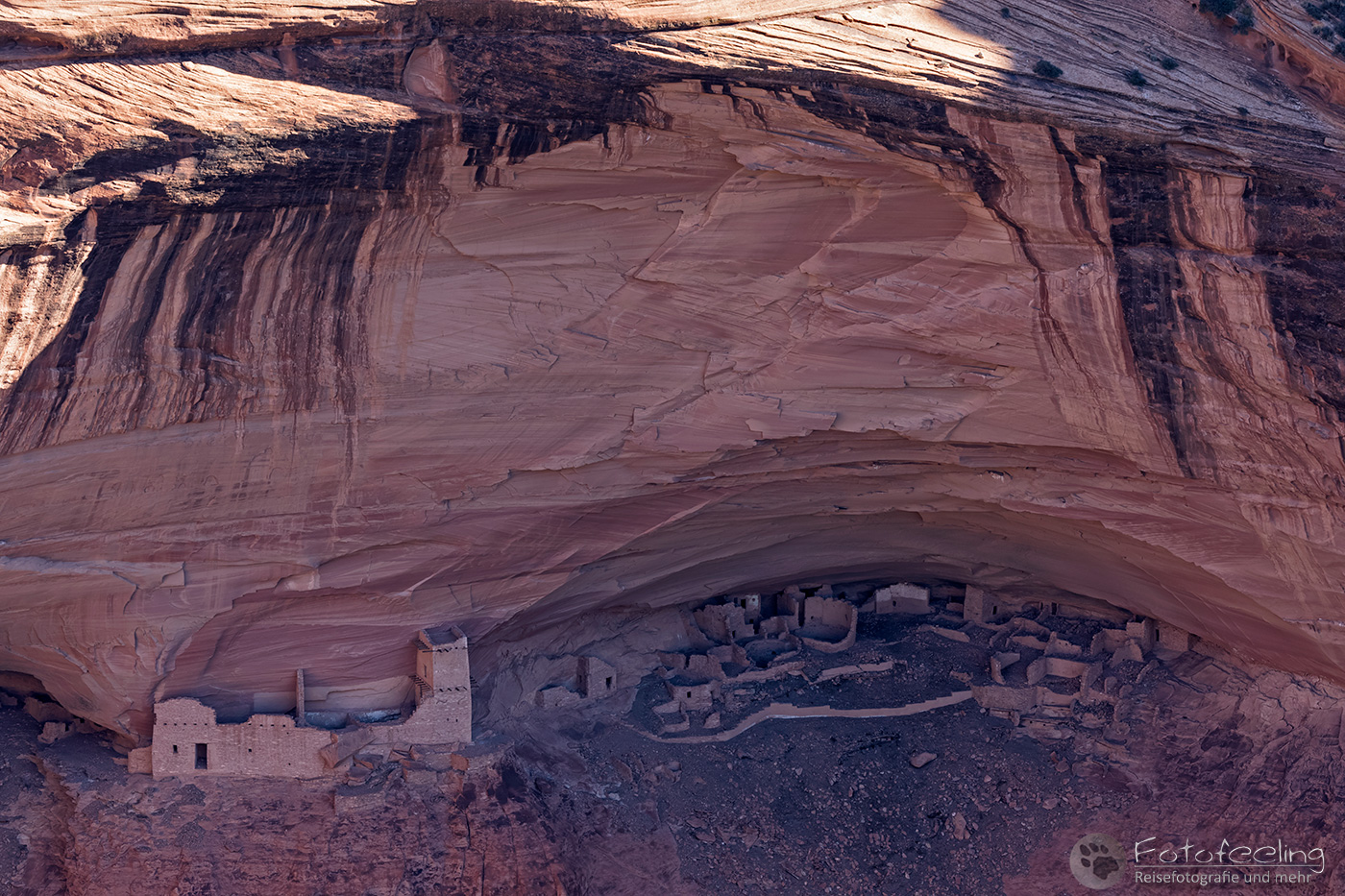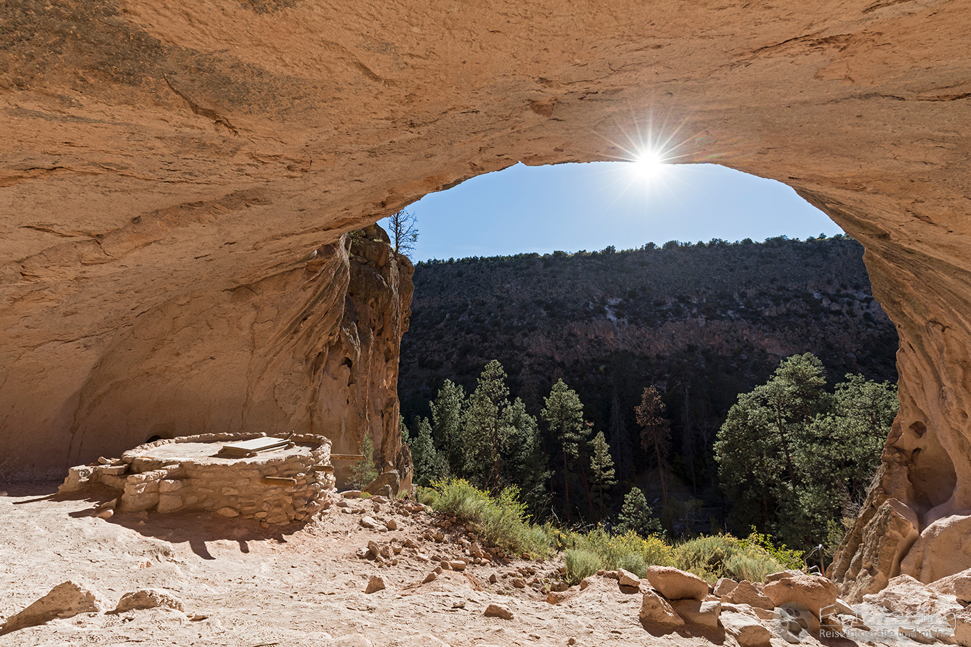 Kaum war die Schranke offen, fuhren wir mit unserem Auto bis zum Parkplatz des Visitor Centers. Von hier aus kann man einen gut angelegten Weg folgen, der einen vorbei an der Big Kiva zum Tyuony House und weiter zu den Cliff Dwellings, dem Talus und dem Long House führt. Der Weg war klasse und vor allem die Felshäuser begeisterten uns. In einige durften wir über Leitern hinein klettern und uns kurz im kühlen Schatten der Häuser vor der gnadenlos brennenden Sonne schützen.