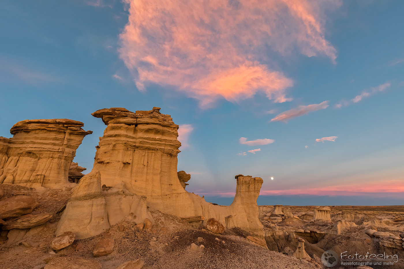 Wir standen schon 1,5 Stunden vor Sonnenaufgang auf und bauten unser Zelt ab. Die Dämmerung war wunderschön. Der Himmel hatte rosa Streifen, davor hoben sich fantastisch die weißen Dünen ab. Begeistert genossen wir das Schauspiel. Mit uns waren nur sehr wenige Menschen hier hinten und unsere Nachbarn hinter der nächsten Düne - zwei Mädels - verschliefen den farbenfrohen Morgen und damit die schönste Zeit des Tages.
