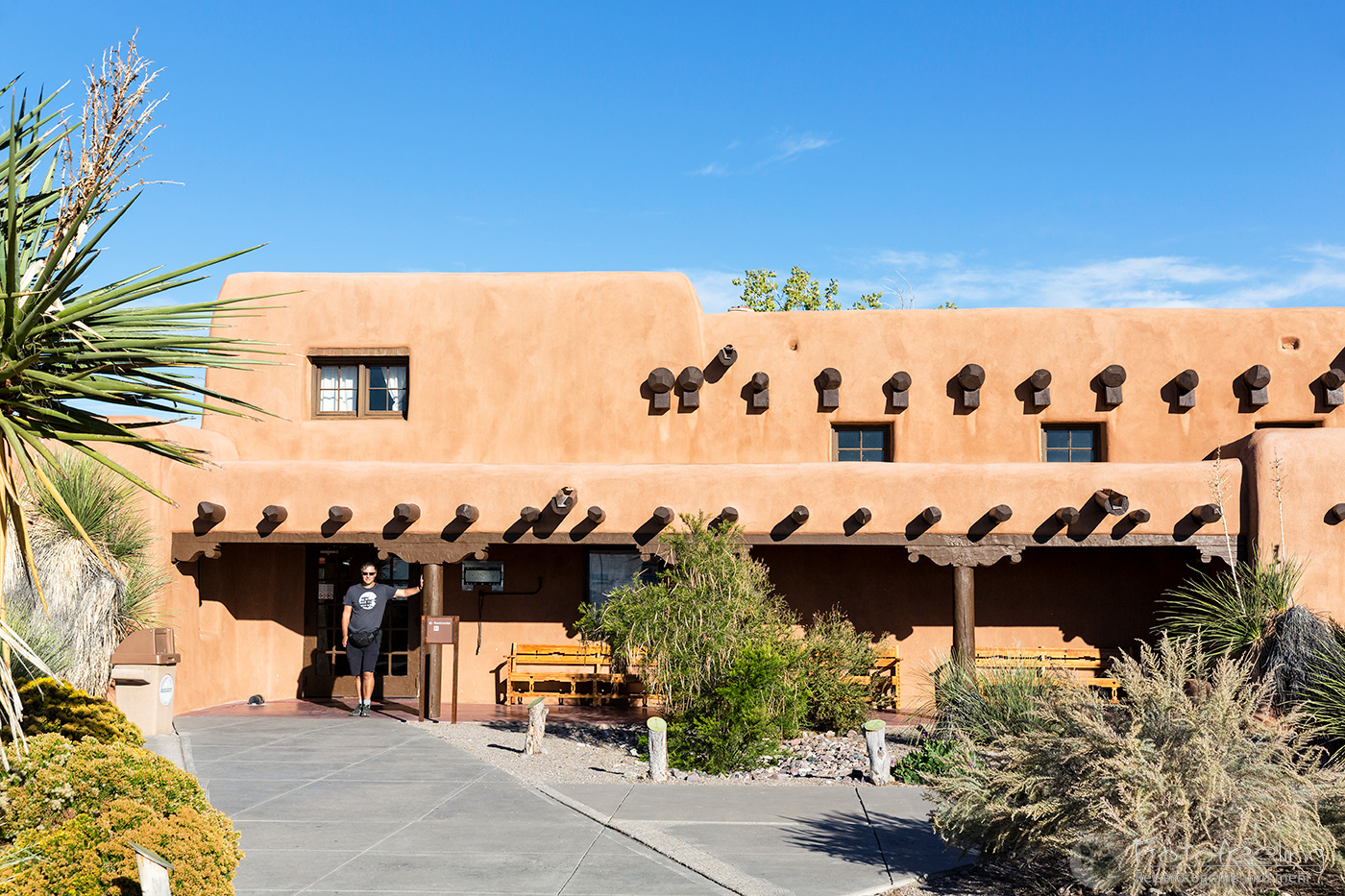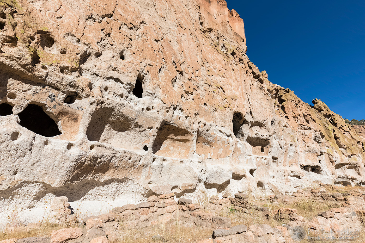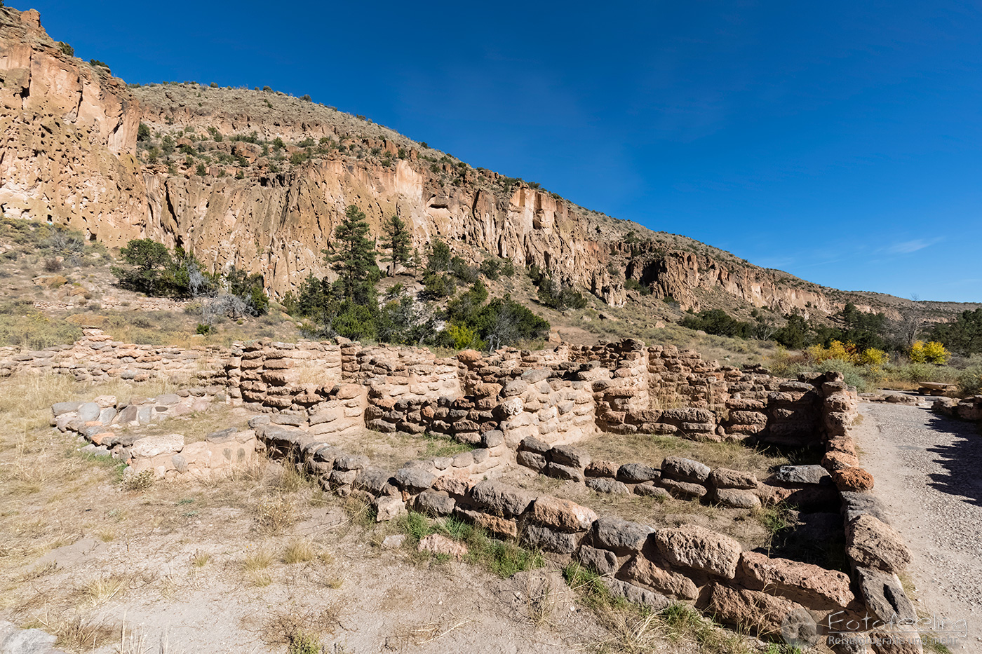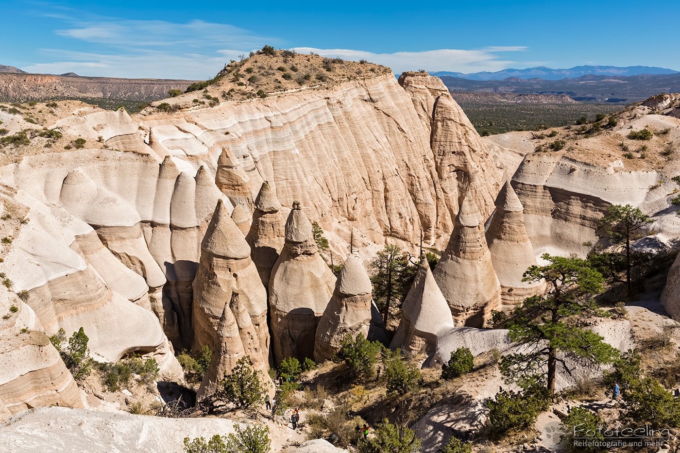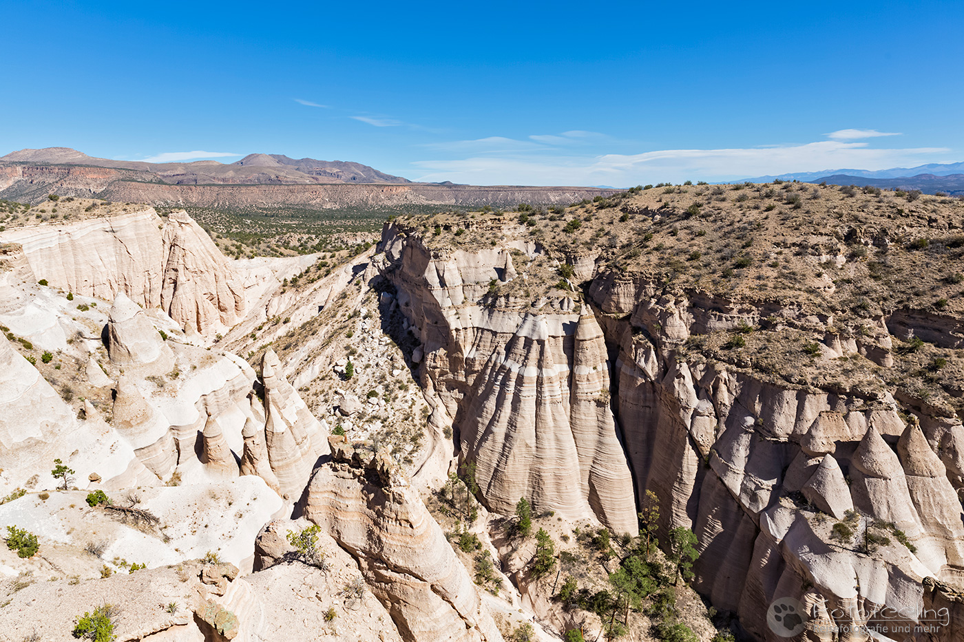 Das Gebiet wird durch Cochiti-Indianer verwaltet und teils bei besonderen Feierlichkeiten komplett für Außenstehende gesperrt. Wir zahlten 5 US$ Eintritt und durften passieren. Eine lange Straße brachte uns hinauf auf ein Plateau, von wo wir einen guten Rundumblick auf die „Zeltfelsen“ und die umliegenden Gebirgsketten der Jemez Mountains und Sangre de Cristo Mountains hatten.
