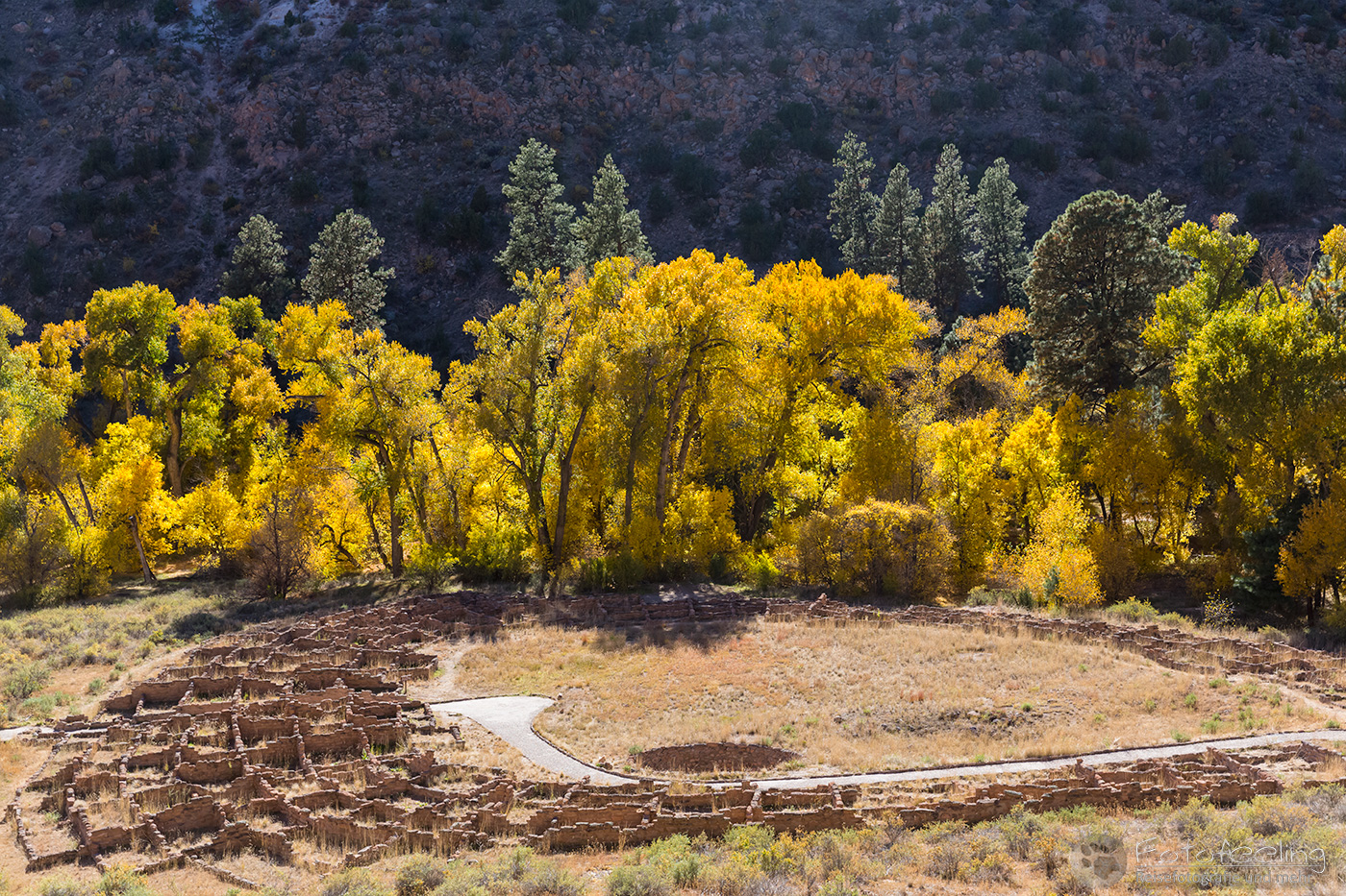 Die Hauptattraktion des National Monuments ist die Frijoles-Schlucht. Sie ist tagsüber nur mit Bussen zu befahren, aber von 15.00 – 19.00 Uhr wieder für den Verkehr geöffnet, auch morgens von 7.00 – 9.00 Uhr. Hier siedelten zwischen 1100 bis ca. 1550 die Vorläufer der Pueblo-Kultur. Es gibt über 1000 Siedlungsorte, im größten Tyuoyi Pueblo kann man das Gemeinschaftshaus und die Zeremonienhöhle (Kiva) anschauen. Im Süden liegt die Painted Cove, eine Höhle mit prähistorischen Petroglyphen.