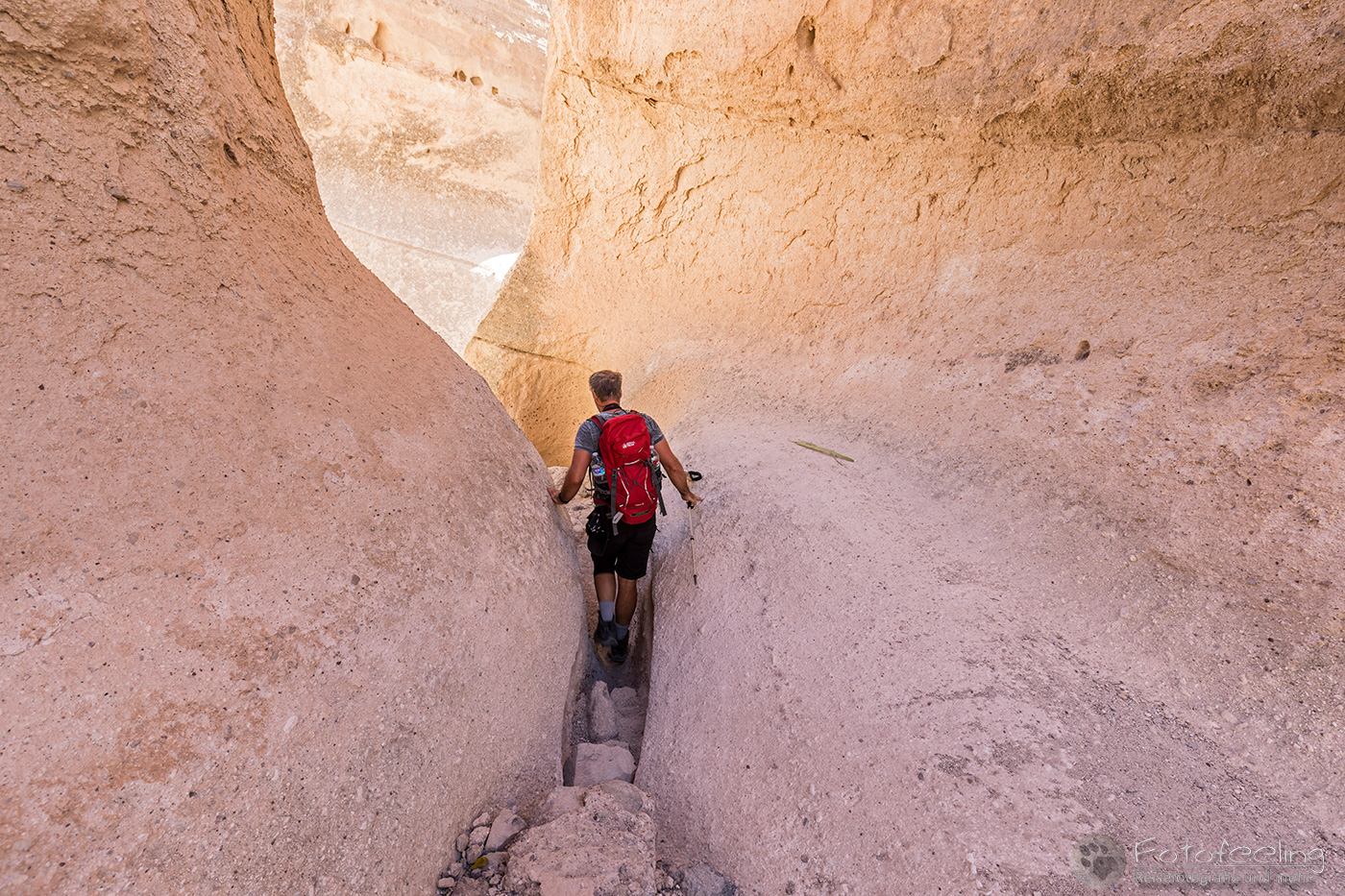 Danach fuhren wir auf den unteren Parkplatz und machten uns auf den Weg, das Gebiet zu erkunden. Wir gingen den ca. 2 km langen Rundweg bis zum Anfang eines Slot Canyons. Ab hier führte ein unbefestigter Weg durch den Canyon auf ein Plateau hinauf. Der Weg war toll und machte richtig Spaß. Stellenweise war der Slot Canyon sehr eng, um sich dann wieder zu weiten und den Blick auf die fetzigen Felsen freizugeben. Mittendrinn wuchsen Bäume und immer wieder kamen einigen Klettereinlagen. So erreichten wir 40 Minuten später langsam, aber sicher das Plateau. Von hier oben hatten wir einen guten Blick in das Tal mit seinen Felsen, die wie versteinerte Tipis aussahen. Wir gingen noch einen schmalen Weg, der uns noch einmal einen guten Einblick in den Slot Canyon erlaubte. Hier oben war es sehr windig, so dass wir uns bald wieder auf den Rückweg machten.